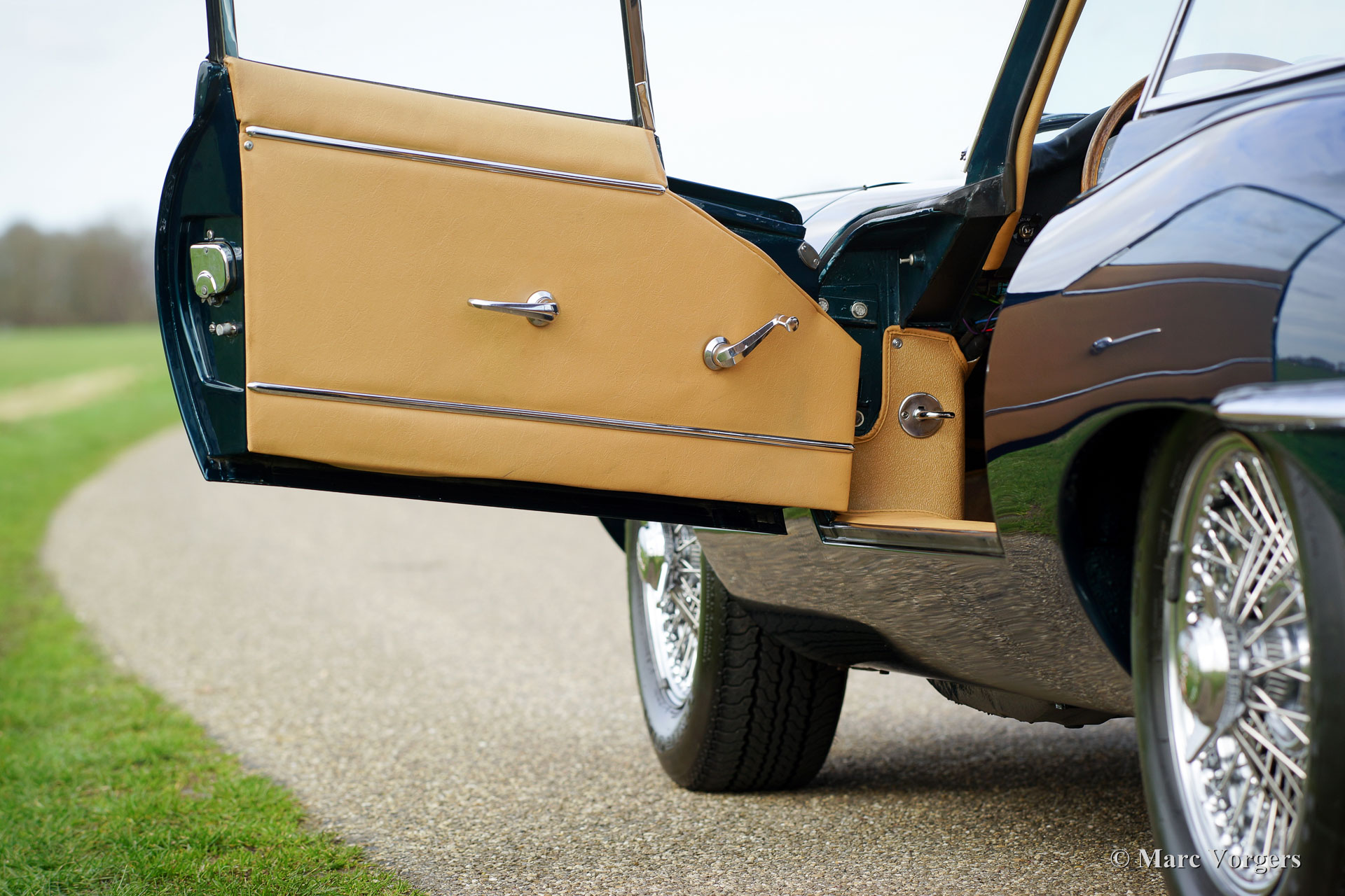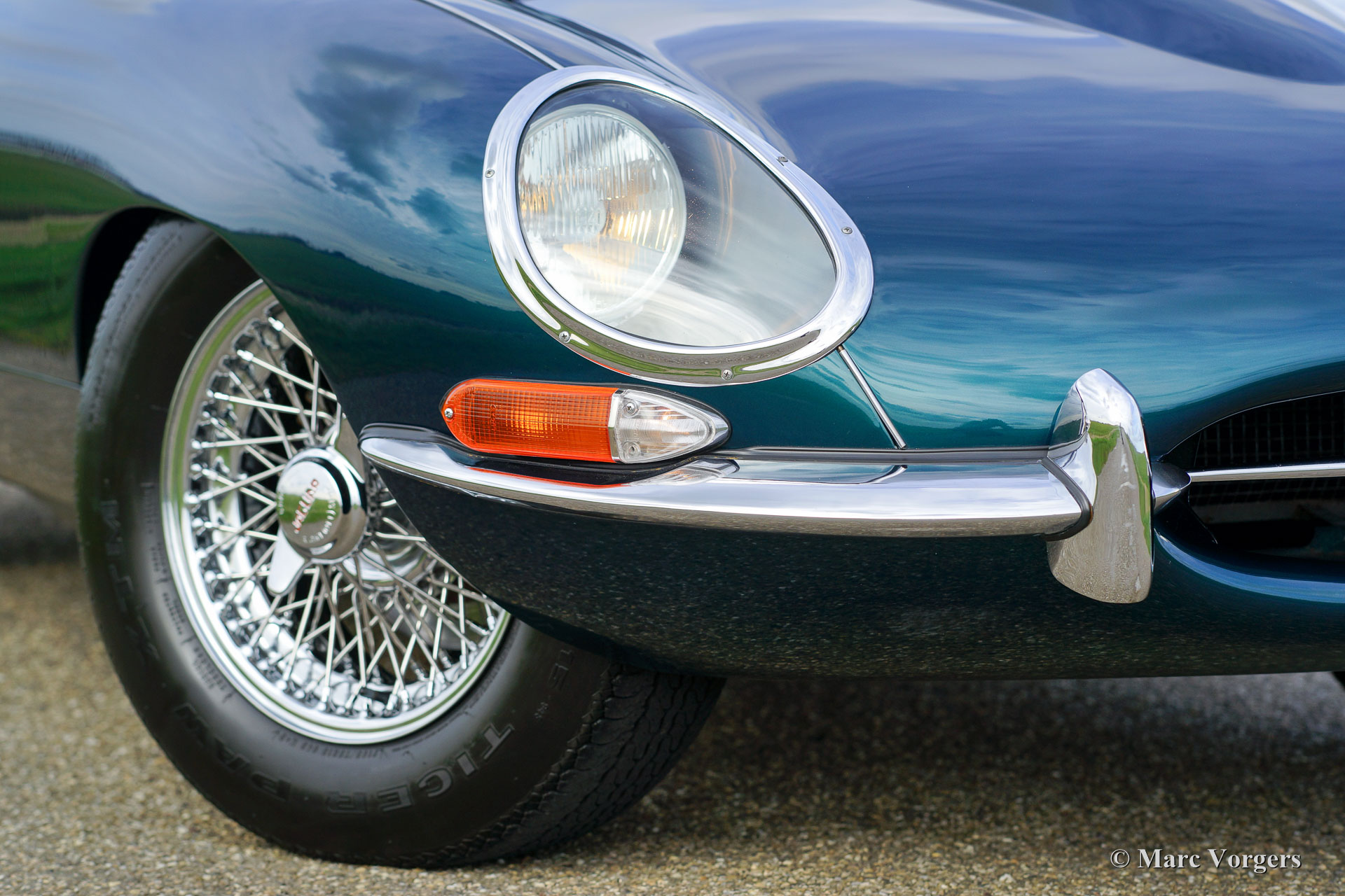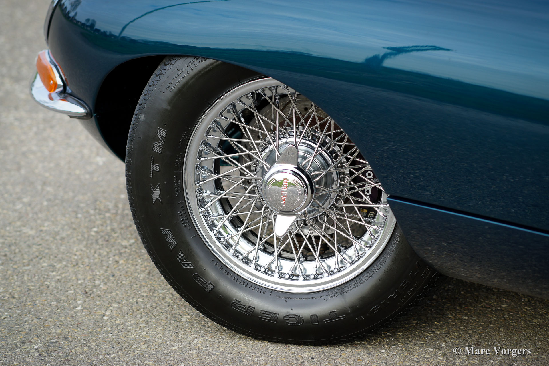 Jaguar E-type 3.8 litre FHC series 1, year (27 February) 1962. Colour green metallic (with a beautiful blueish cast) and a beige (tan) leather interior. This magnificent Jaguar E-type is in excellent to superb condition and the car drives perfectly! The bodywork shows a perfect panel fit and the metallic paint gives this fine series 1 E-type a wonderful appearance. The body (VIN) and engine numbers are matching, a Heritage certificate is present. This Jaguar XK-E features a 5-speed Getrag manually operated gearbox, chrome wire wheels, original MotoLita steering wheel, Stainless Steel exhaust and electronic ignition.