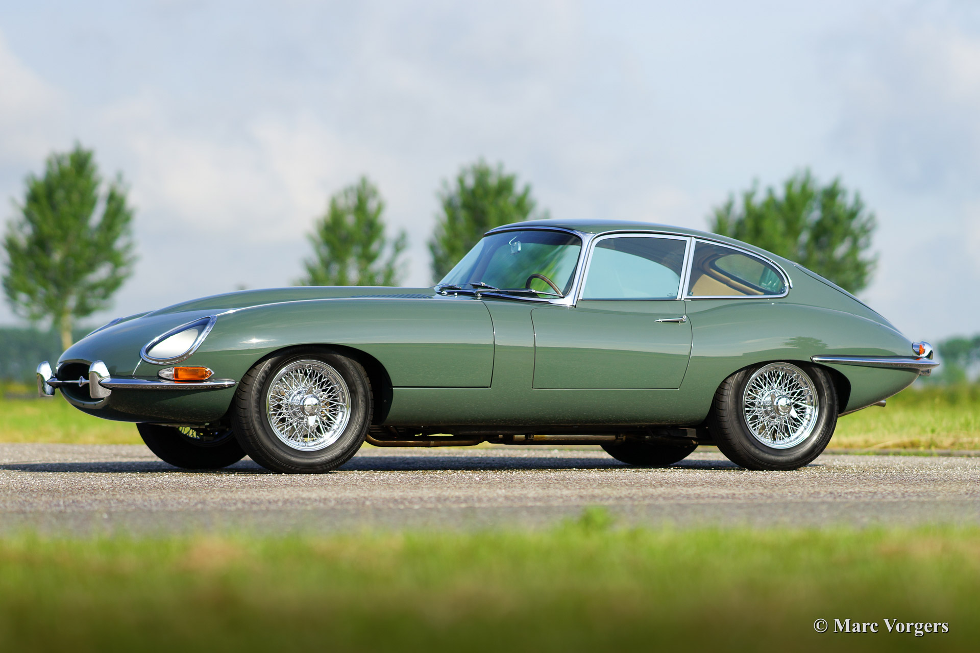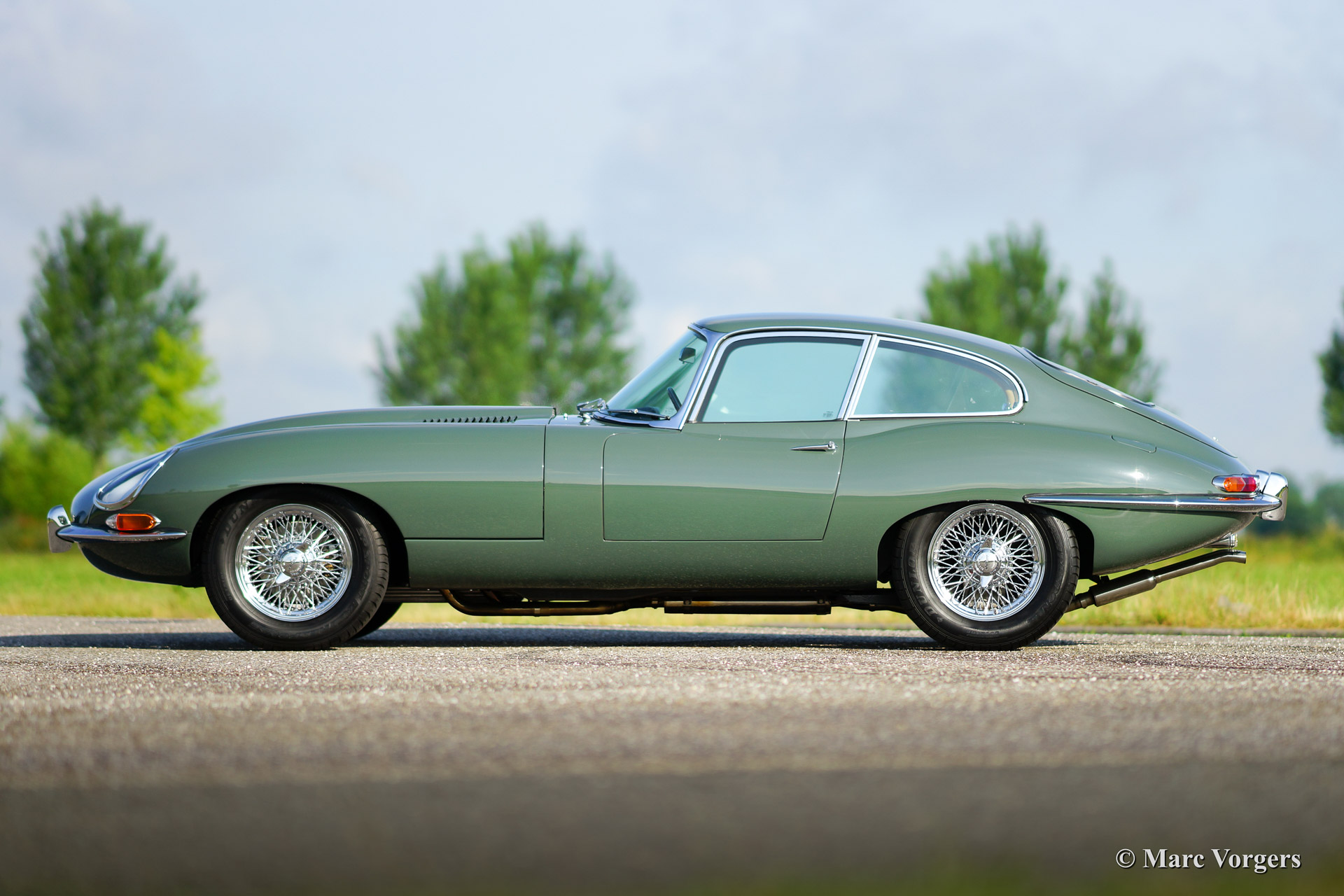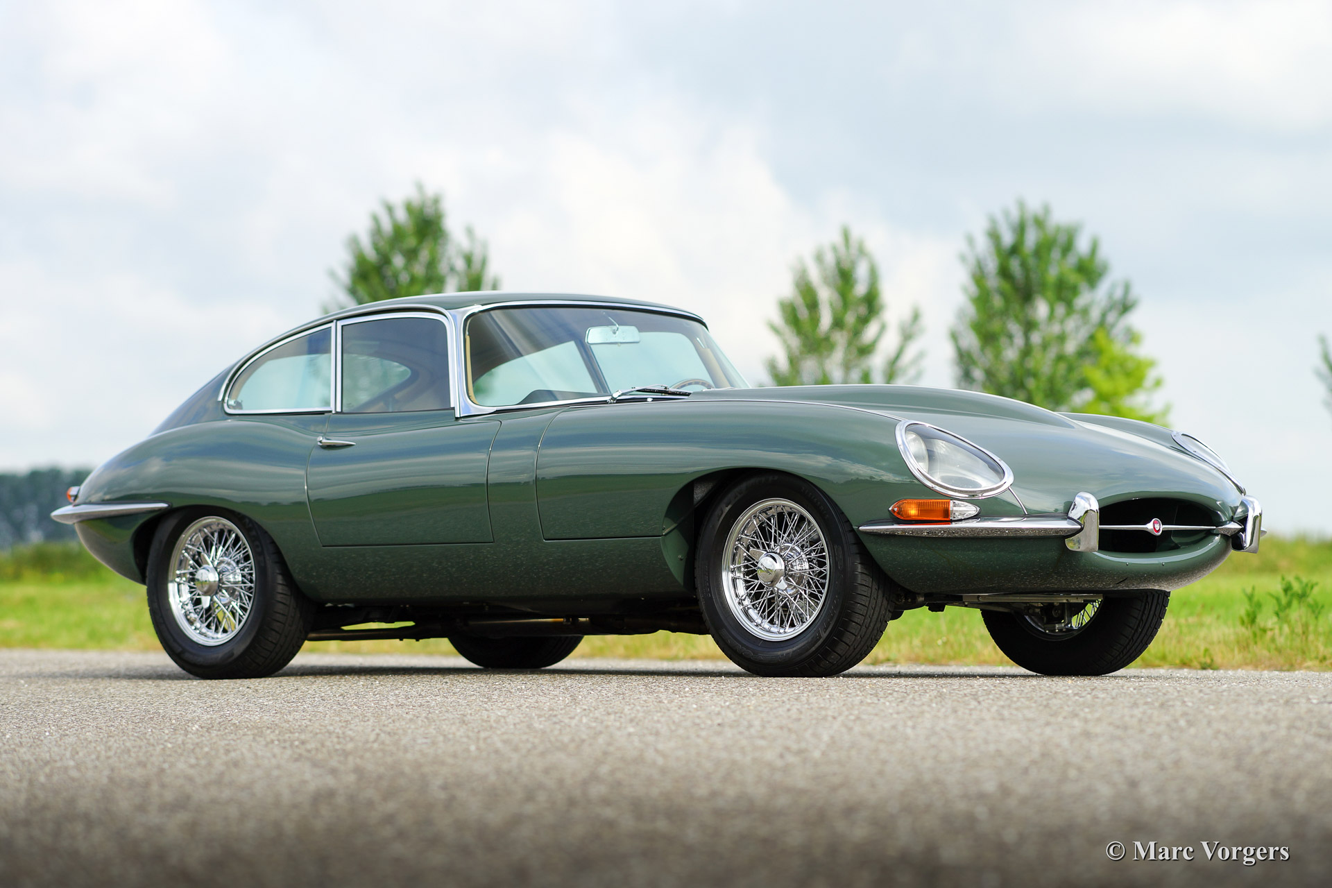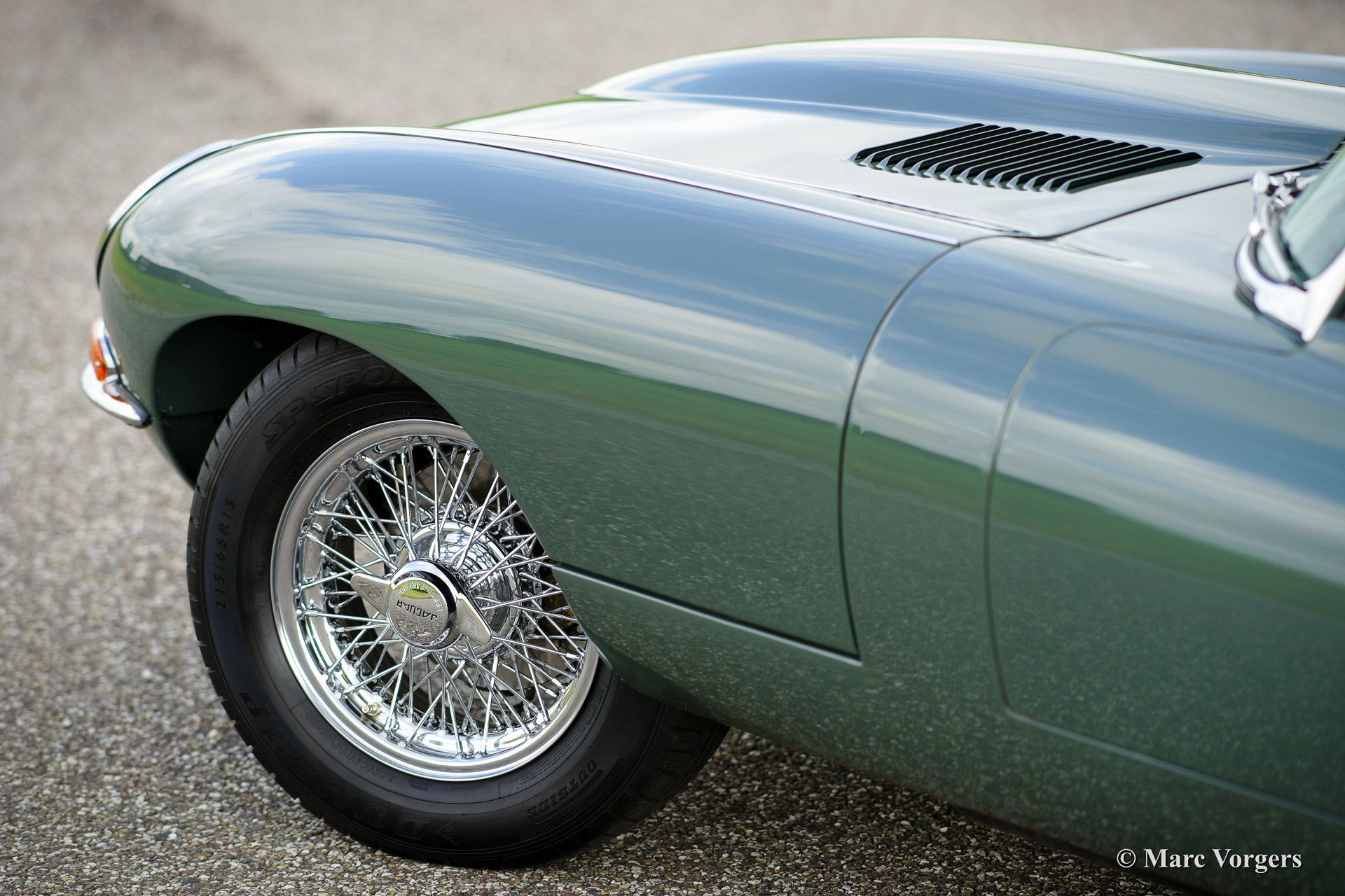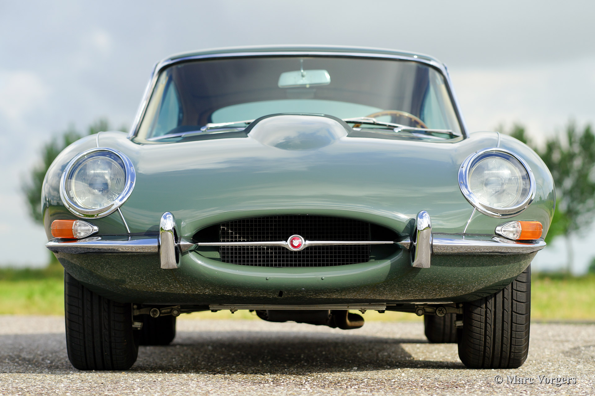 The design of the E-Type series as it was introduced in 1961 is of almost unearthly beauty. Look at all the refined details: the bonnet, the headlights, the back lights, the recess for the wheel housing and the back side, and you will realize that you are looking at absolute, timeless beauty in automobile design.