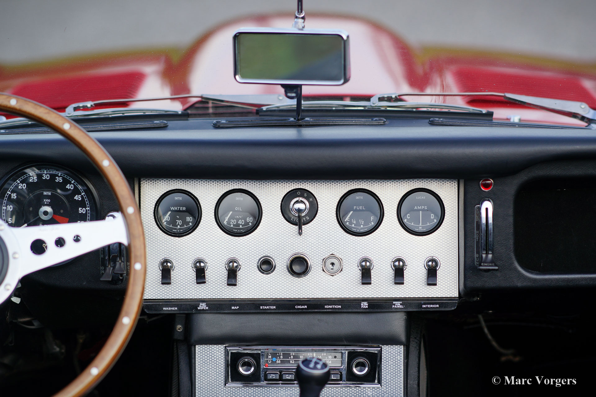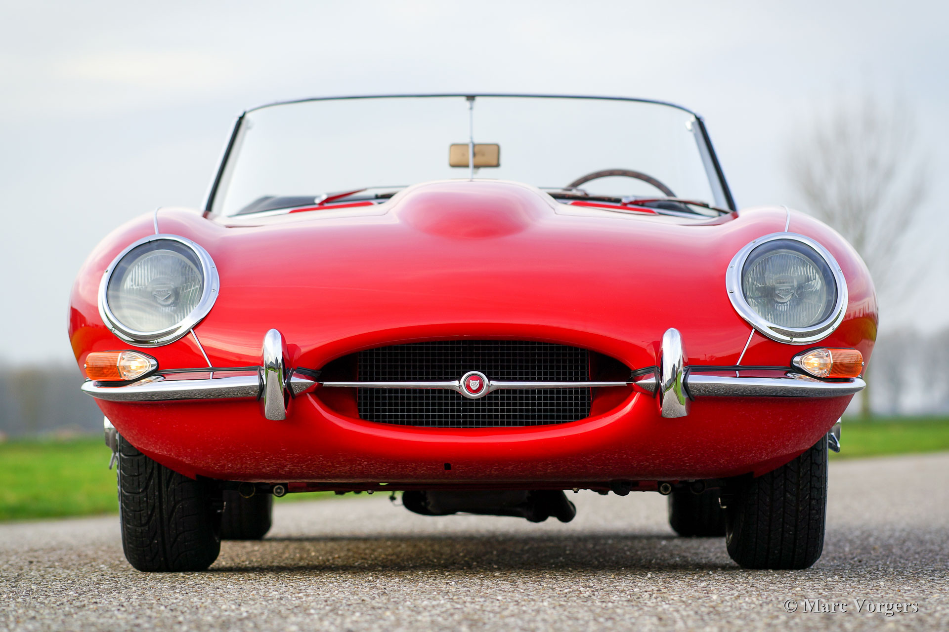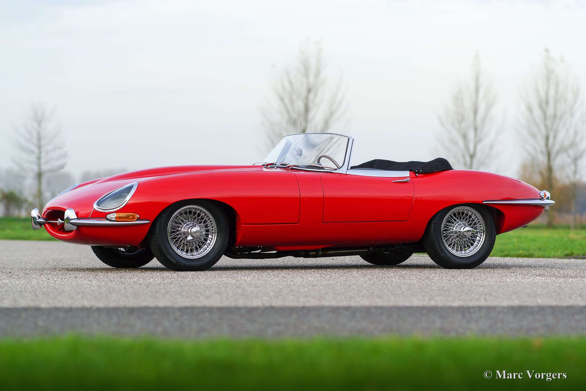 Jaguar E-type 3.8 Litre OTS, year 1962. Colour red with a black leather interior and black carpet. Black mohair soft top and hood cover. This magnificent Jaguar E-type comes from the sought after first series with the glass covered head lamps, the interior with aluminium panels and the very sporty 3.8 Litre XK-engine. This beautiful Jaguar E-type was sold new on 16 November 1962 in New York USA. A Heritage certificate is present. This gorgeous Jaguar E-type roadster was extensively restored in the past; the car is in excellent to superb condition!