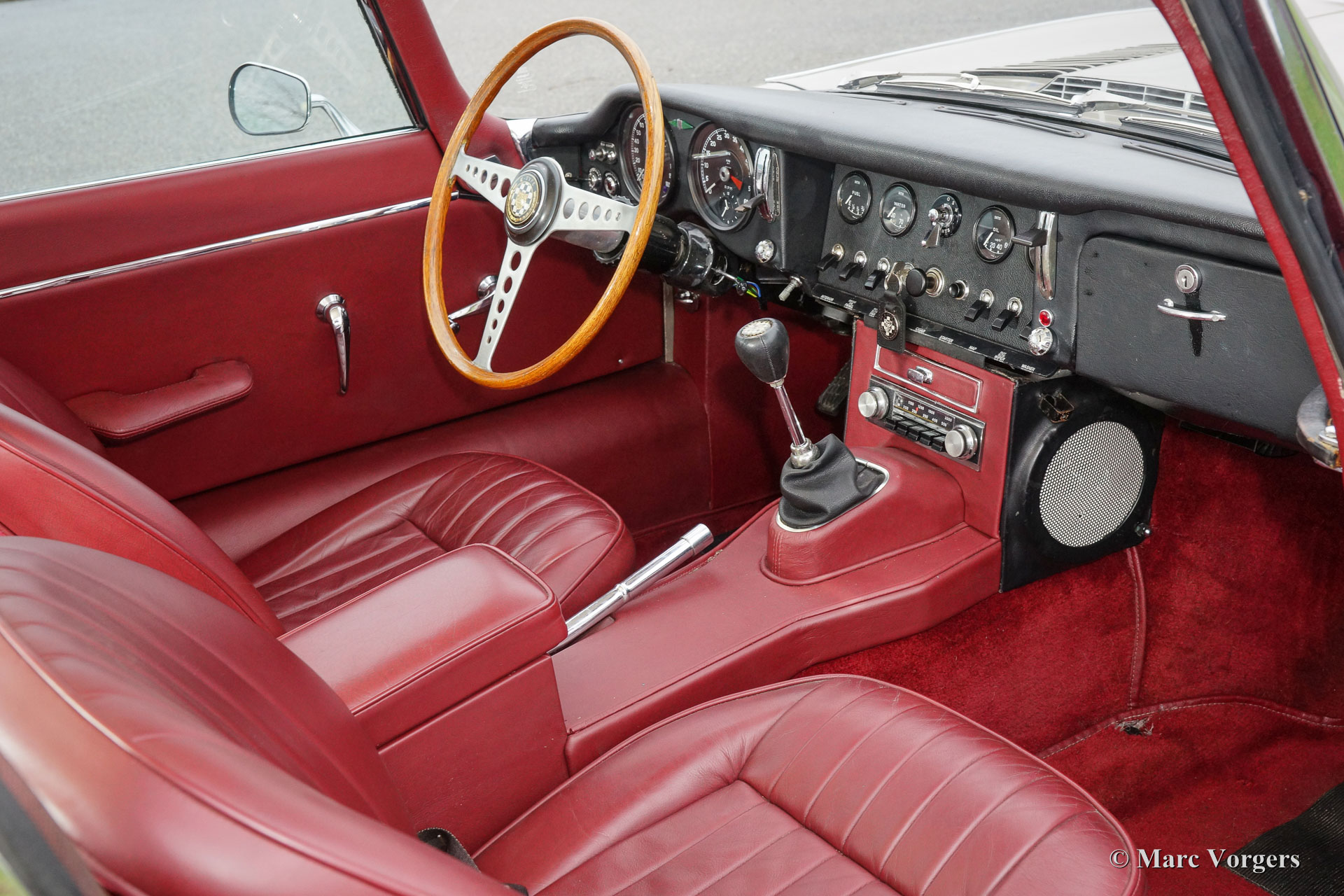 Jaguar E-type 4.2 Litre 2+2 series 1½ FHC, year 1967. Chassis number 1E508XX, engine number 7E5310X-X; ‘matching numbers‘. Colour Golden Sand metallic with a dark red leather interior. This beautiful Jaguar E-type Fixed Head Coupe is a rather rare 1½ series model. This model was built over a period of one year from late 1967 until late 1968. Thru the 1½ series the Jaguar E-type made the transition from series 1 to series 2. This model looks exactly the same as the series 1 2+2 FHC except for the open headlamps which clearly distinguish this rare model. This Jaguar E-type is in very good condition with a few signs of use like some little dimples. The Jaguar has been maintained very well. Recently the cylinder head was overhauled and an aluminium radiator was fitted. The car features a manually operated gearbox, chrome wire wheels, Pirelli 205/70-15 tyres, a high torque starter motor, a Stainless Steel exhaust system and a classic radio. This Jaguar E-type drives perfectly!