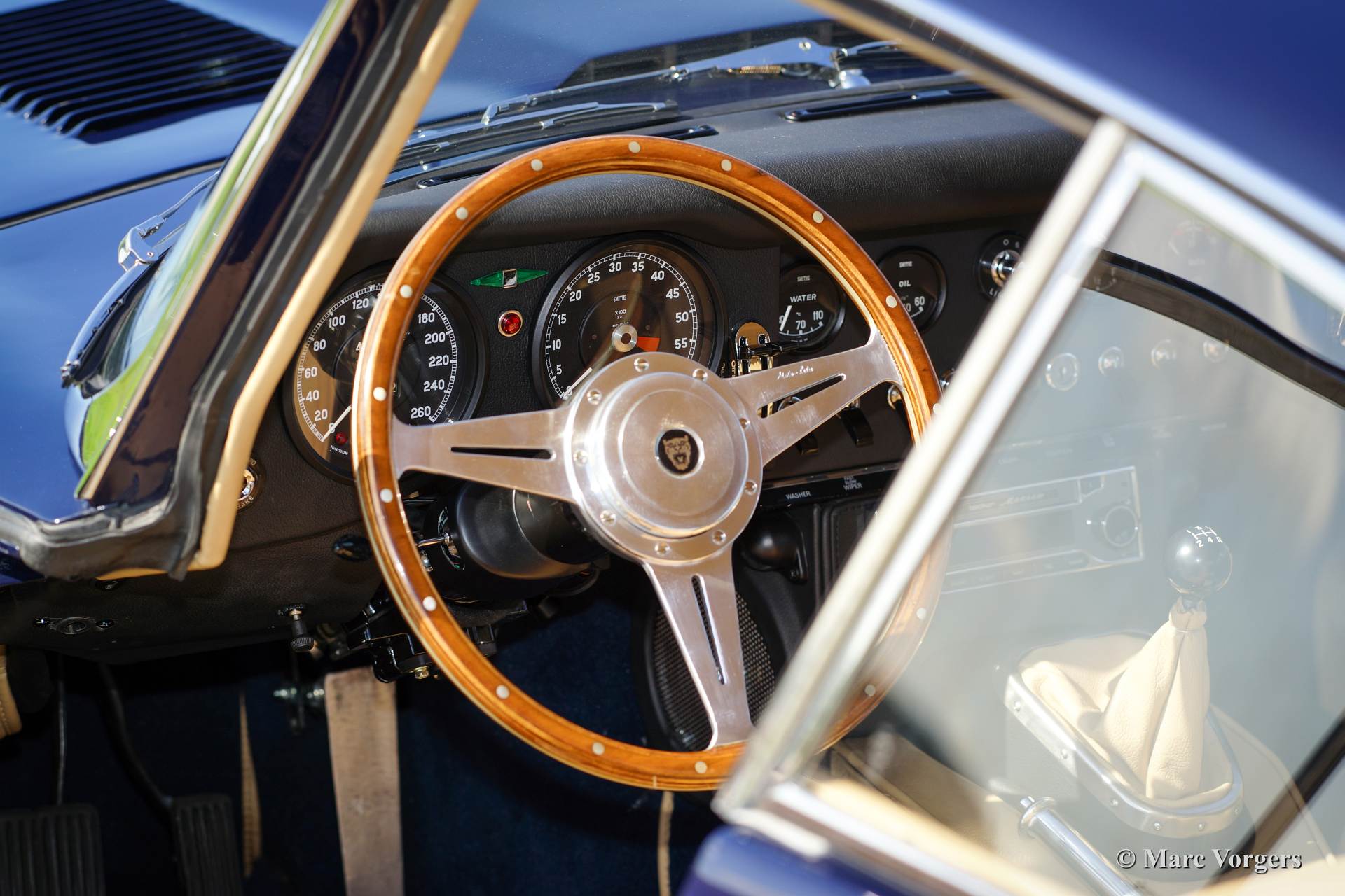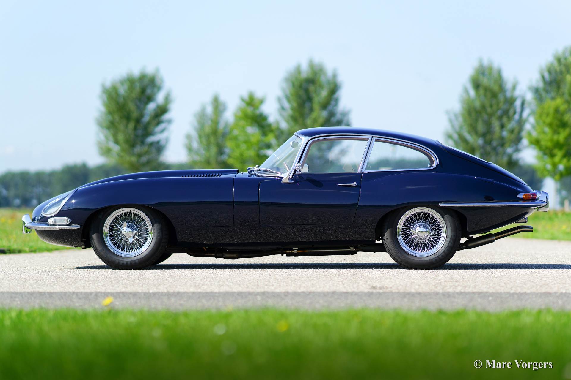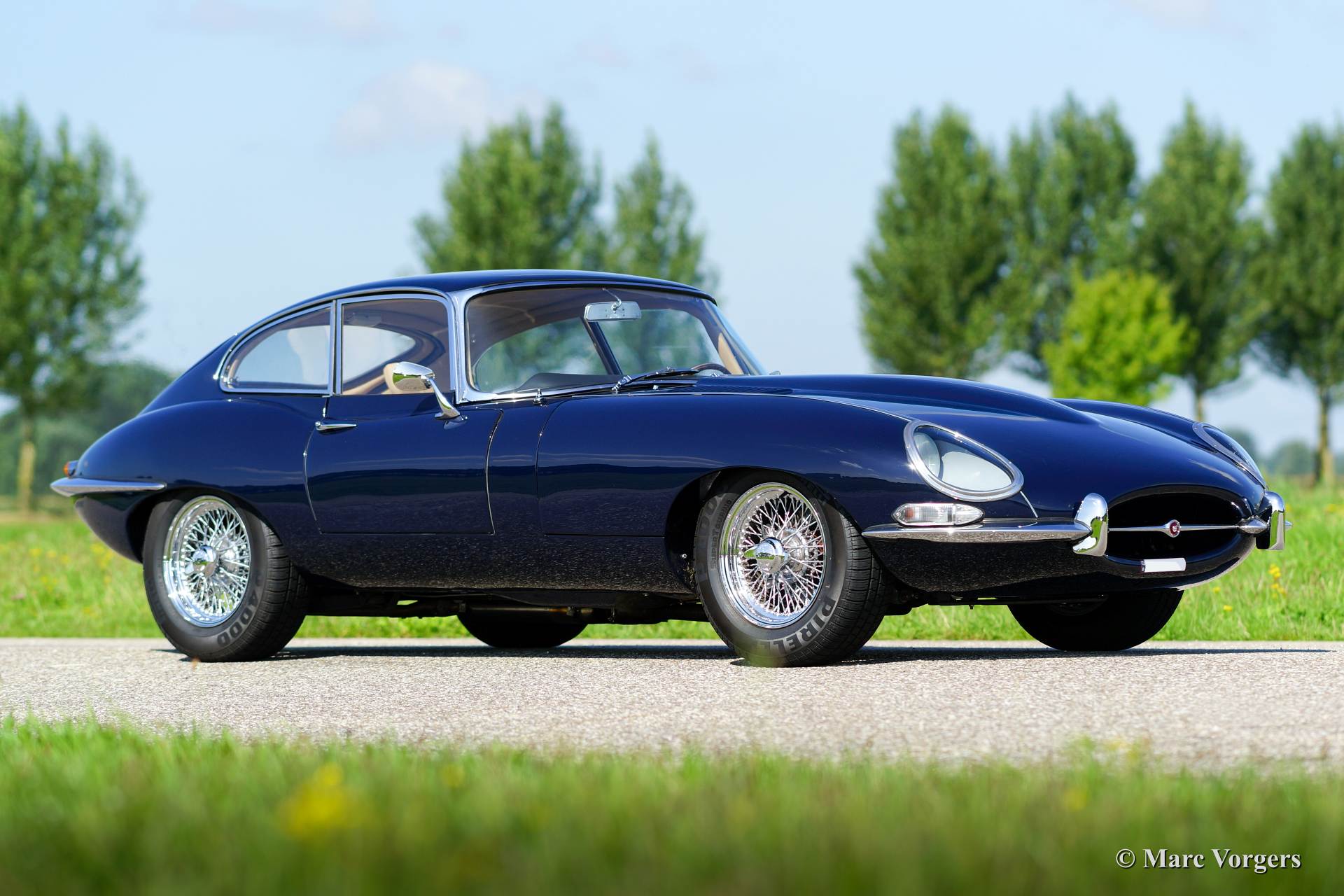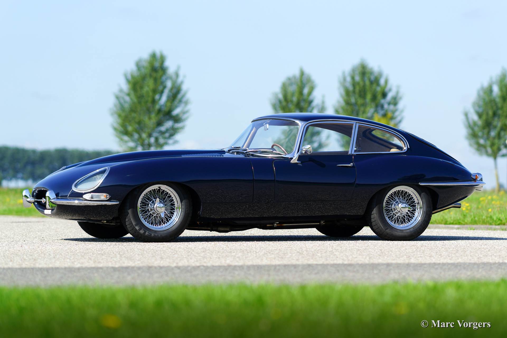 Jaguar E-type 4.2 Litre FHC, year 1966. Colour dark blue with a beige leather interior. This magnificent Jaguar E-type Fixed Head Coupe (FHC) was extensively and beautifully restored by a restoration firm in the Netherlands in the years 2011 – 2014. An extensive photo reportage of the restoration is present. The engine was overhauled by the renowned firm of van Giersbergen. The brake-system was up-rated and made more powerful. This gorgeous Jaguar E-type Coupe is in superb TOP condition! The chassis number and the engine number have ‘matching numbers’, a Heritage certificate which confirms this is present. This fabulous Jaguar features a Getrag 5-speed manual gearbox, new chrome wire wheels with Michelin tyres, a Moto-Lita sports steering wheel with wood rim and a Stainless-Steel exhaust. This E-type drives perfectly, a TOP specimen!