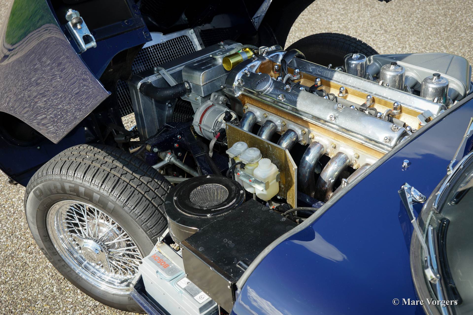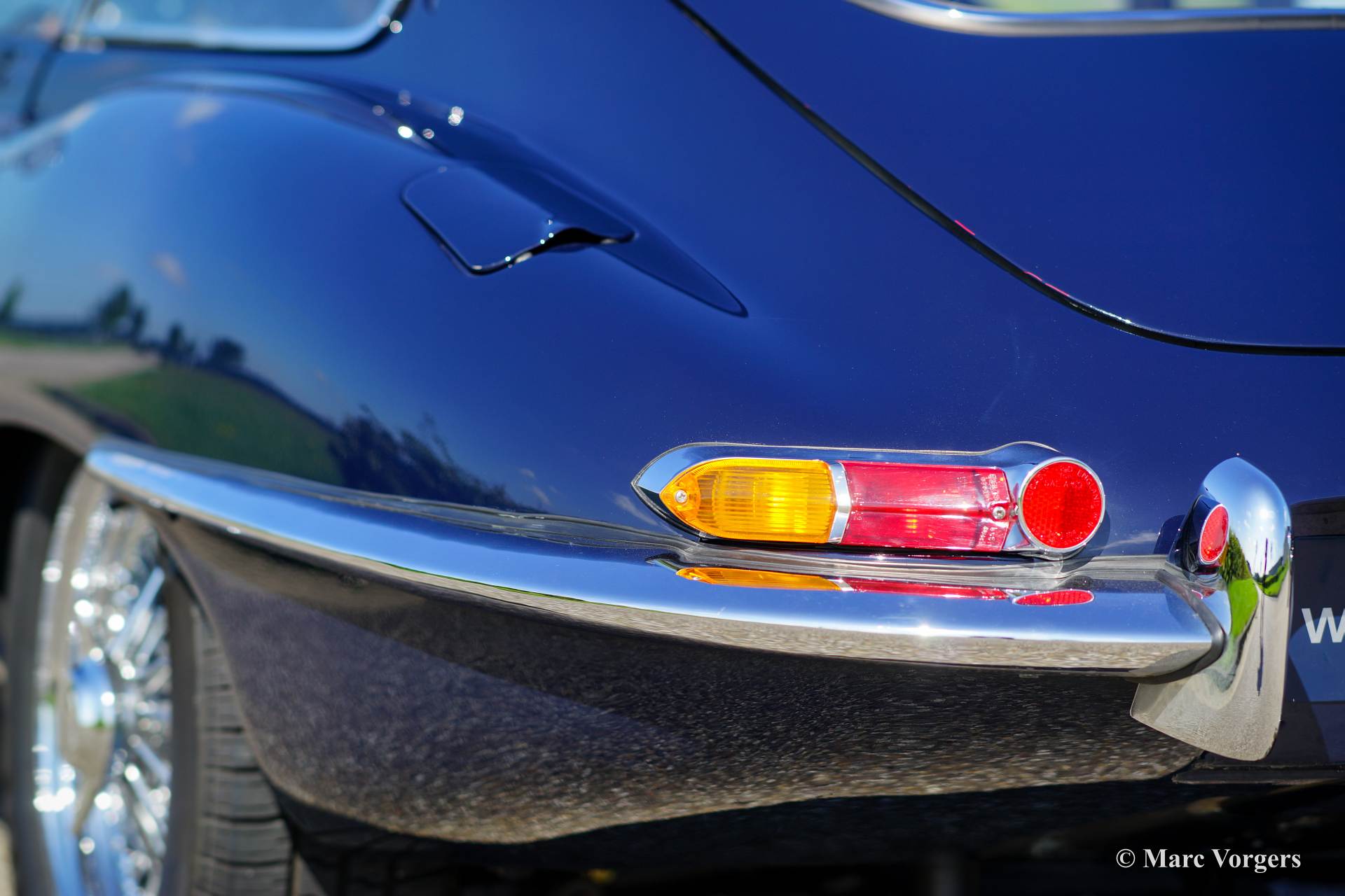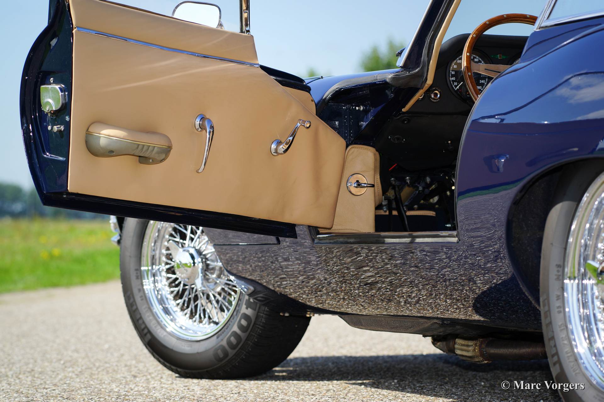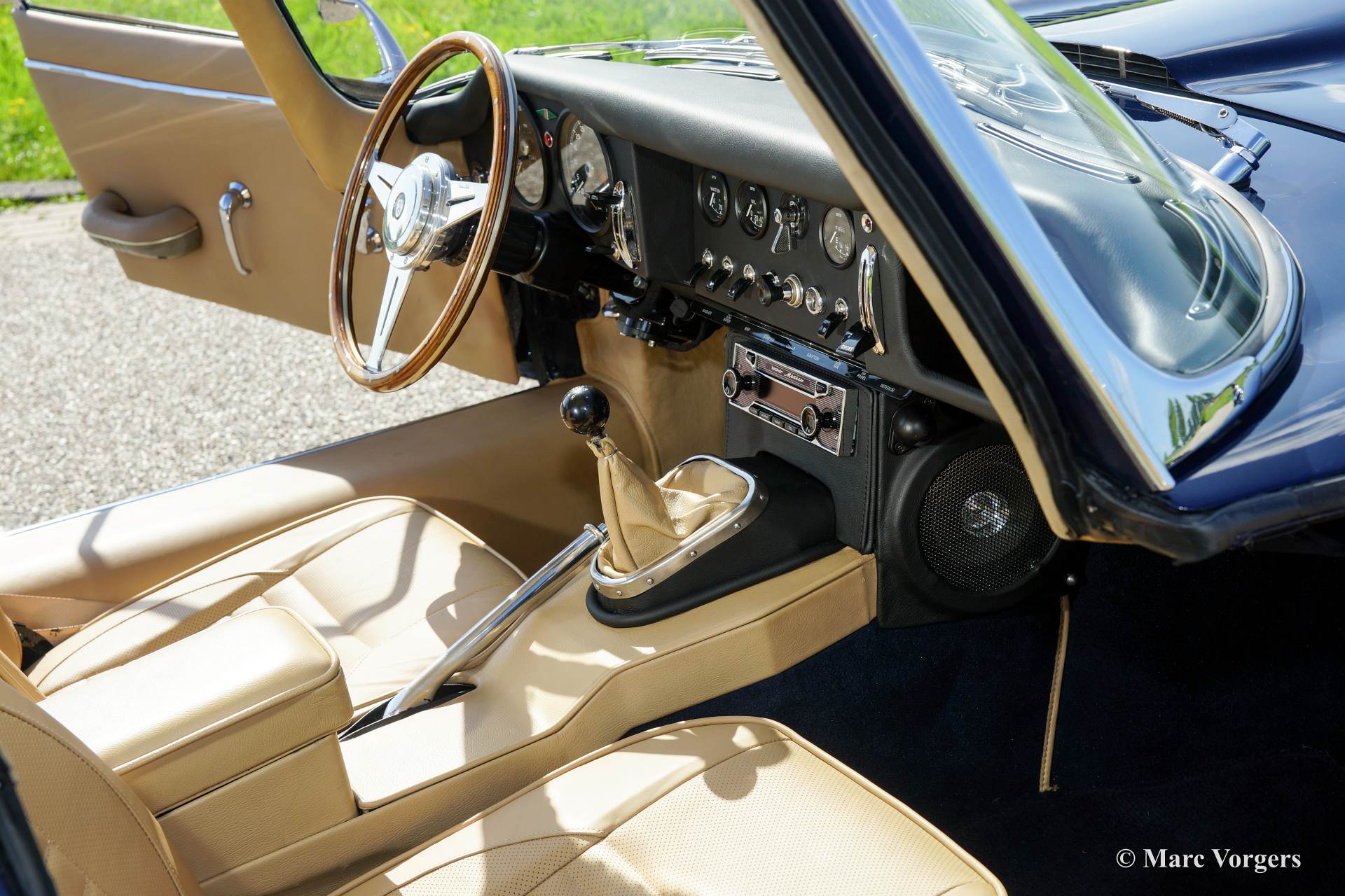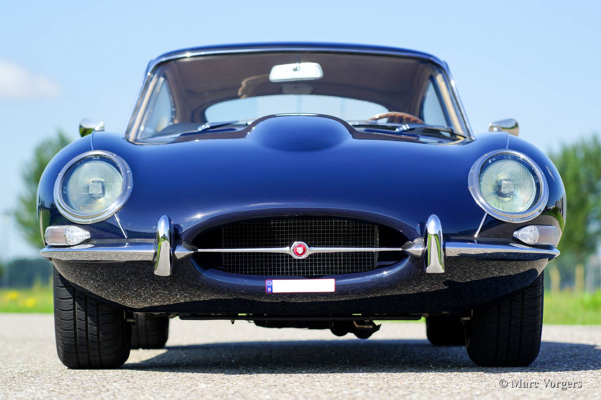Jaguar E-type 4.2 Litre FHC, year 1966. Colour dark blue with a beige leather interior. This magnificent Jaguar E-type Fixed Head Coupe (FHC) was extensively and beautifully restored by a restoration firm in the Netherlands in the years 2011 – 2014. An extensive photo reportage of the restoration is present. The engine was overhauled by the renowned firm of van Giersbergen. The brake-system was up-rated and made more powerful. This gorgeous Jaguar E-type Coupe is in superb TOP condition! The chassis number and the engine number have ‘matching numbers’, a Heritage certificate which confirms this is present. This fabulous Jaguar features a Getrag 5-speed manual gearbox, new chrome wire wheels with Michelin tyres, a Moto-Lita sports steering wheel with wood rim and a Stainless-Steel exhaust. This E-type drives perfectly, a TOP specimen!