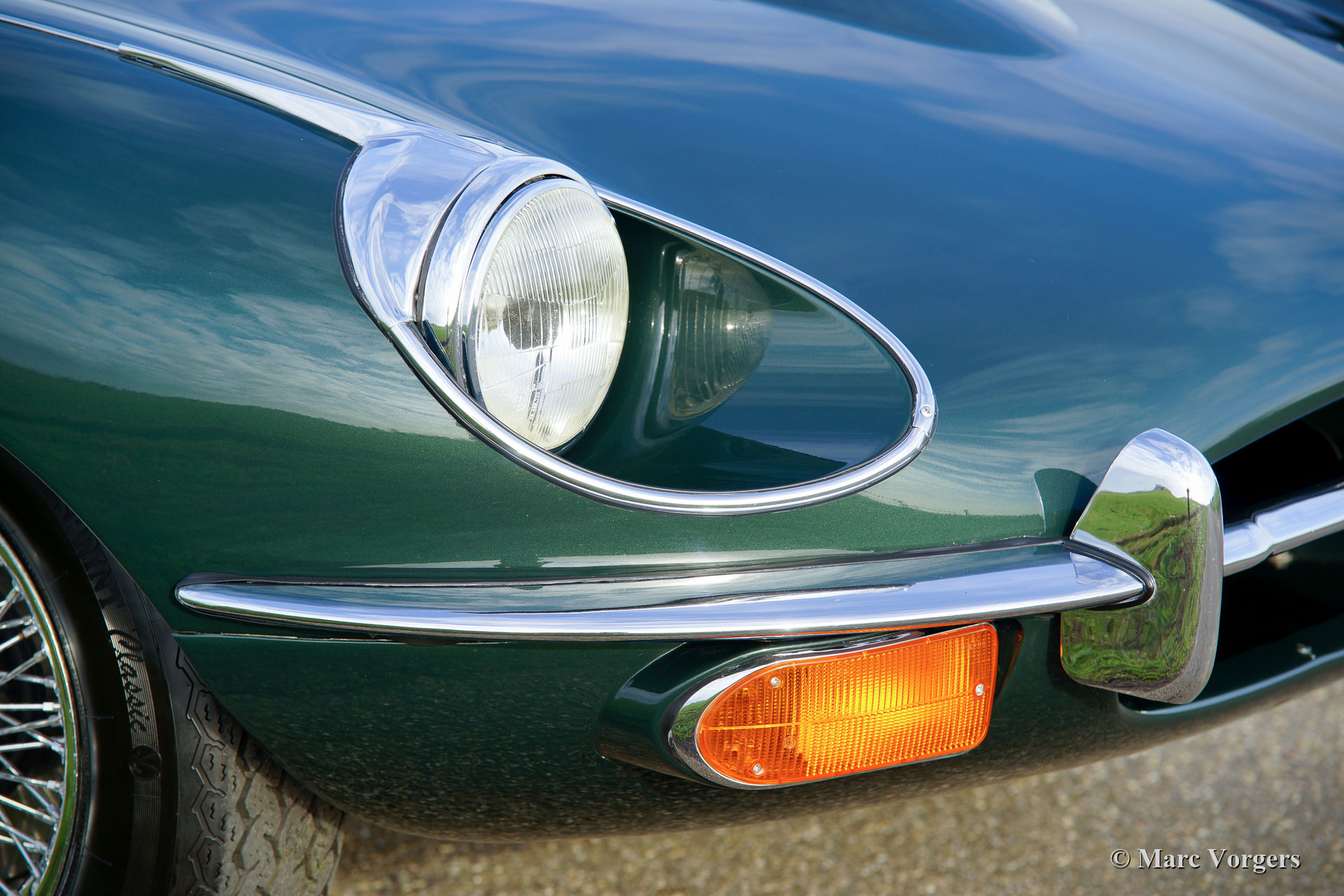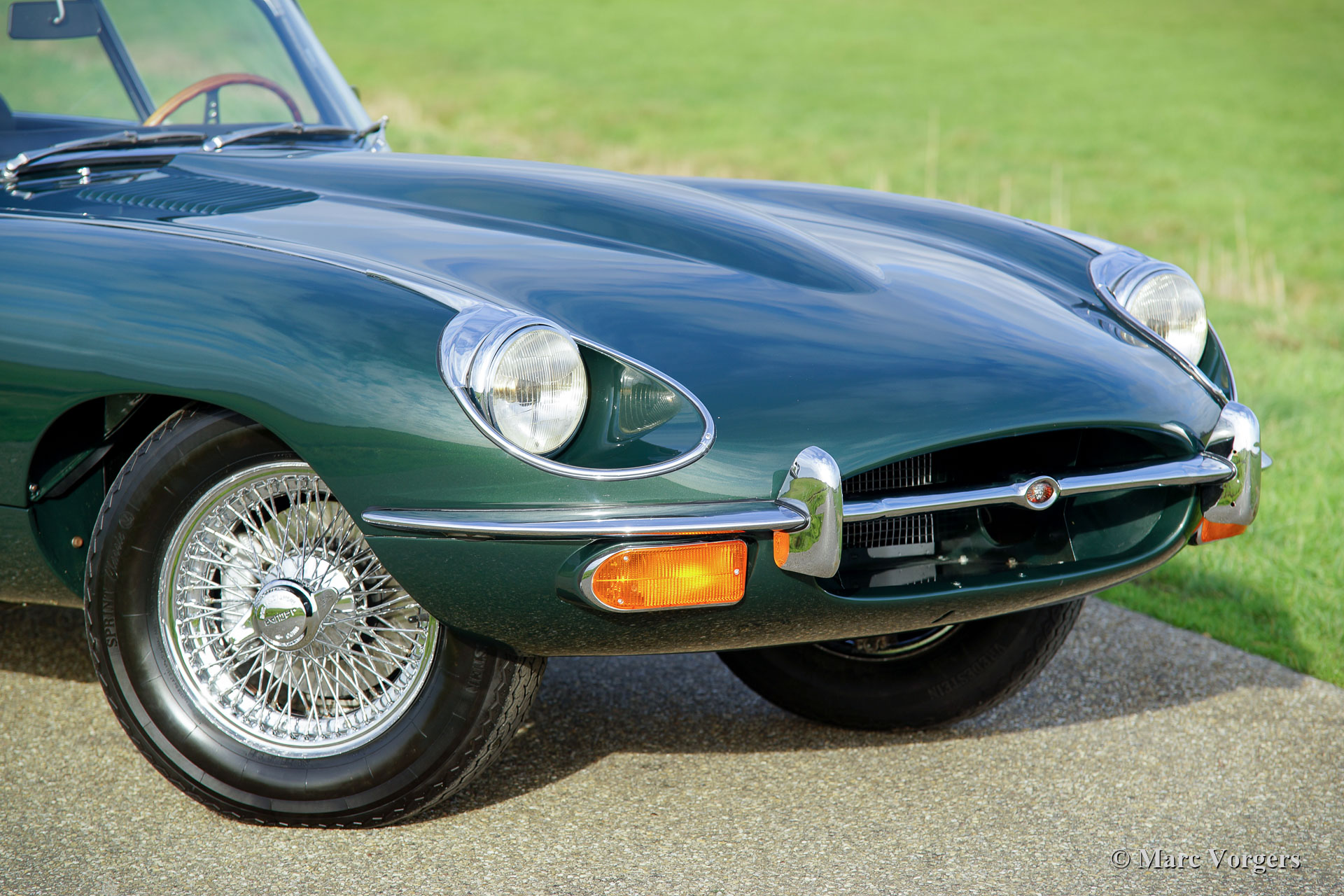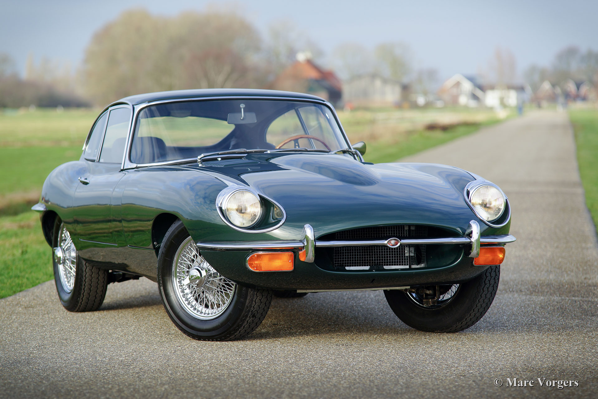 Jaguar E-type 4.2 Litre FHC, year 1969. Full matching numbers, a Heritage certificate to confirm this is present. Colour Opalescent British Racing Green (metallic) combined with a black leather interior. This fantastic Jaguar E-type series 2 Fixed Head Coupe (FHC) was fully and perfectly restored in the Netherlands in the years 2016-2018. The body was restored from the bare metal up. The bodywork shows a perfect panel fit, crisp lines and superb 2K paint! Mechanically the car was extensively restored and overhauled; the engine, gearbox, rear-axle, cooling, brakes and suspension were fully rebuilt. The car features chrome wire wheels and a Stainless-Steel exhaust system. Since completion of the restoration this fine e-type has driven only 1250 kilometres! This car is in superb top condition (concours) and it comes with its original tool-box. A top-notch specimen!
