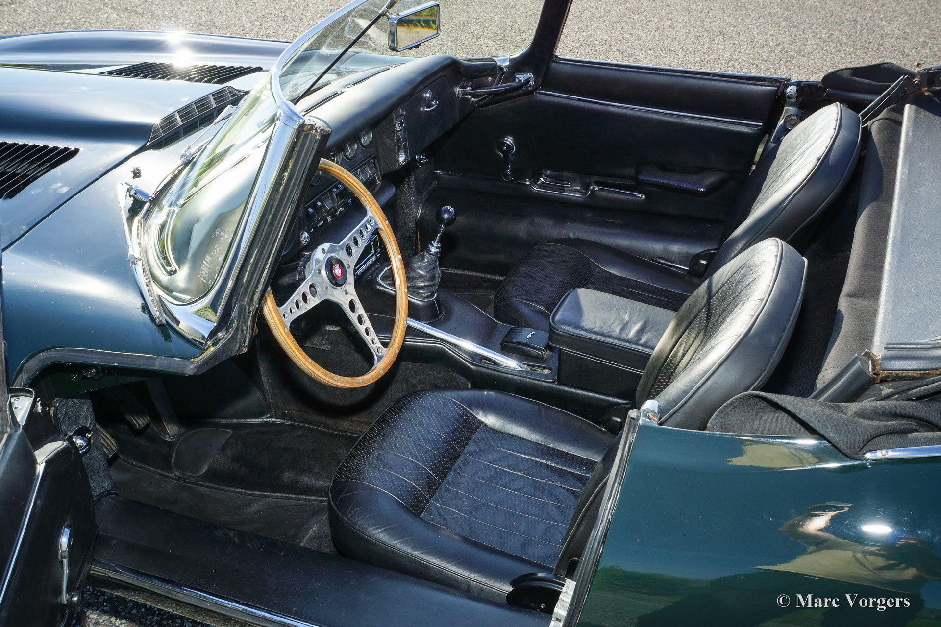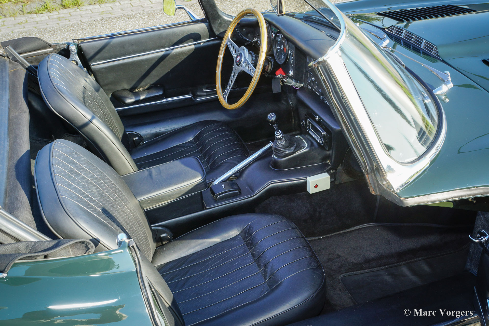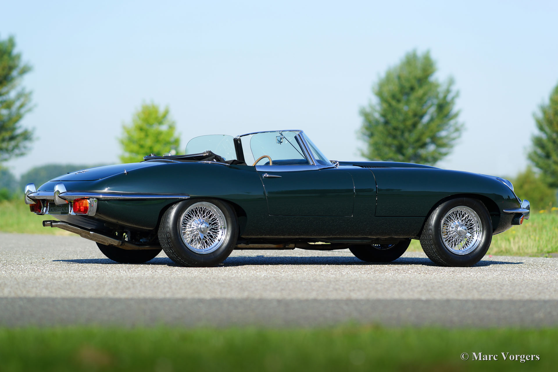 Jaguar E-type 4.2 Litre OTS series 2, year 1970. Colour British Racing Green with a black leather interior and black carpet. Black mohair soft-top and hood cover. This mighty Jaguar E-type 4.2 Litre Open Two Seater (OTS), also named roadster), was extensively and ‘body-off’ restored in the past. More recently the car was given perfect new paint commissioned by Lex Classics. Photos of this partial restoration are present. This beautiful Jaguar E-type has been cherished by one owner for 25 years; the car is in excellent to superb condition! The automobile features wide chrome wire wheels, chrome ‘knock-off’ wheel nuts, a trip master and radio with antenna. A gorgeous E-type and a wonderful driver car!