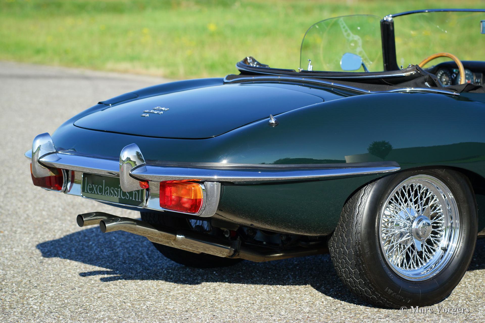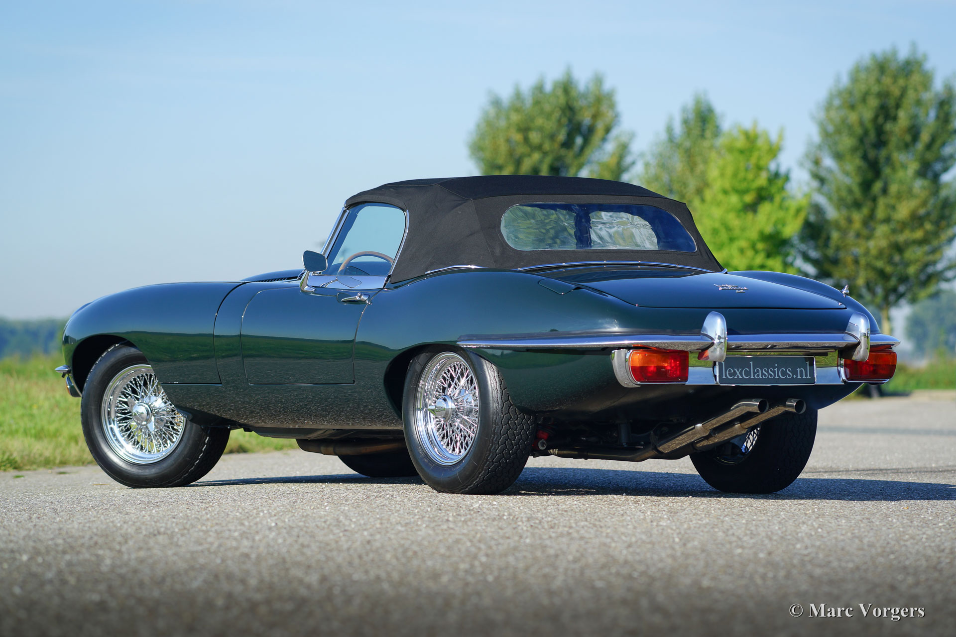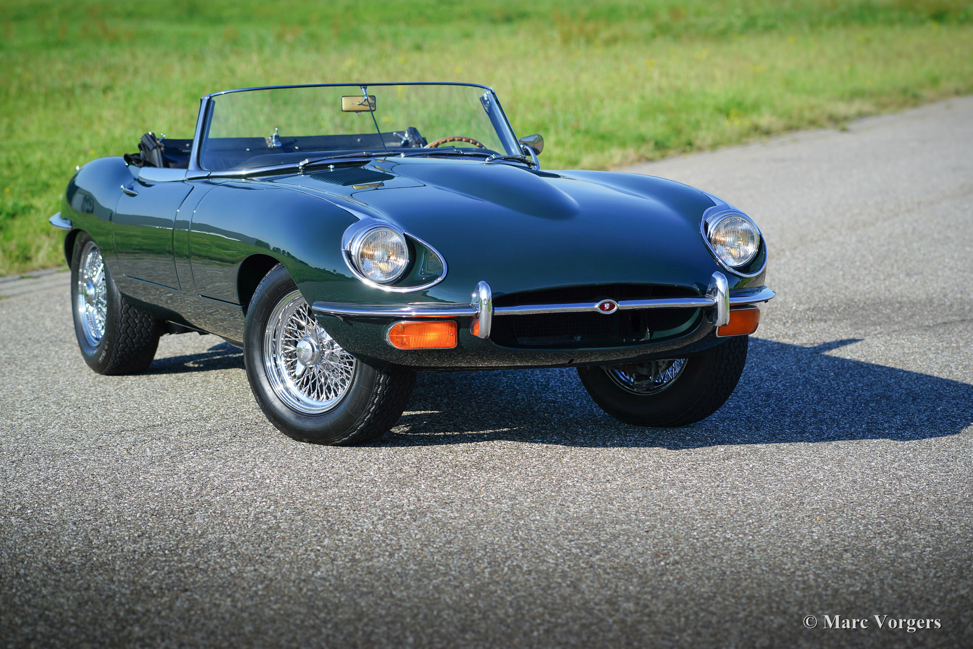 Jaguar E-type 4.2 Litre OTS series 2, year 1970. Colour British Racing Green with a black leather interior and black carpet. Black mohair soft-top and hood cover. This mighty Jaguar E-type 4.2 Litre Open Two Seater (OTS), also named roadster), was extensively and ‘body-off’ restored in the past. More recently the car was given perfect new paint commissioned by Lex Classics. Photos of this partial restoration are present. This beautiful Jaguar E-type has been cherished by one owner for 25 years; the car is in excellent to superb condition! The automobile features wide chrome wire wheels, chrome ‘knock-off’ wheel nuts, a trip master and radio with antenna. A gorgeous E-type and a wonderful driver car!