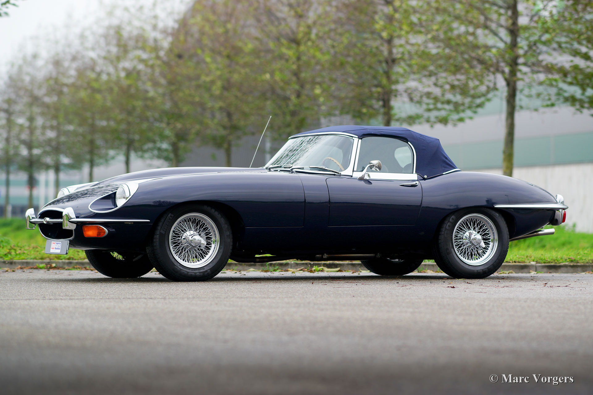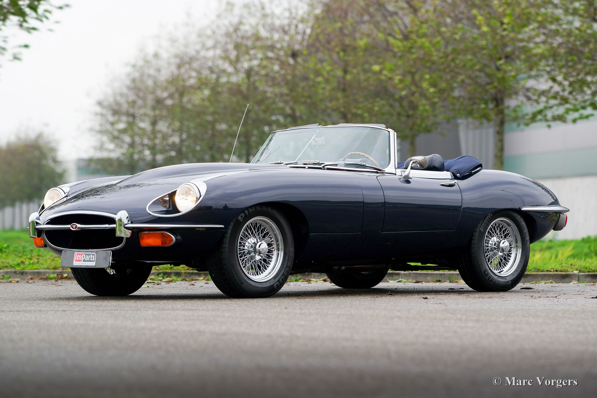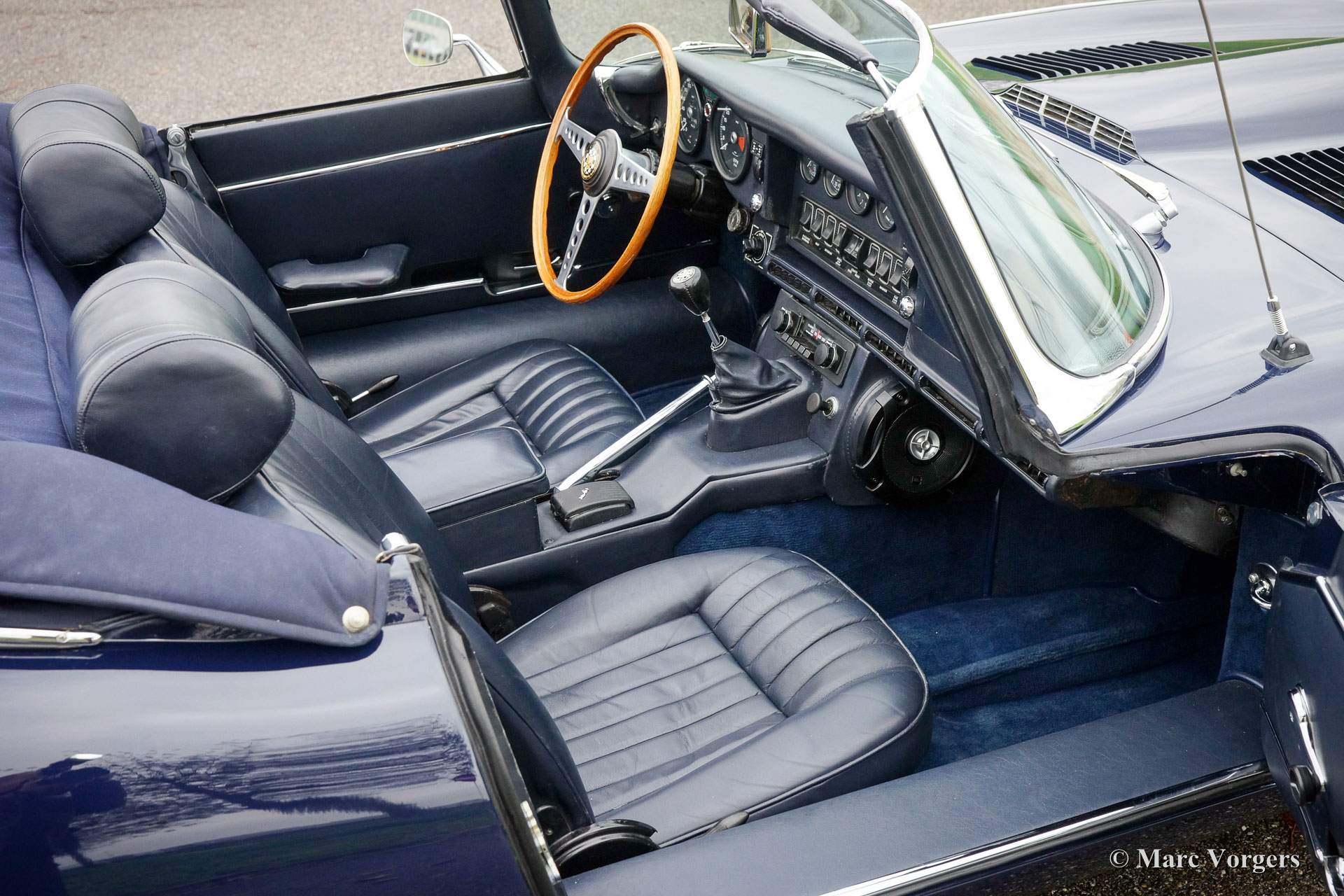 Jaguar E-type 4.2 Litre series 2 OTS (roadster), year 1970. Colour dark blue combined with a dark blue leather interior and carpet to match. Dark blue mohair soft-top and hood-cover. This gorgeous Jaguar E-type Open Two Seater (OTS, also named roadster) was imported to the Netherlands in the year 1990. The engine and gearbox are still the original factory fitted units: ‘Matching numbers’! In the 1990’ies the automobile was extensively and perfectly restored; The car is still in excellent to superb condition! The bodywork shows crisp panel fit, superb paint and magnificent chrome brightwork. The interior is excellent throughout and the engine room displays very well maintained. The engine was modified to run on lead free petrol. Starting with the series 2 the E-type was available with optional power steering, the first owner had it factory fitted; a desirable option which adds to a comfortable driving experience considerably! The series 2 also features improved seats, improved brakes and an up-rated cooling system. This gorgeous Jaguar E-type features wide chrome wire wheels, good Pirelli P4000 (205/70-15) tyres, a Stainless-Steel exhaust, three SU carburettors, a km/h speedometer and the beautiful original wood rimmed E-type steering wheel. This is an excellent specimen!
