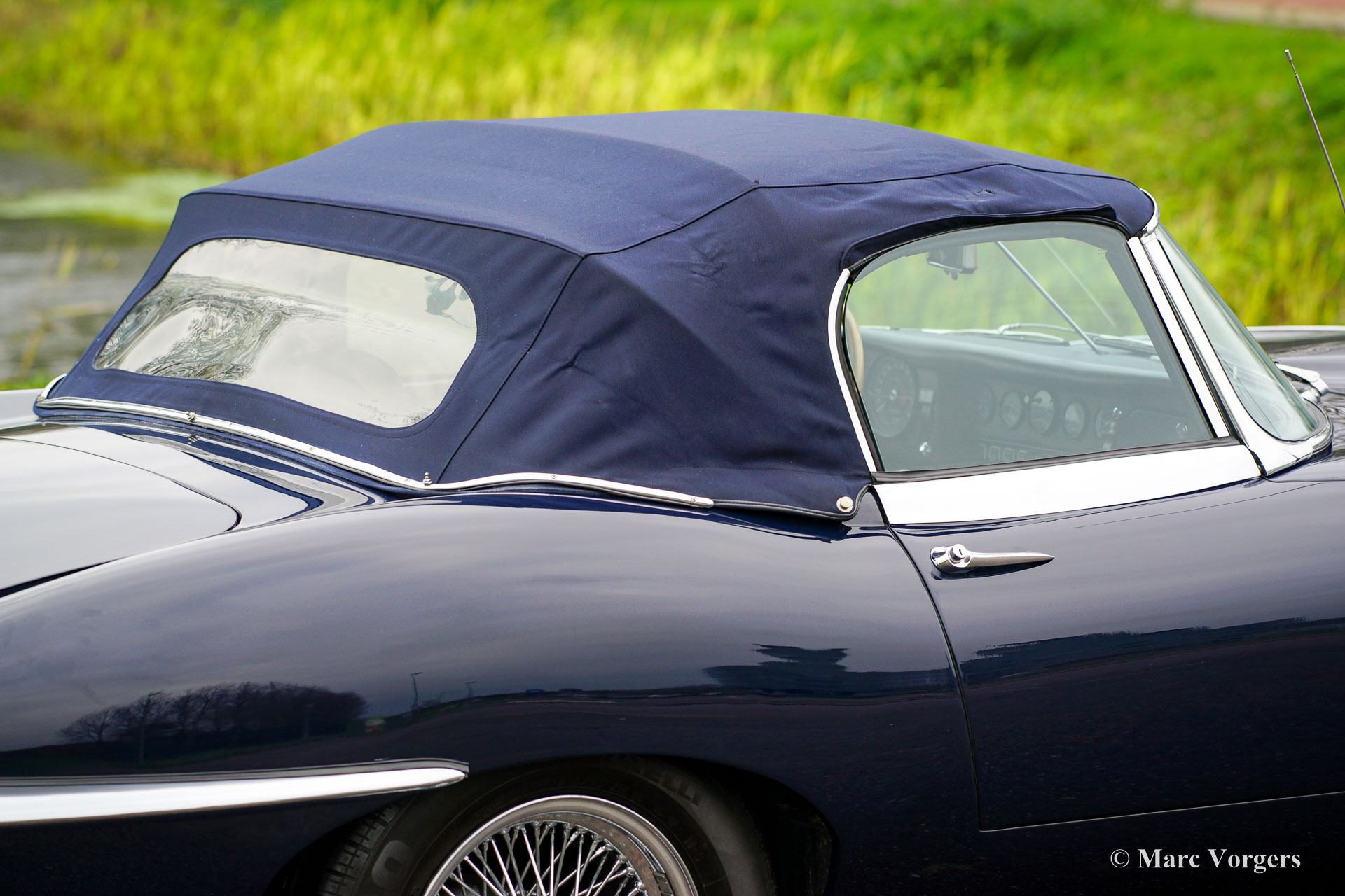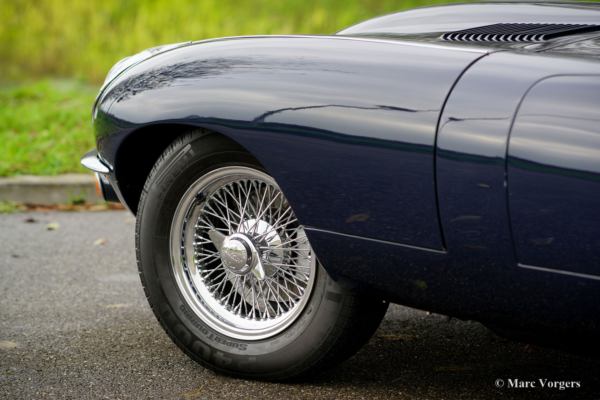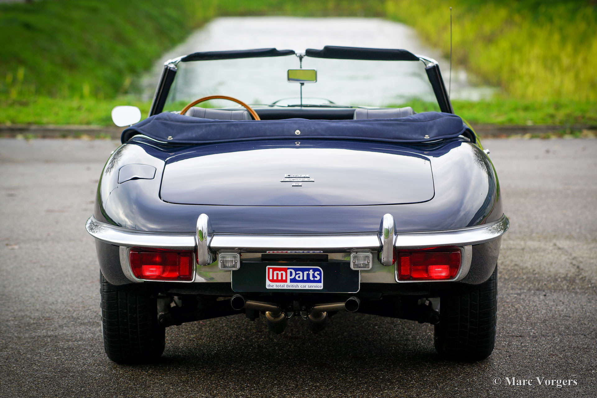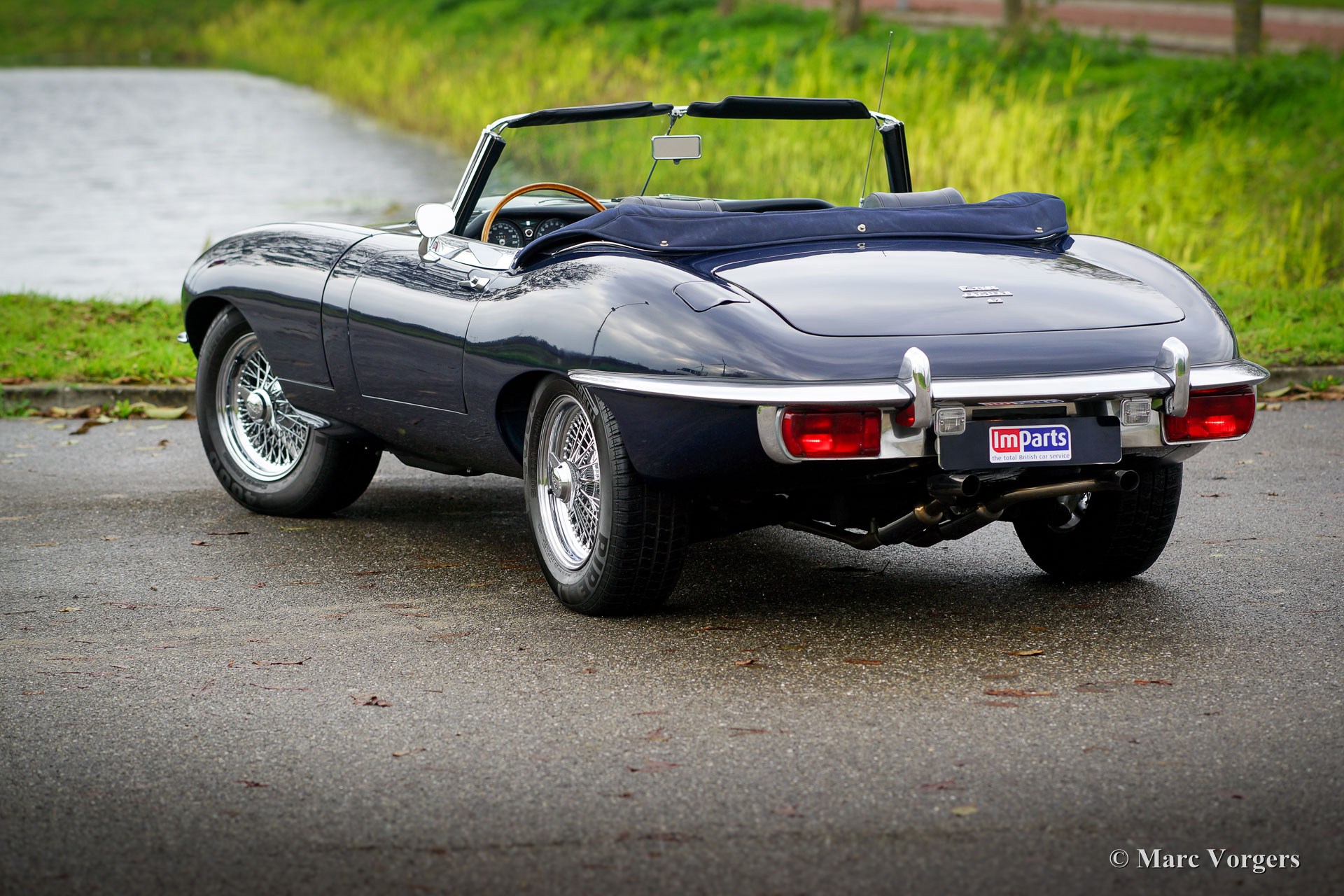 Jaguar E-type 4.2 Litre series 2 OTS (roadster), year 1970. Colour dark blue combined with a dark blue leather interior and carpet to match. Dark blue mohair soft-top and hood-cover. This gorgeous Jaguar E-type Open Two Seater (OTS, also named roadster) was imported to the Netherlands in the year 1990. The engine and gearbox are still the original factory fitted units: ‘Matching numbers’! In the 1990’ies the automobile was extensively and perfectly restored; The car is still in excellent to superb condition! The bodywork shows crisp panel fit, superb paint and magnificent chrome brightwork. The interior is excellent throughout and the engine room displays very well maintained. The engine was modified to run on lead free petrol. Starting with the series 2 the E-type was available with optional power steering, the first owner had it factory fitted; a desirable option which adds to a comfortable driving experience considerably! The series 2 also features improved seats, improved brakes and an up-rated cooling system. This gorgeous Jaguar E-type features wide chrome wire wheels, good Pirelli P4000 (205/70-15) tyres, a Stainless-Steel exhaust, three SU carburettors, a km/h speedometer and the beautiful original wood rimmed E-type steering wheel. This is an excellent specimen!