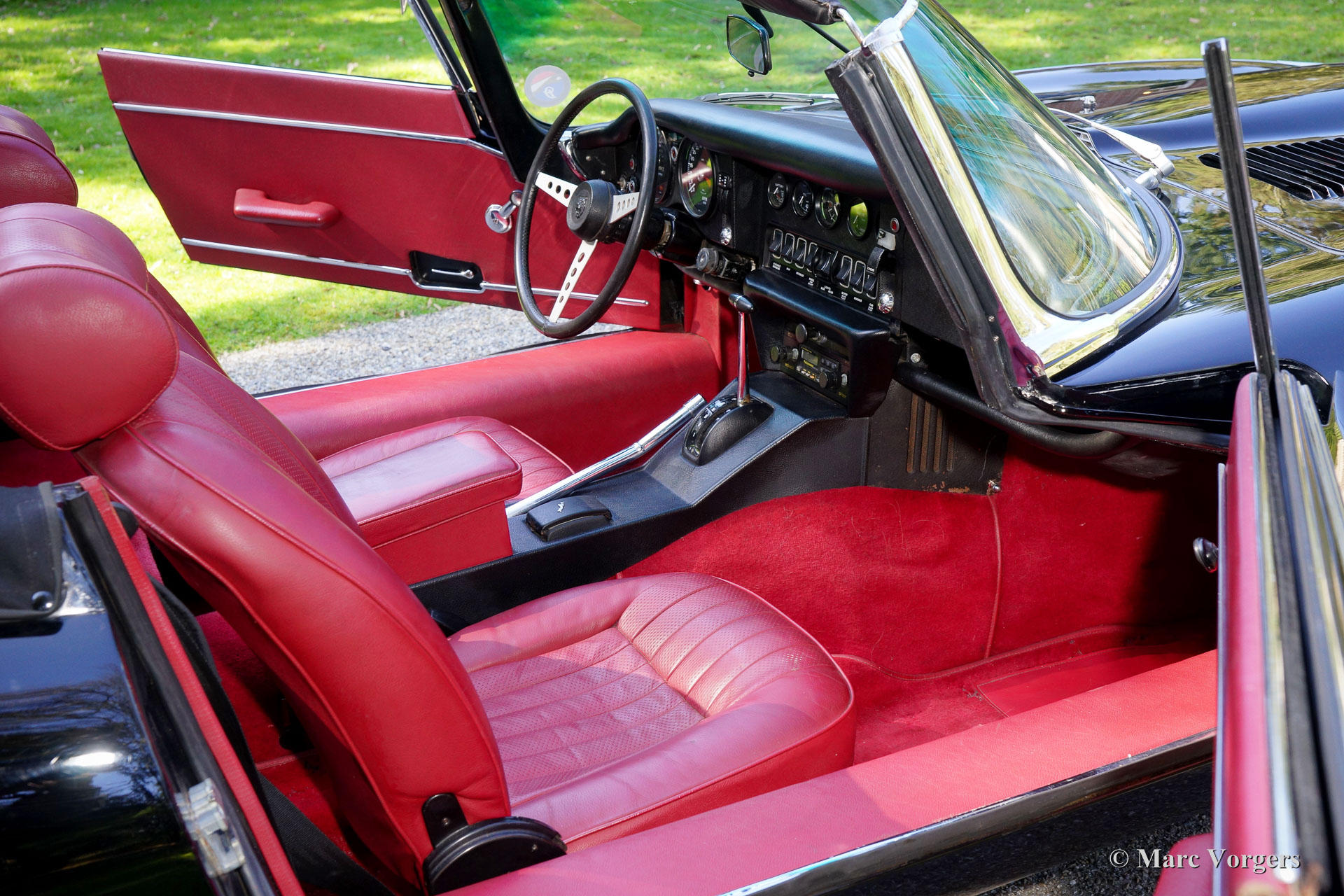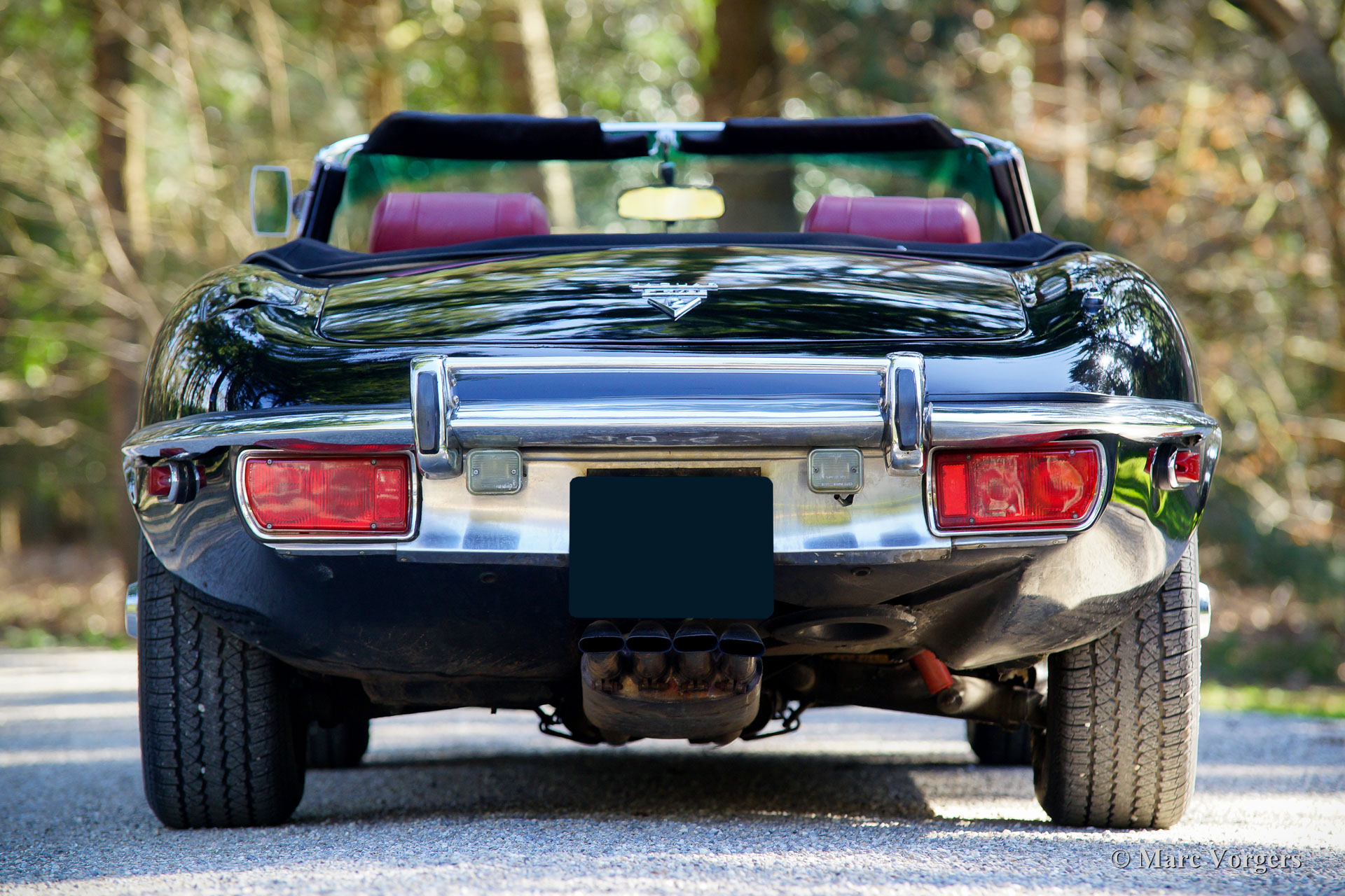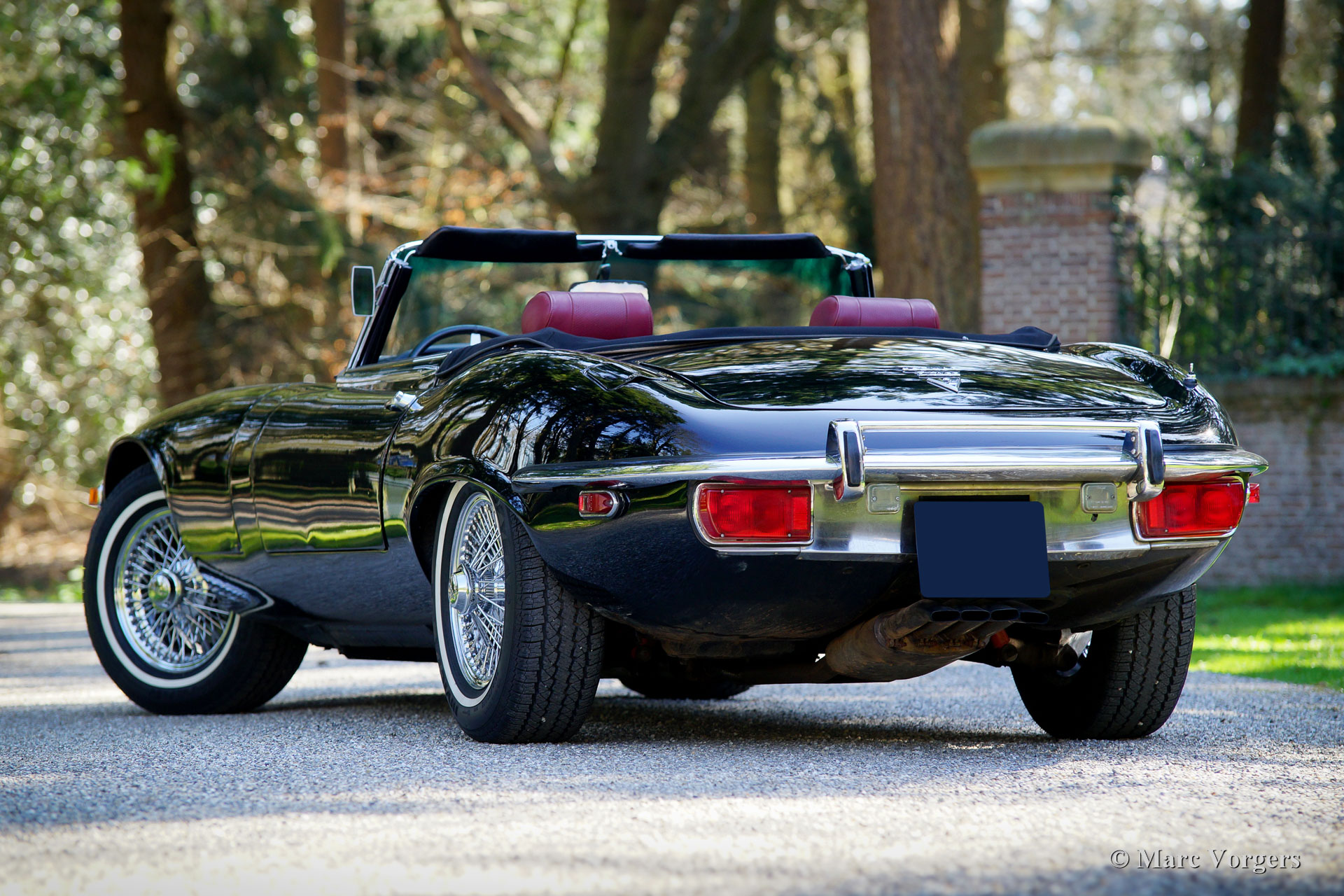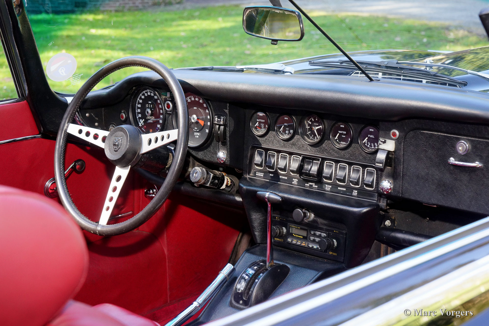 Jaguar E-type V12 roadster, year 1971. Colour black with a red leather interior and red carpet. Black soft-top and hood-cover. This magnificent E-type V12 was sold new in the USA. In the year 1989 the car was imported to the Netherlands. In the 1990ies the automobile was extensively restored. Since the year 1994 this fine E-type is being cherished by one owner! The black body combines beautifully with the red leather and the chrome wire wheels; quite a picture! This Jaguar E-type is in a very beautiful and good driver condition. Some traces of age are present, like on the floor and mats. These can easily be brought to perfection by the next owner if desired. The driving experience of this fabulous E-type is one of sheer comfort and one of sensational thrill because of the very powerful and smooth V12 engine which also produces a mighty sound-track! The car is fitted with an automatic gearbox and chrome wire wheels and it shows fantastic original details. This is a beautiful and superbly driving Jaguar E-type V12 roadster.