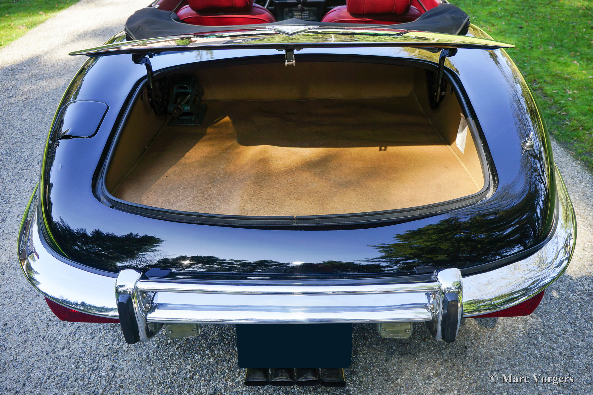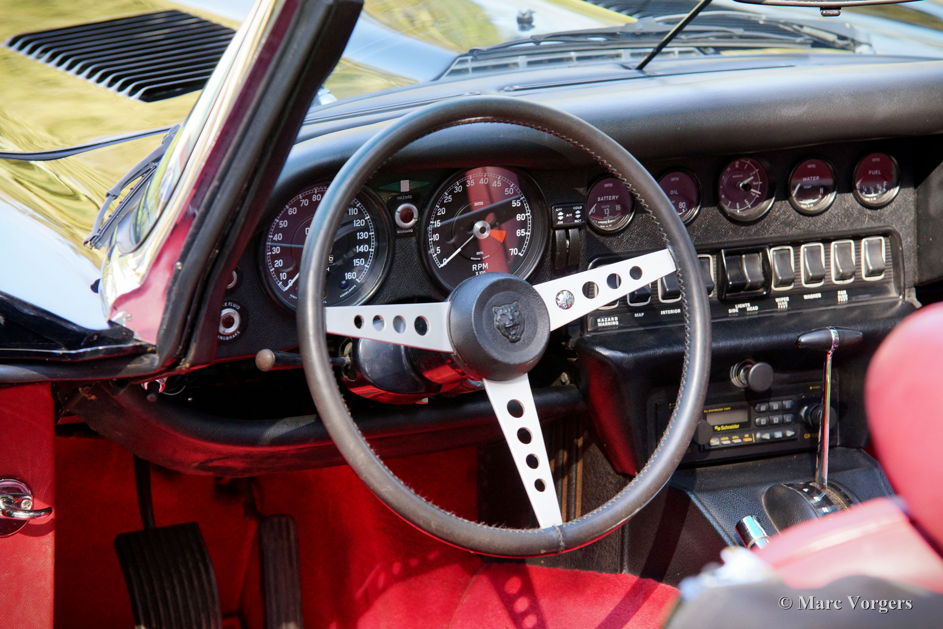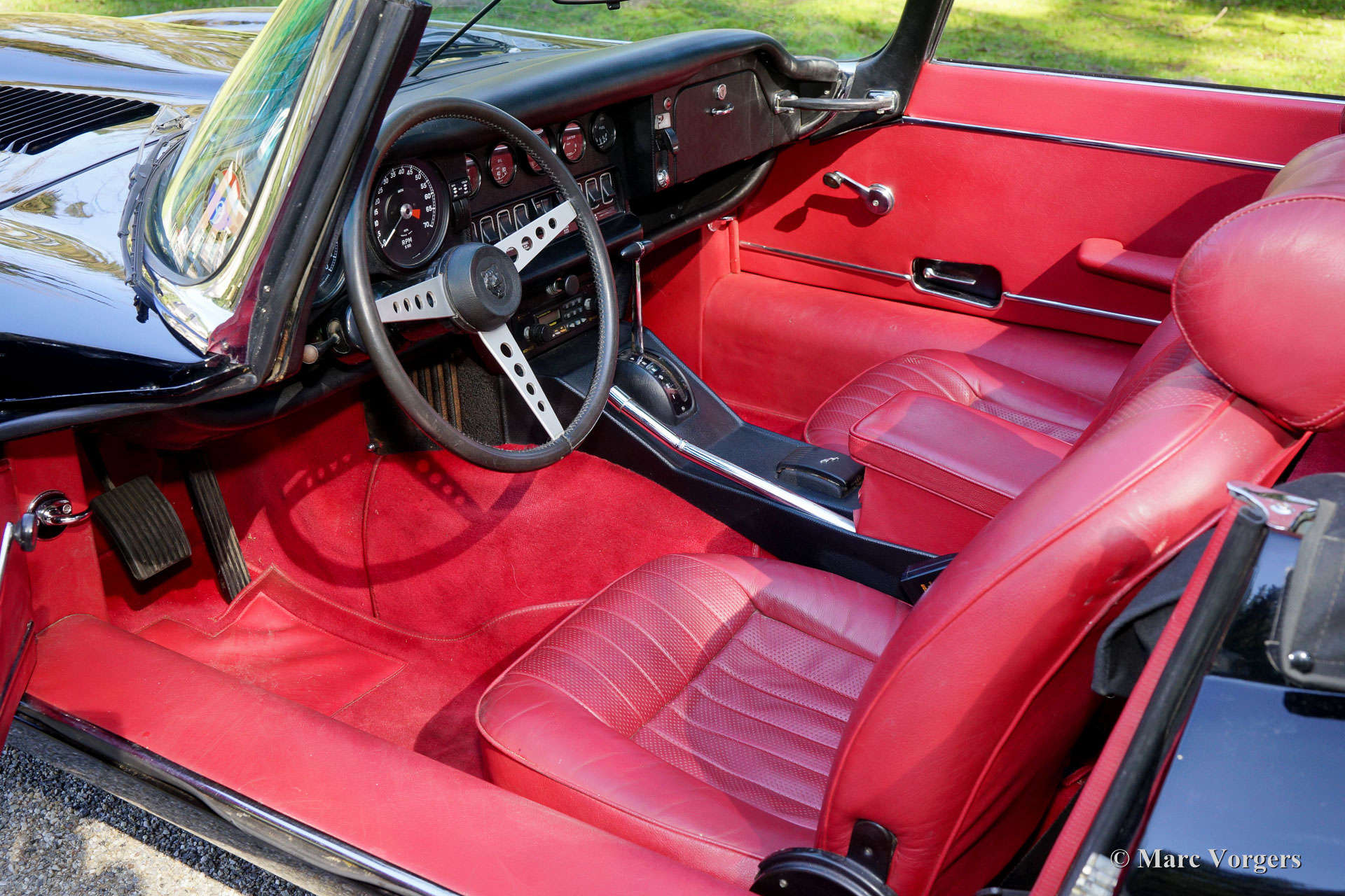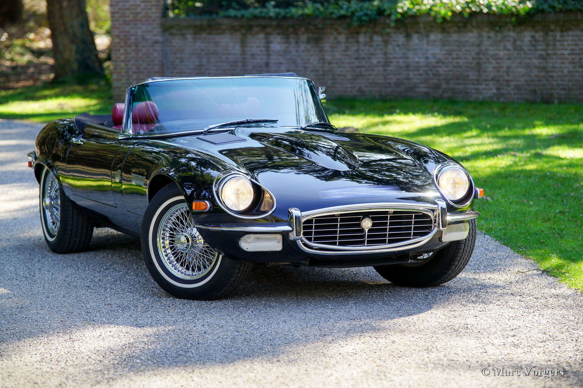 Jaguar E-type V12 roadster, year 1971. Colour black with a red leather interior and red carpet. Black soft-top and hood-cover. This magnificent E-type V12 was sold new in the USA. In the year 1989 the car was imported to the Netherlands. In the 1990ies the automobile was extensively restored. Since the year 1994 this fine E-type is being cherished by one owner! The black body combines beautifully with the red leather and the chrome wire wheels; quite a picture! This Jaguar E-type is in a very beautiful and good driver condition. Some traces of age are present, like on the floor and mats. These can easily be brought to perfection by the next owner if desired. The driving experience of this fabulous E-type is one of sheer comfort and one of sensational thrill because of the very powerful and smooth V12 engine which also produces a mighty sound-track! The car is fitted with an automatic gearbox and chrome wire wheels and it shows fantastic original details. This is a beautiful and superbly driving Jaguar E-type V12 roadster.