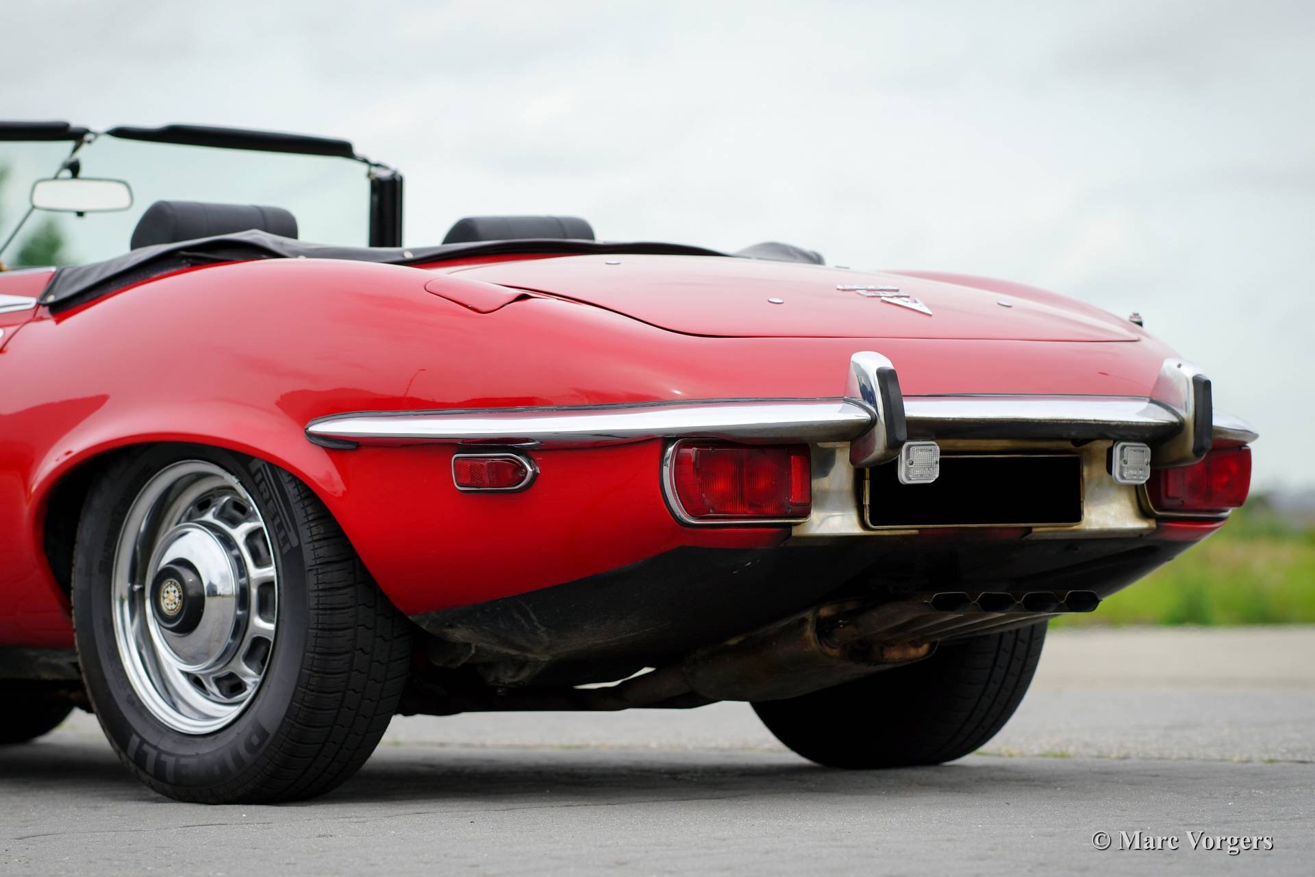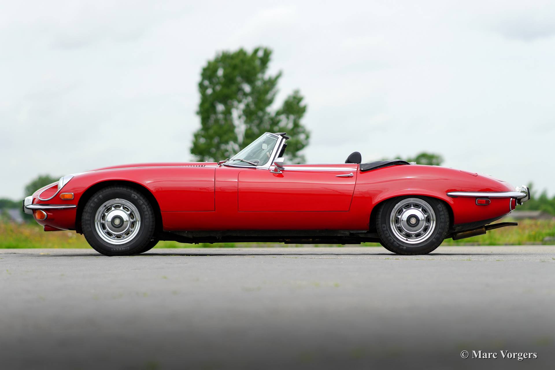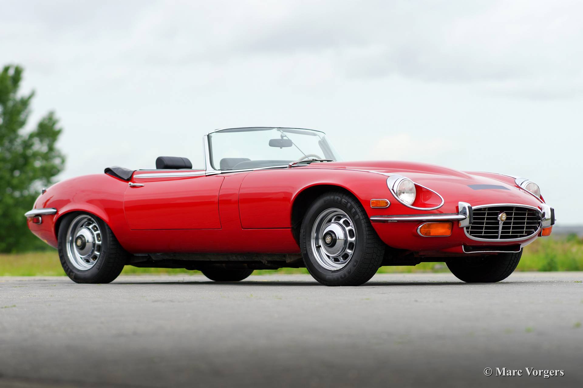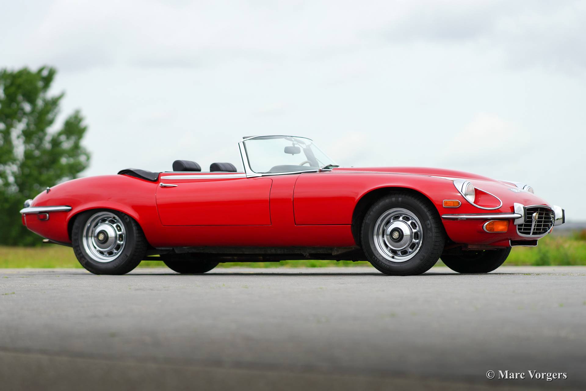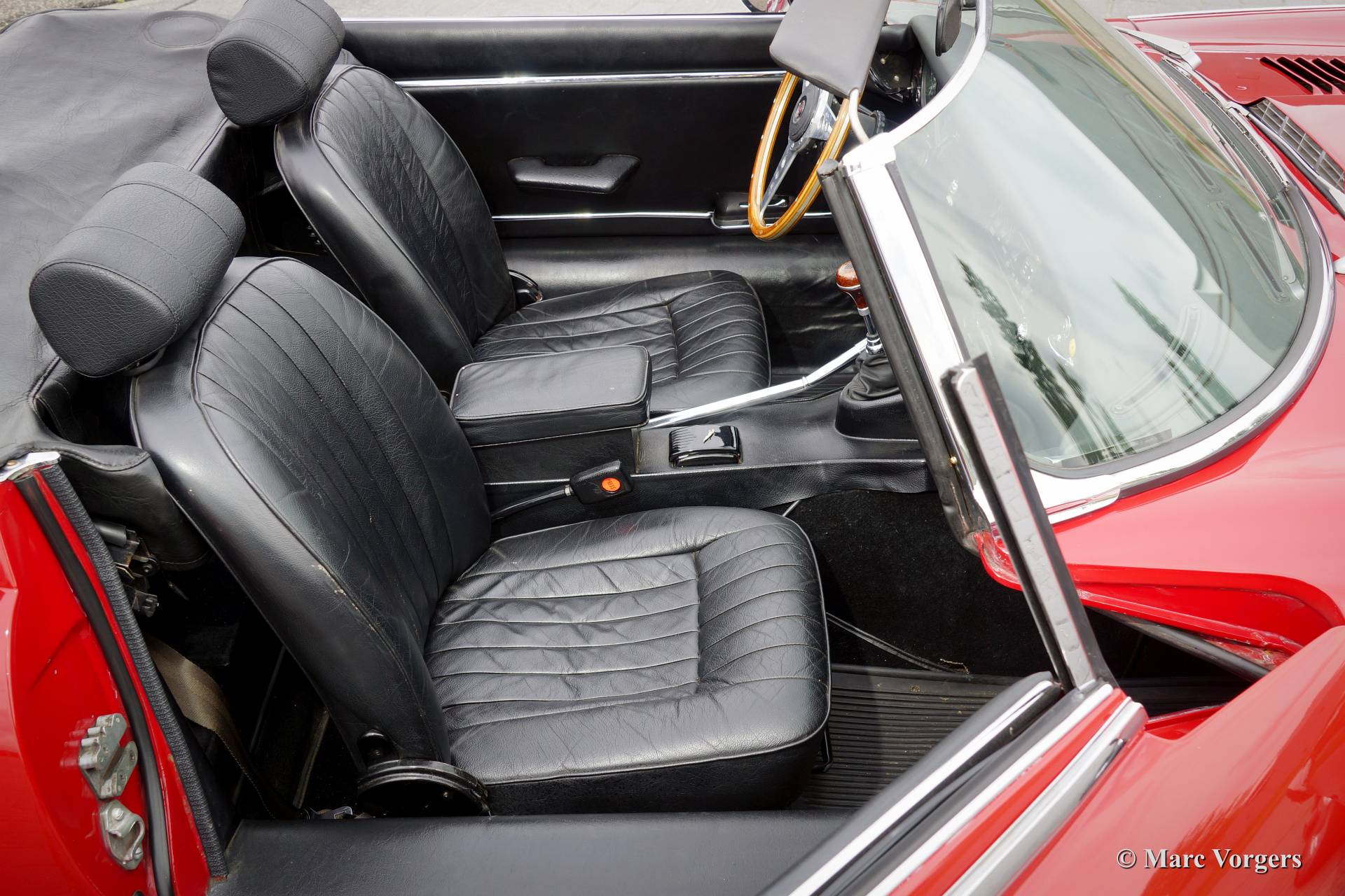 Jaguar E-type V12 roadster, year 1973. Colour red with a black leather interior and black carpet. Black soft top. This very impressive E-type V12 was imported from the USA to the Netherlands in the year 1994. The last Dutch owner had the car in possession since 2007. The automobile has always been well serviced and maintained by a Jaguar specialist, the car is in very good condition! This E-type V12 roadster features the delightful 4-speed manual gearbox option, this way you can fully control the immense loads of torque the engine delivers!