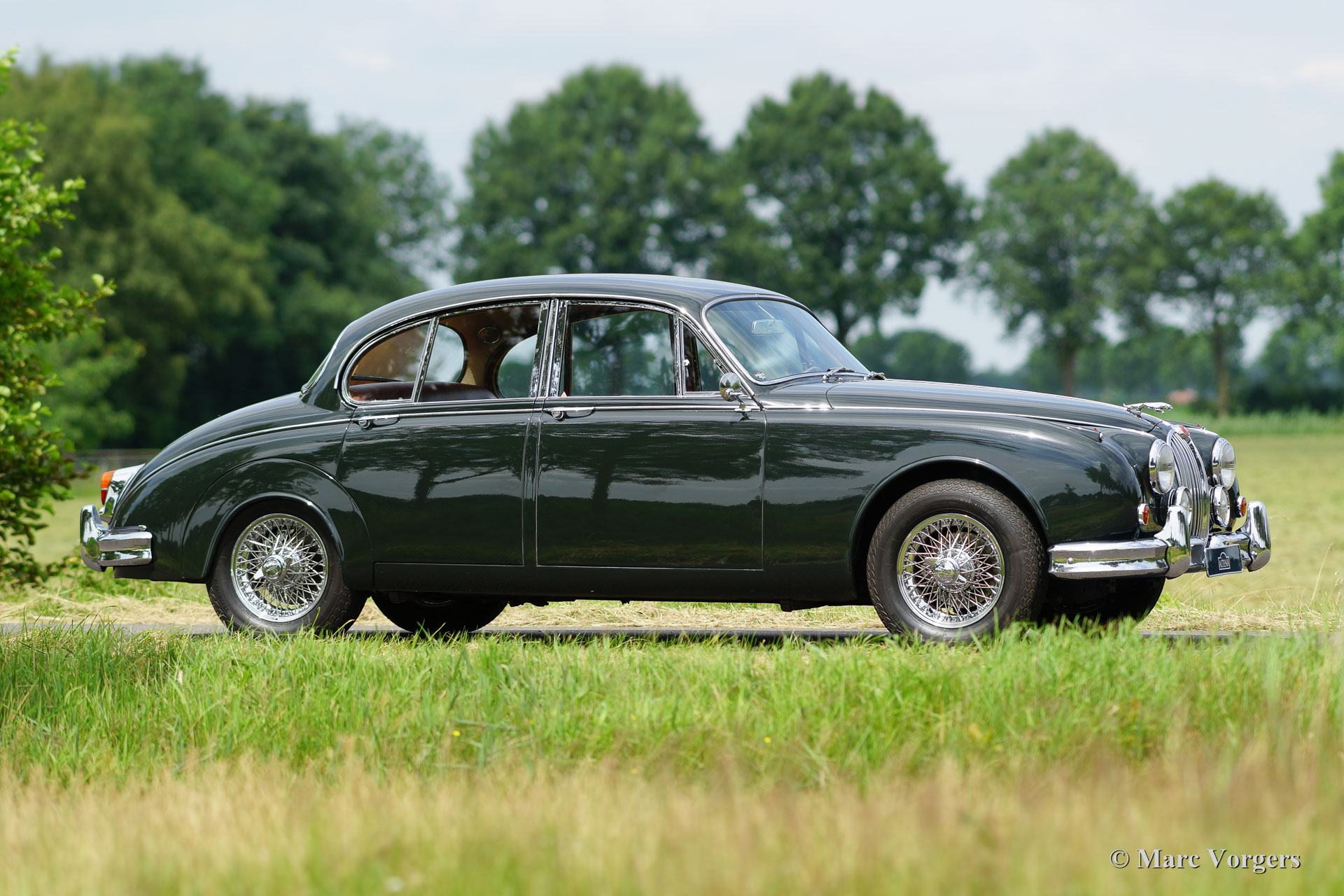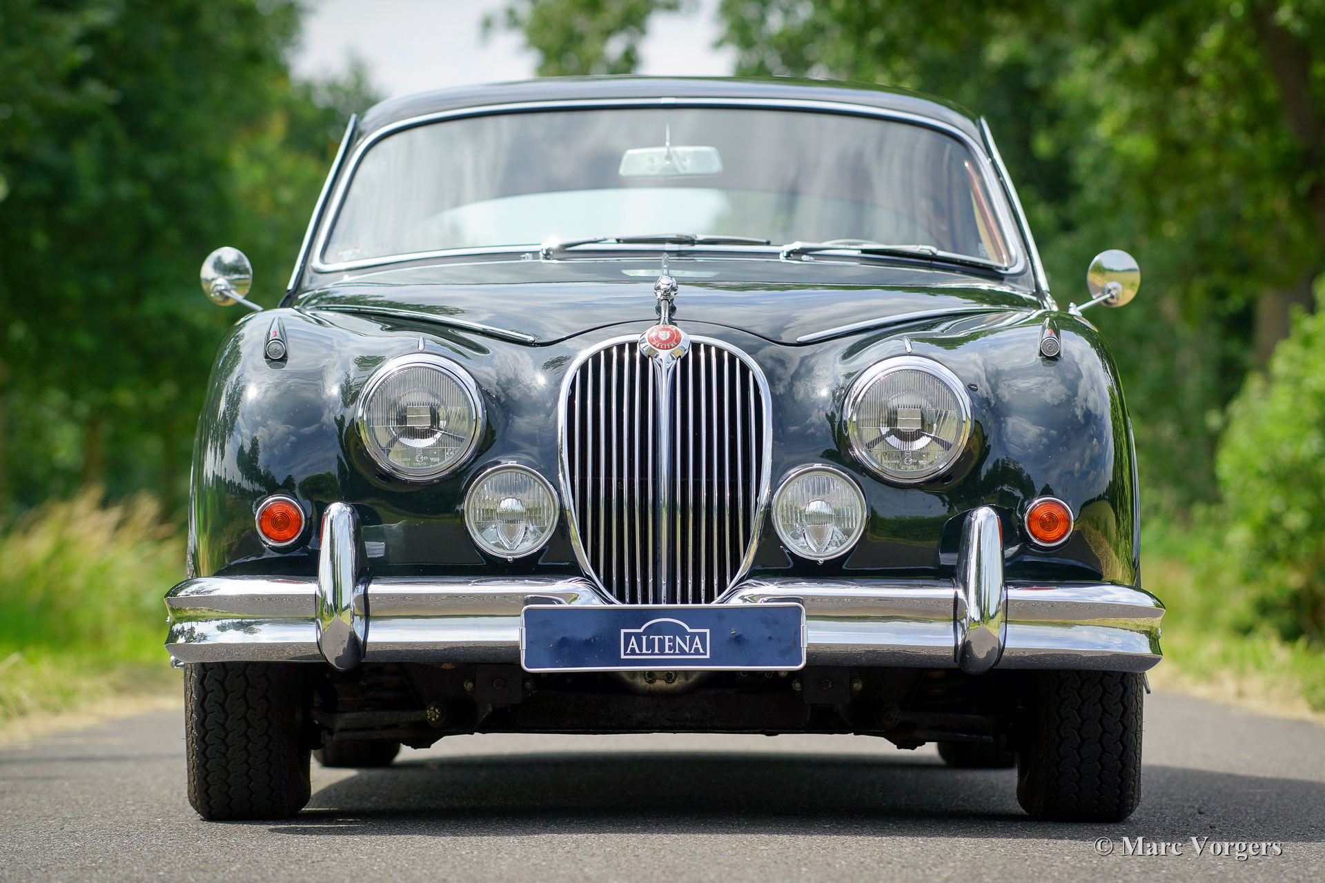 Jaguar Mk II 3.4 Litre, year 1964. Colour British Racing Green with a cognac leather interior and matching carpet. This beautiful Jaguar Mk II was extensively restored by Altena Classic Service in the past. In 2010 the automobile was sold to Germany. The Mk II has been meticulously serviced and maintained in our workshop ever since. This magnificent Jaguar Mk II is in superb condition and the car drives perfect! The car features a 5-speed manual gearbox (modification), chrome wire wheels, chrome eared 'knock-off' wheel nuts, upgraded suspension with adjustable shock absorbers, special springs and polyurethane bushings. This eye-catching Mk II comes with a solid service history. A delightful and very stylish Jaguar Mk II!