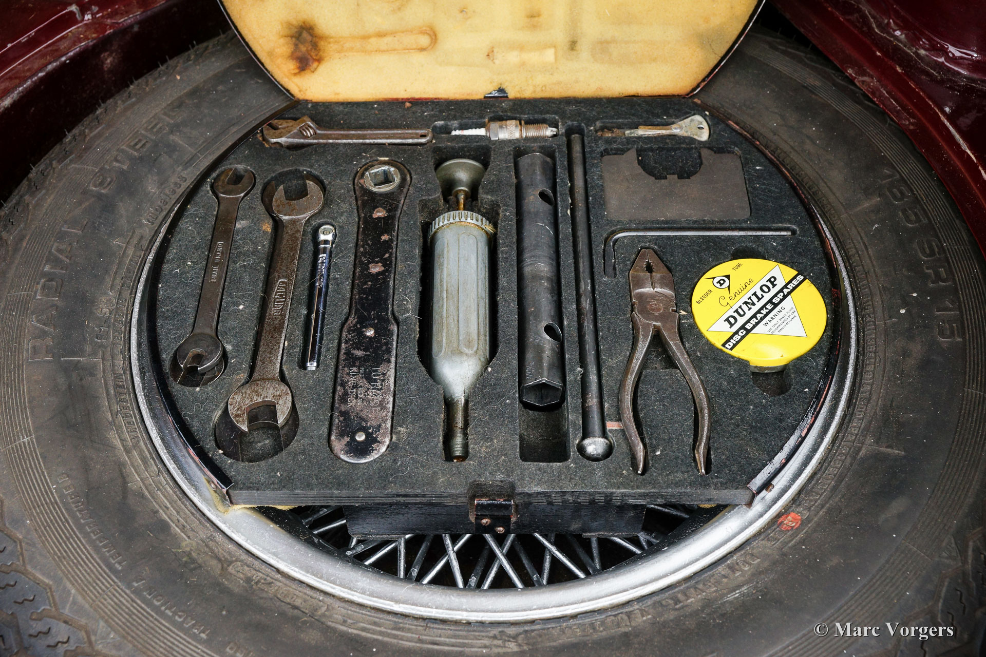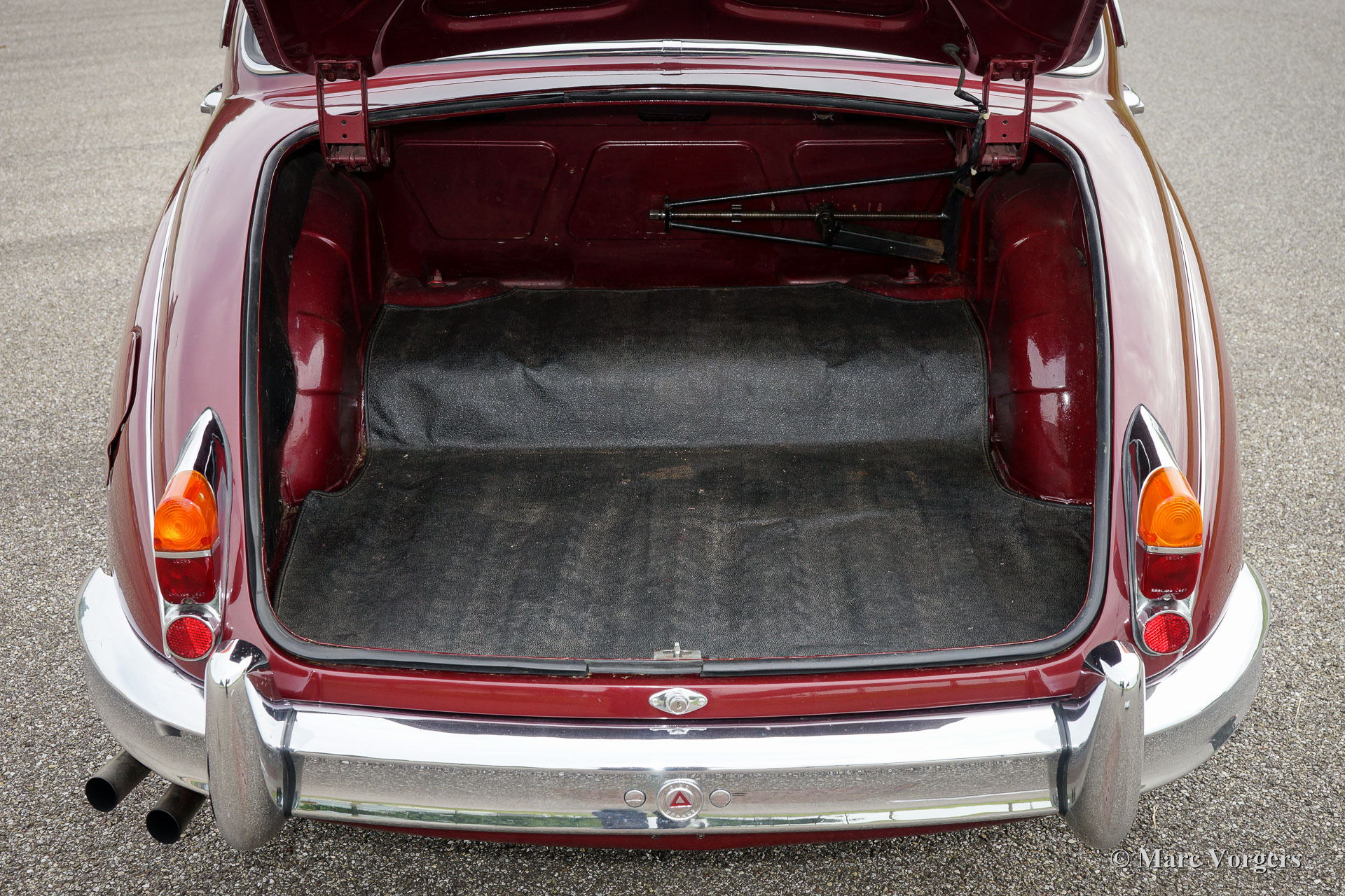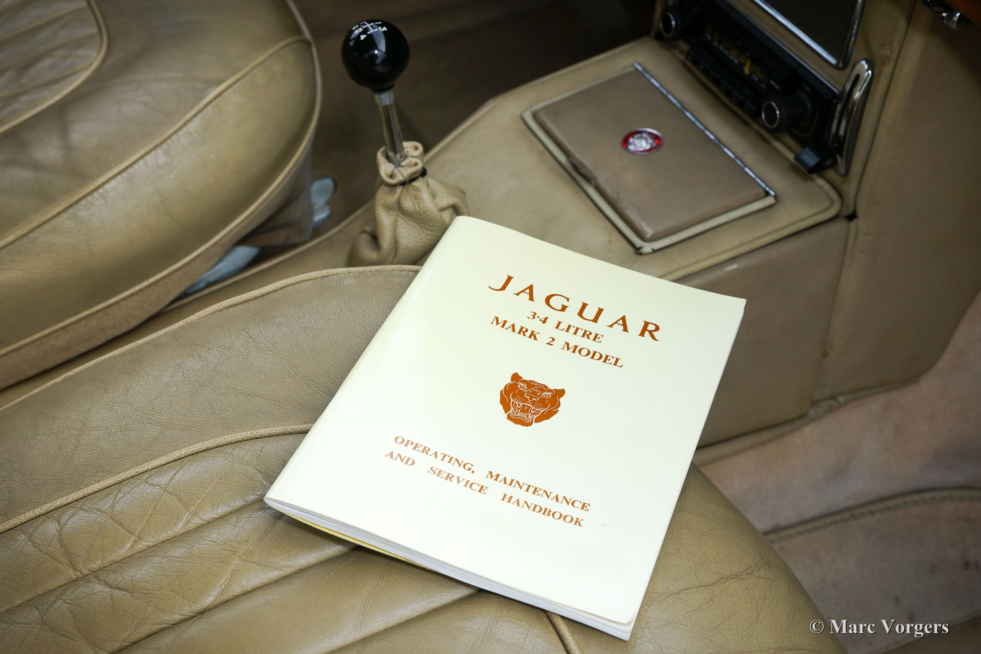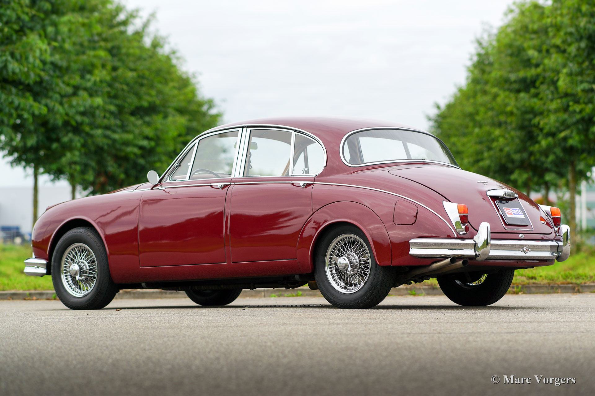 Jaguar Mk II 3.4 Litre, year 1966. Colour ‘opalescent Maroon’ with a beige leather interior. This beautiful Jaguar Mk II is in very good condition and the car drives delightfully! The service history is known and documented since the year 2007. This Jaguar Mk II features the 3.4 Litre XK engine combined with the excellent 4-speed manual gearbox and overdrive! The bodywork is very clean and it shows excellent panel fit. The car features power steering, electronic ignition AND the complete original toolset! The car is maintained and serviced very well, in recent years a Stainless Steel exhaust has been fitted and the brakes have been overhauled and renewed. A sought after Mk II with manual gearbox in the seldom seen original Jaguar colour opalescent maroon.