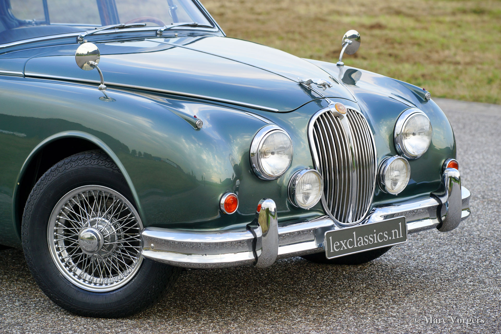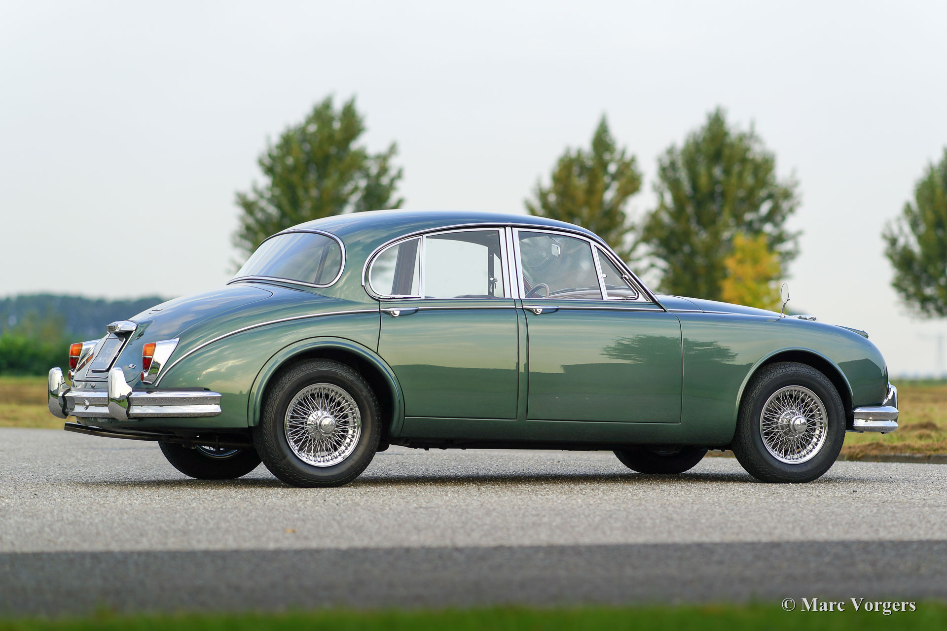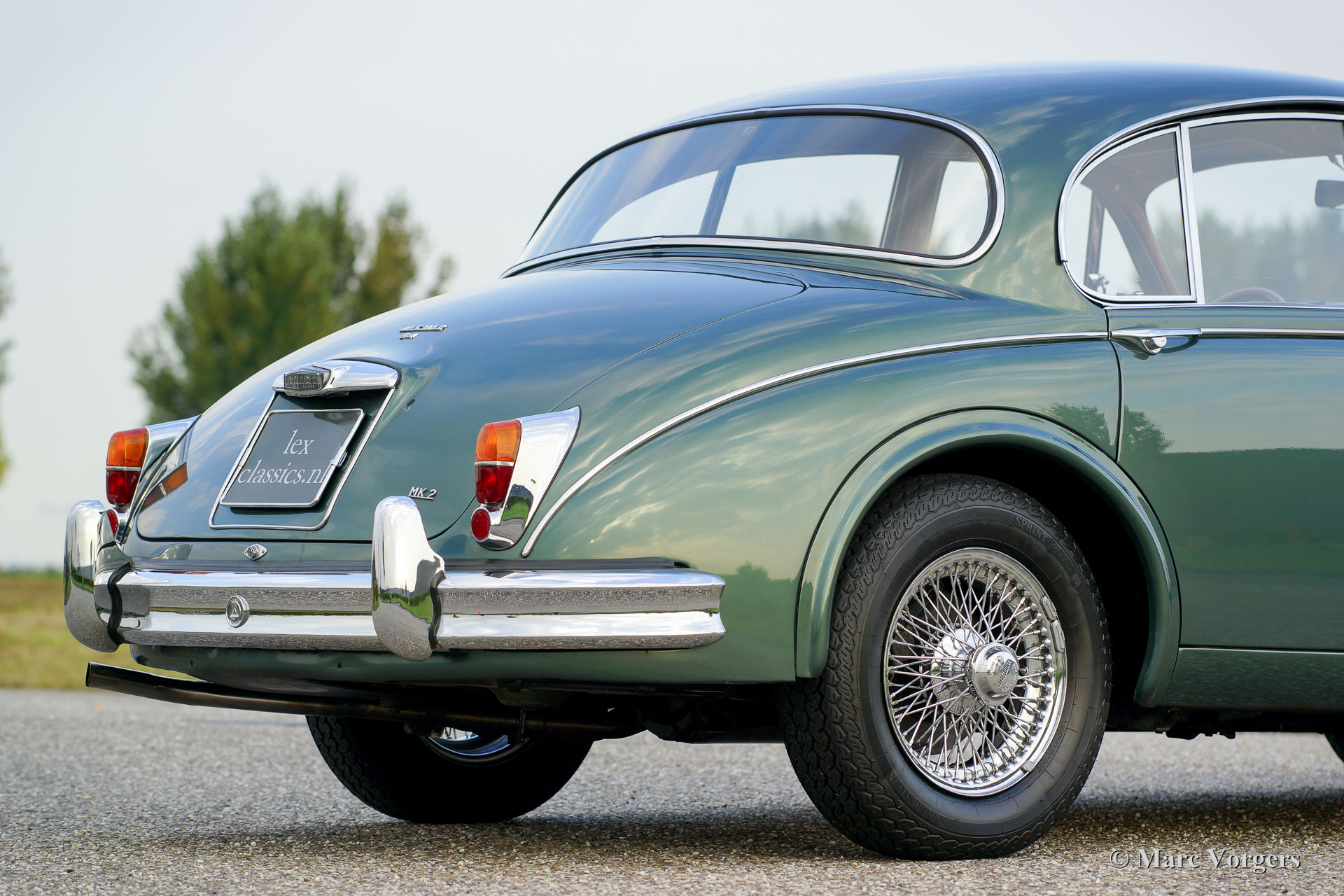 Jaguar Mk II 3.4 Litre, year 1968. Colour green metallic (Opalescent Green) with a suede green leather interior and matching carpet. This wonderful Jaguar Mk II was extensively and ‘body-off’ restored in the Netherlands in the past. The body shows perfect panel fit and the paint is beautiful! This Jaguar Mk II is in excellent to superb condition and the car drives delightfully. The driving experience is enhanced by the magnificent engine and the combination of a manual 4-speed gearbox and overdrive; highly desirable and sought after fittings. Furthermore, this stylish Jaguar features chrome wire wheels with ‘knock off’ eared wheel nuts, additional driving lamps at the front, rear-view mirrors on both front wings, a beautiful steering wheel with wood rim and a gorgeous period Blaupunkt radio with antenna.