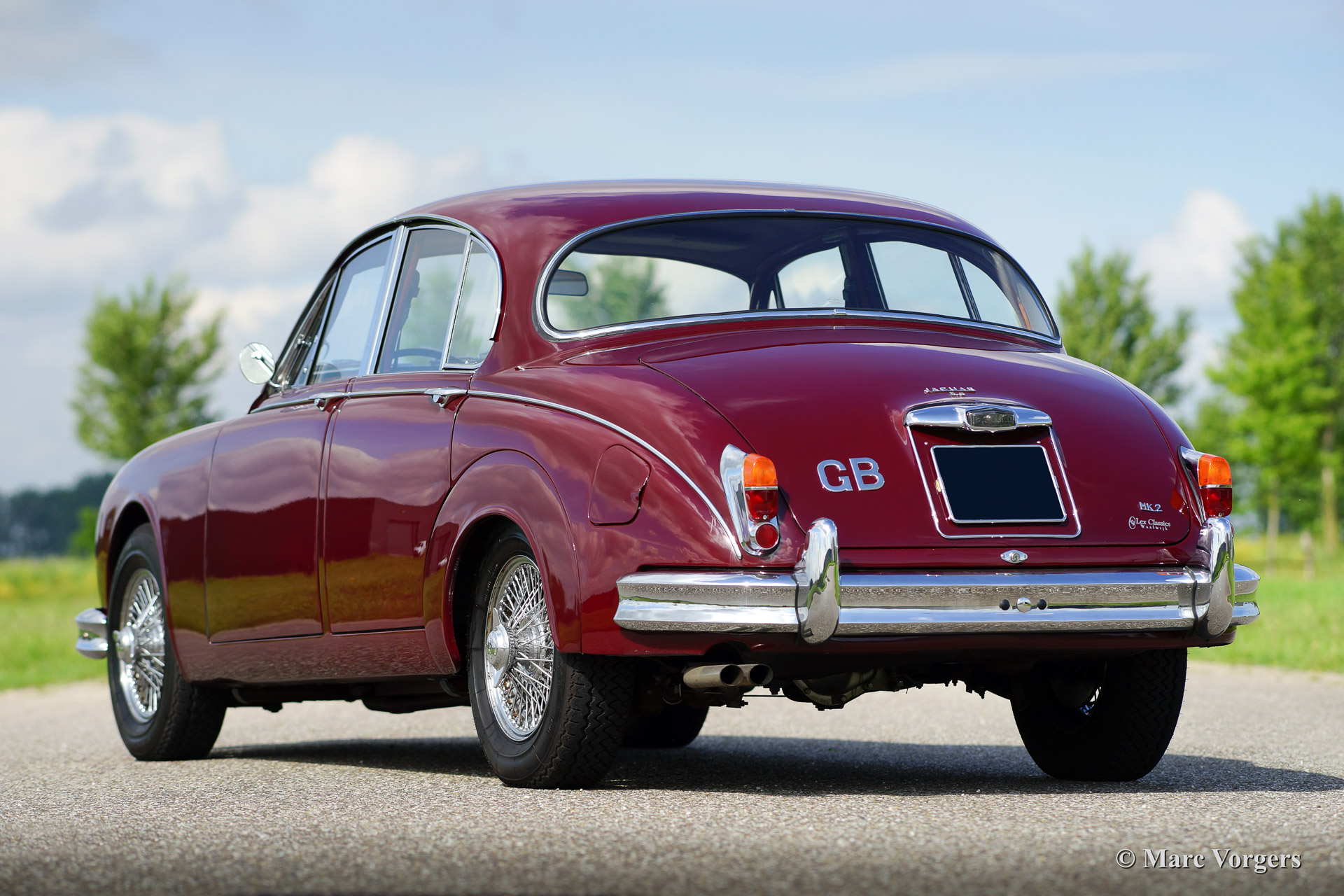Jaguar Mk II 3.8 Litre, year 1960. Chassis number: 103488. Colour dark red with a tan (beige) leather interior. This stylish Jaguar Mk II was extensively restored in the past, the automobile is in excellent condition. This Mk II is the most sought after model: the 3.8 Litre with manual gearbox and overdrive! This very handsome Jaguar saloon drives magnificently. The car sports chrome wire wheels.