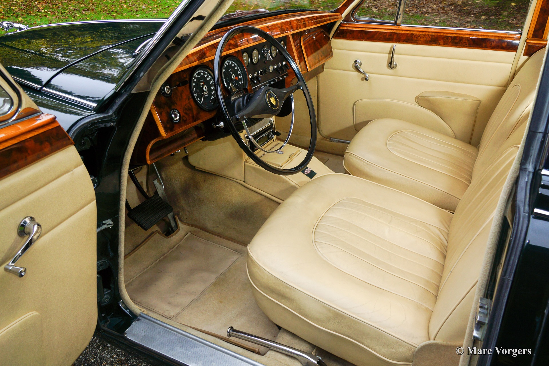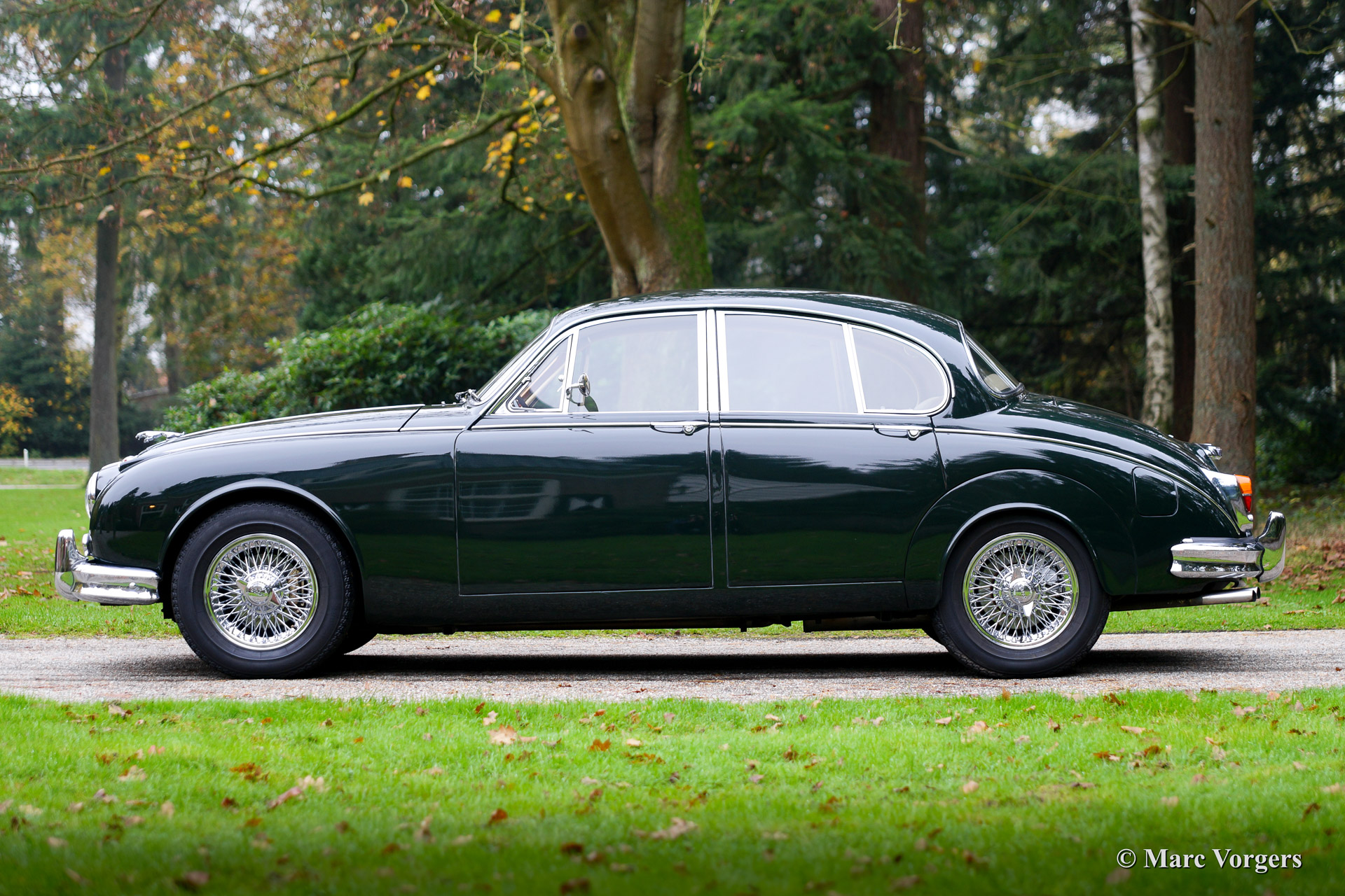 Jaguar Mk II 3.8 Litre, year 1960. Body colour Dark British Racing Green with a beige leather interior and beige carpet. This very stylish and beautiful Jaguar Mk II 3.8 Litre was extensively restored in the past. The engine and the gearbox were overhauled by a Dutch Jaguar specialist 10 years ago. At the same time all the interior wood panels were beautifully restored. This Jaguar Mk II is in excellent condition and the car drives delightful! The car features the powerful 3.8 Litre engine combined with a comfortable 3-speed automatic gearbox. Additionally the automobile sports power steering, chrome wire wheels a Stainless Steel exhaust and new Michelin tyres.