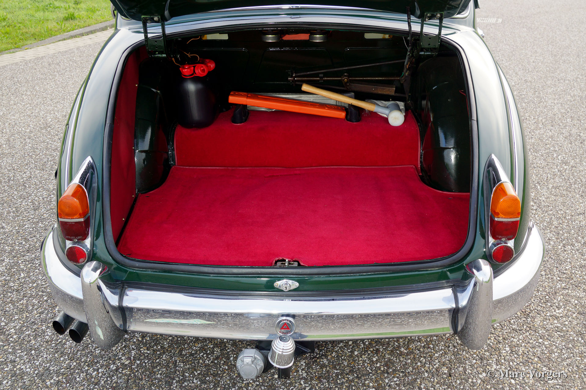 Jaguar Mk II 3.8 Litre, year 1961. Chassis number: P217284BW. Colour British Racing Green with a red leather interior and red carpet. This very stylish Jaguar Mk II 3.8 Litre was imported from the USA to the Netherlands in the year 1992. Then the car was extensively and ‘body off’ restored. The original interior was retained. The restoration was completed in 1998. A comprehensive photo reportage of the restoration is present. The automobile features an automatic gearbox, green enamelled wire wheels, chrome ‘knock off’ wheel nuts, two wing-mirrors, an electric Kenlow cooling fan, aluminium rocker cover, Philips radio / CD-player, Stainless Steel exhaust, 123 electronic ignition, Koni shock absorbers, modern steering gear, power steering (XJ6) and a tow bar. This beautiful Jaguar is in very good condition and the car drives delightfully!