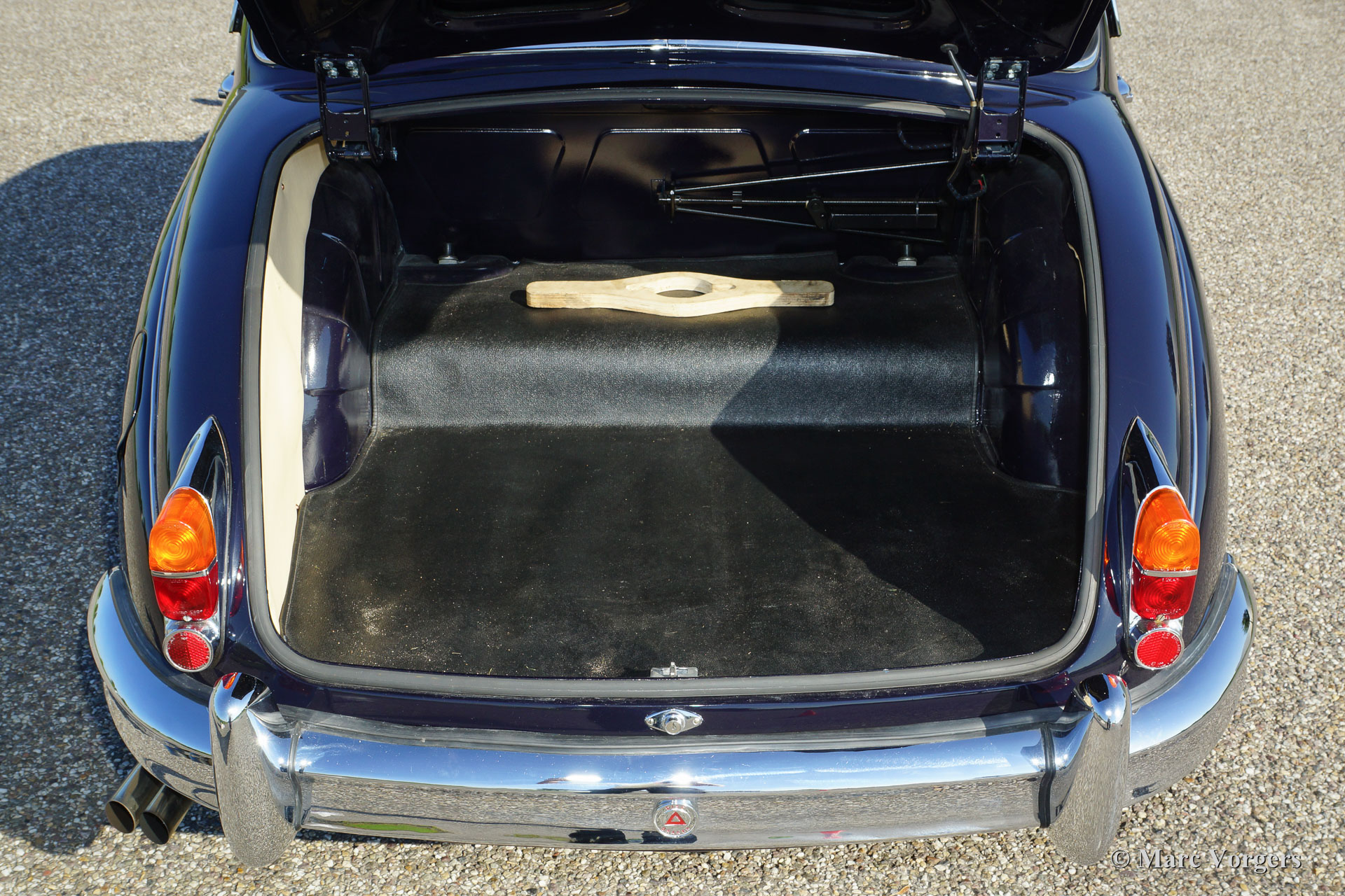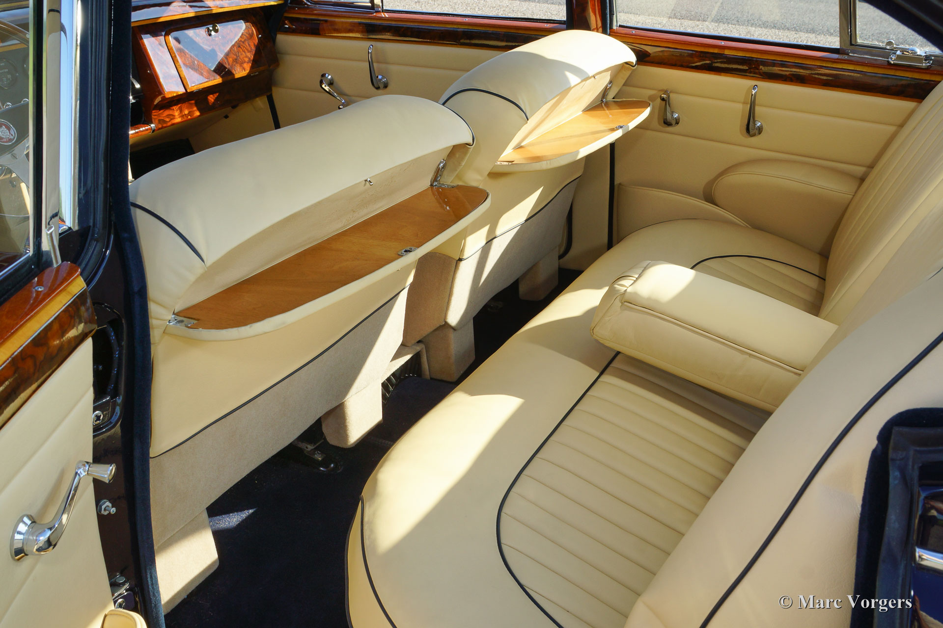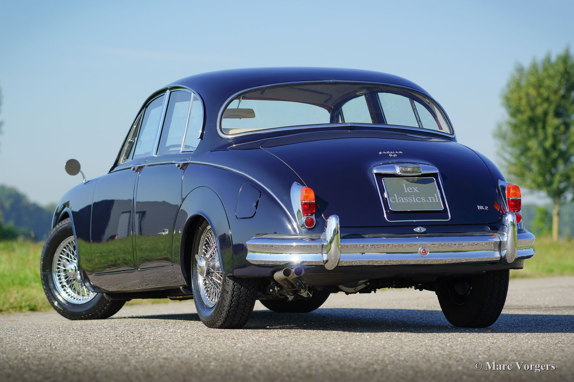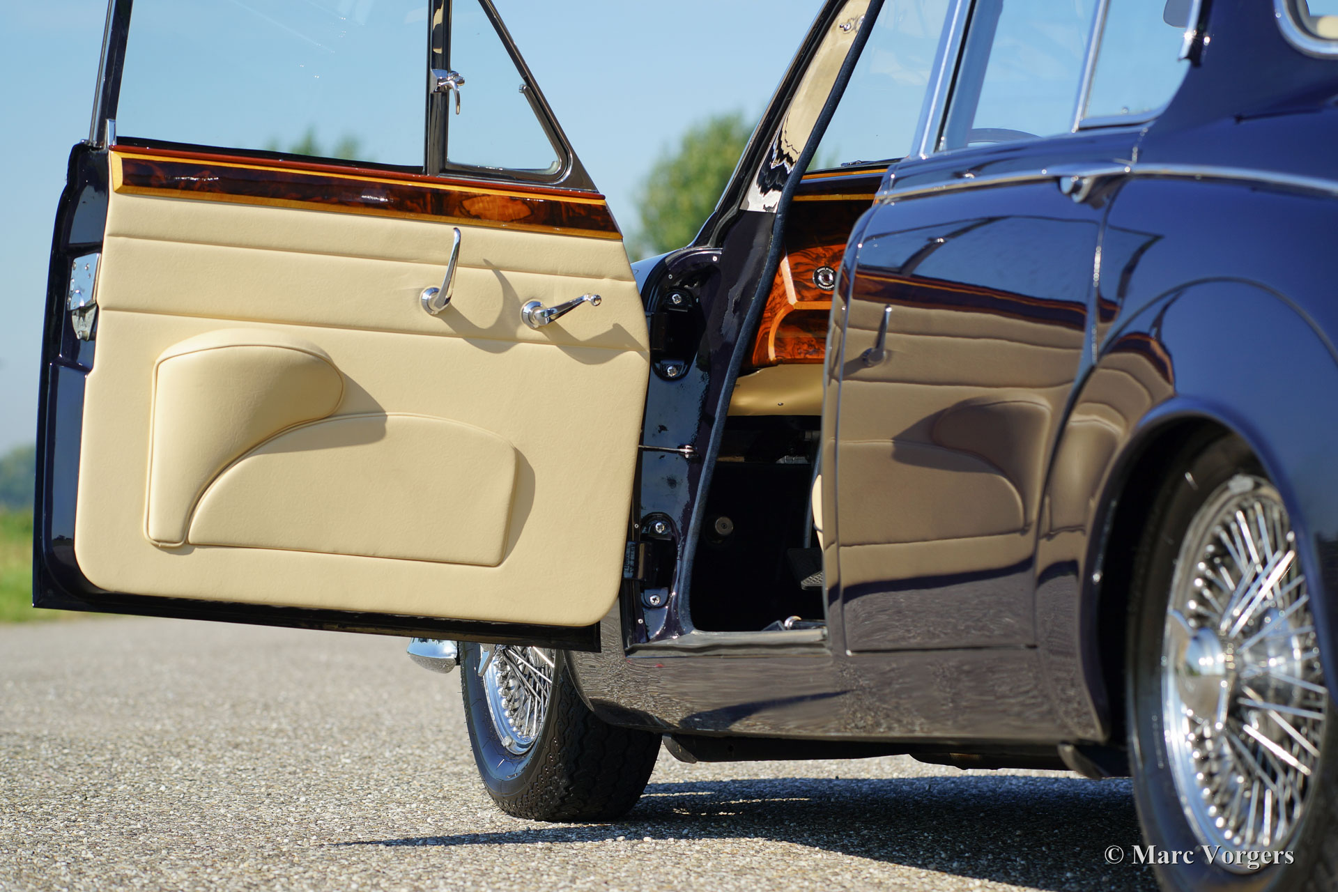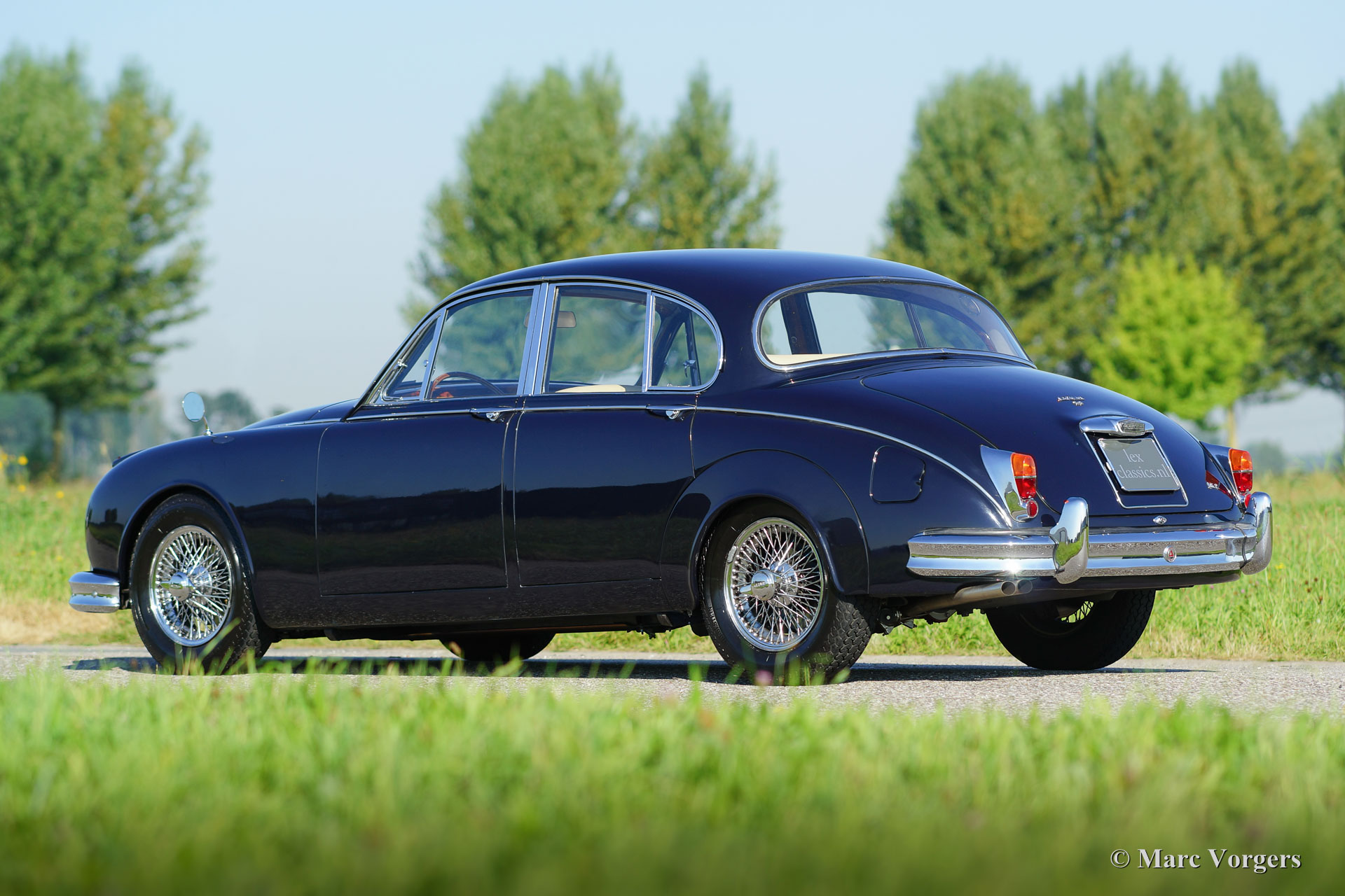 Jaguar Mk II 3.8 Litre, year 1962. Colour dark blue with a Magnolia (light beige) leather interior trimmed with dark blue piping. This beautiful and stylish Jaguar Mk II was extensively and ‘body-off’ restored in the Netherlands. Restoration documentation is present. The body work shows perfect panel fit, superb paint and fantastic chrome; this Jaguar is in superb top-condition! This Mk II is a rarer specimen because it features the most powerful 3.8 Litre engine combined with the manual four-speed gearbox and overdrive; a very desirable package!