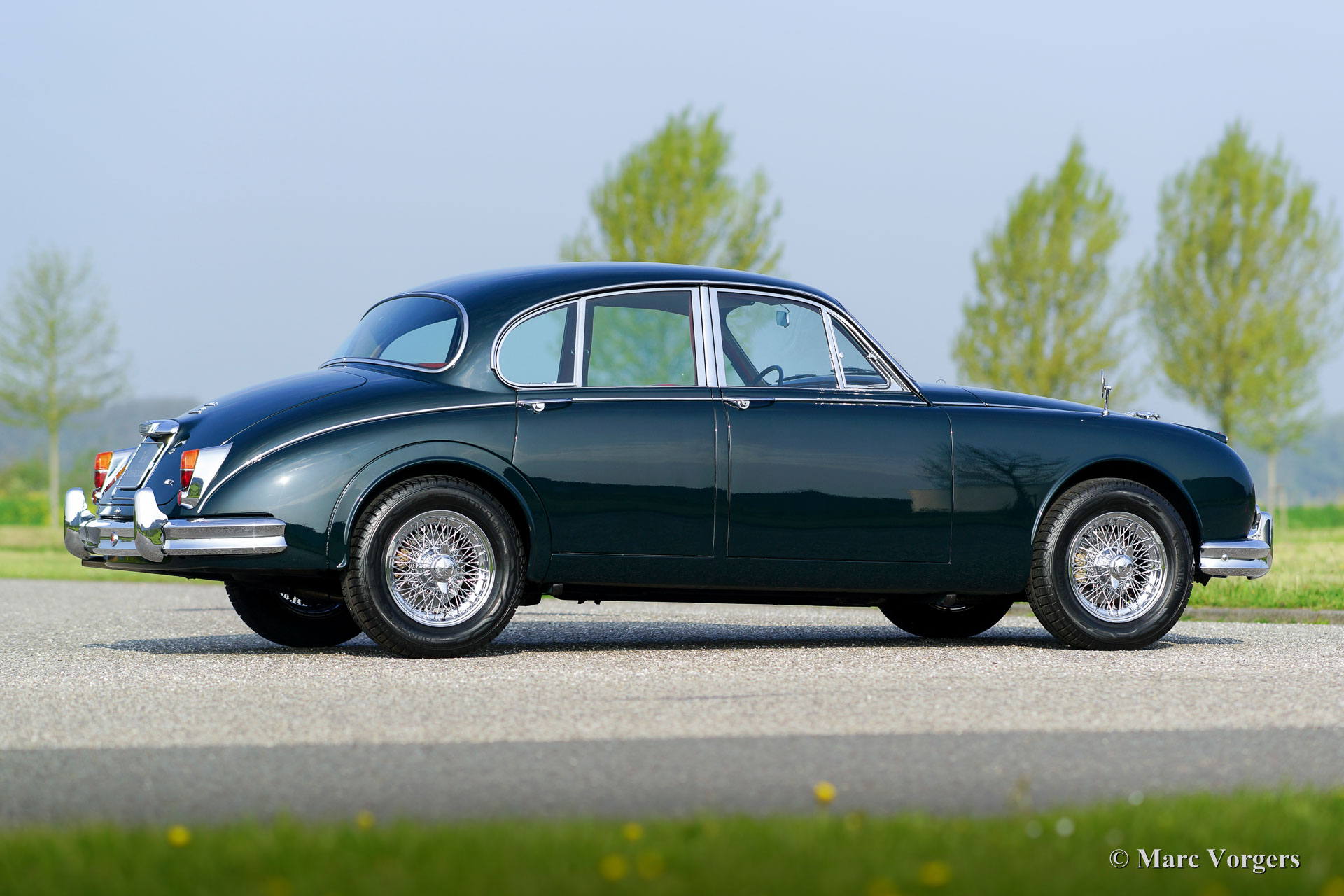 Jaguar Mk II 3.8 Litre, year 1968. Colour British Racing Green with a red leather interior and red carpet. This magnificent Jaguar Mk II was extensively and ‘body-off’ restored in the Netherlands, the Jaguar is in superb top-condition! The 3.8 Litre engine delivers a lot of power and it combines beautifully with the automatic gearbox. The car features chrome wire wheels, chrome ‘knock-off’ wheel nuts, additional driving lamps at the front and two wing mounted rear view mirrors. This is a perfectly driving and utterly stylish Jaguar Mk II!