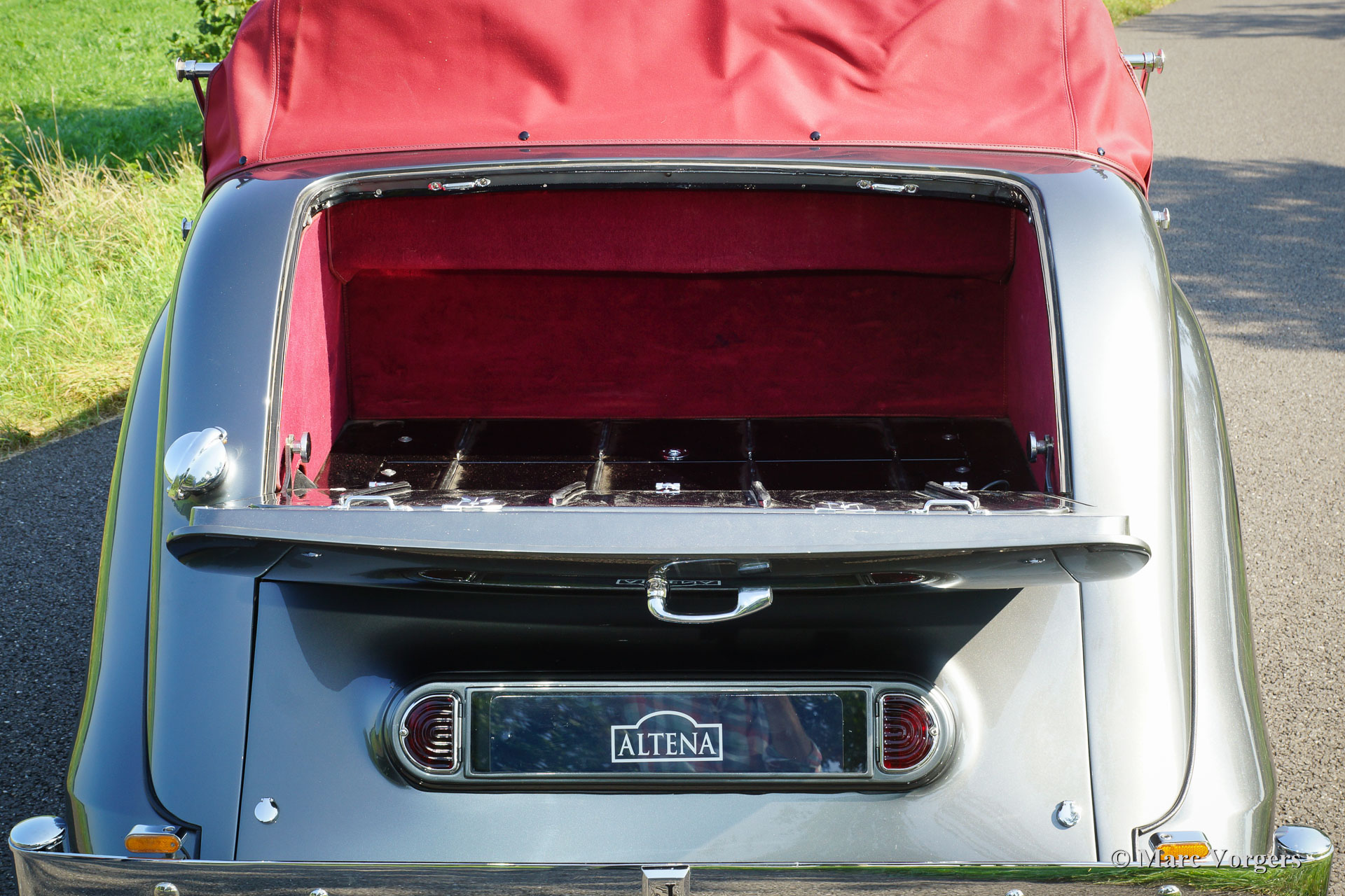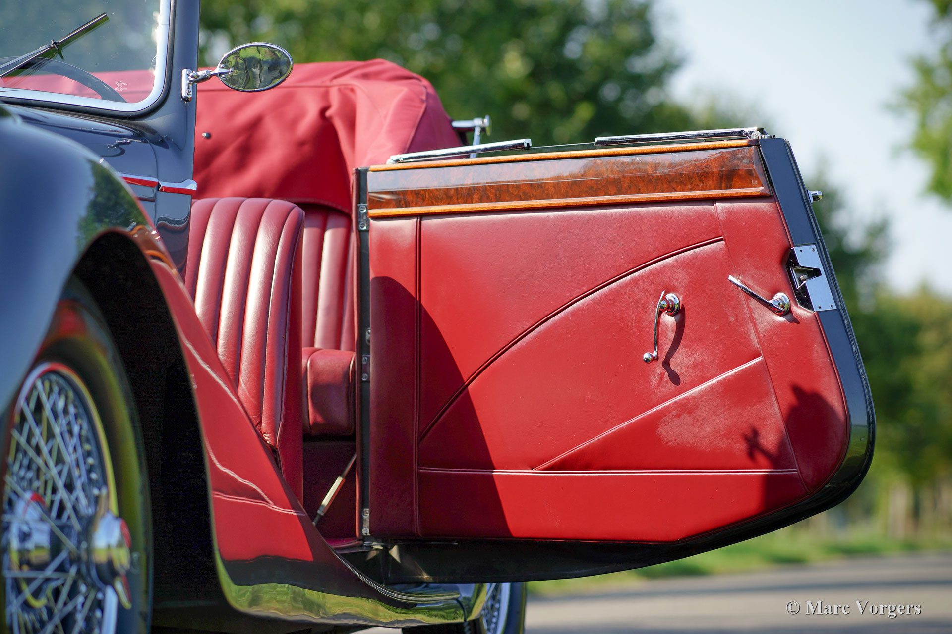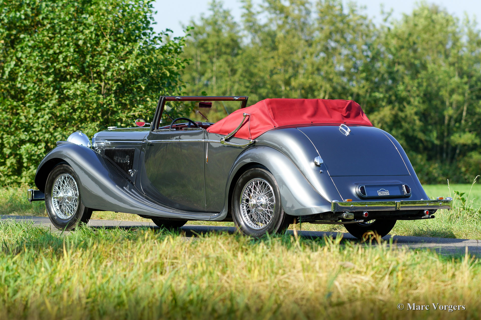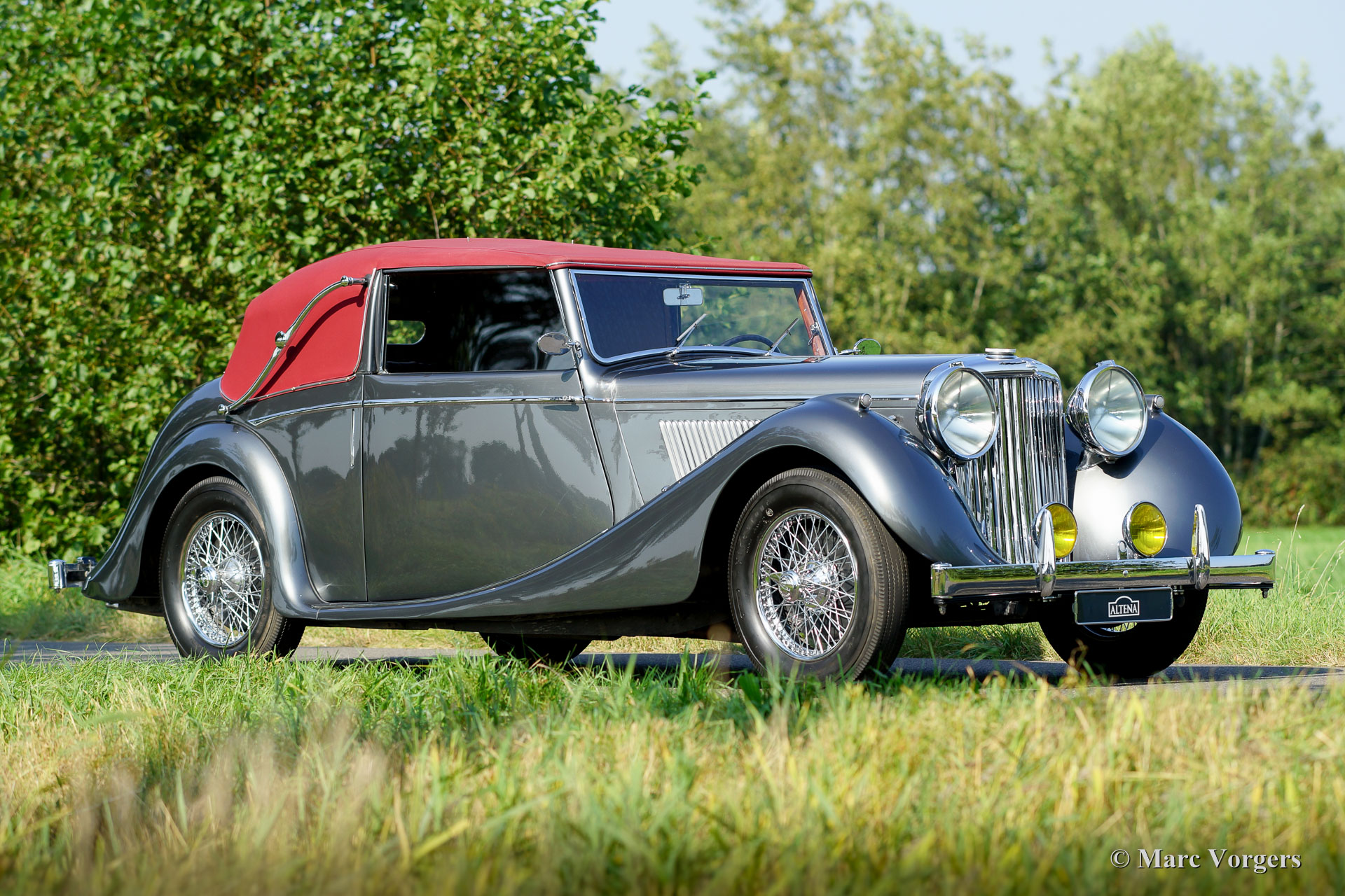 Jaguar Mk IV DHC, year 1948. Chassis number (VIN) 6371XX, body number C116X, engine number SL311X. Colour ‘gun-metal’ grey metallic with a red leather interior and red carpet. Red hood and hood cover. This gorgeous Jaguar Mk IV Drop Head Coupe was extensively and beautifully restored in the past; the automobile is in superb top condition! Since the completion of the restoration the car has driven only 8352 miles. The car is fitted with beautiful chrome wire wheels which complement the magnificent colours of the body work and the interior. The original tool set is present and a pair of fog lamps were added on the front bumper. The hood is a so called ‘three position hood’ which can be used in three positions: fully open, half open and closed. This is a very special Jaguar Mk IV in top condition!