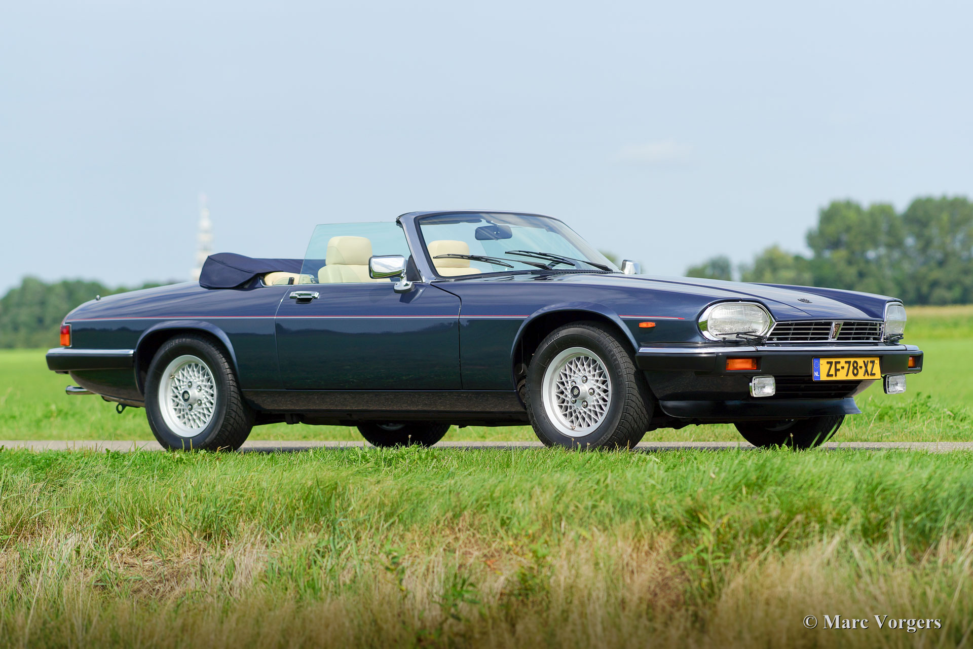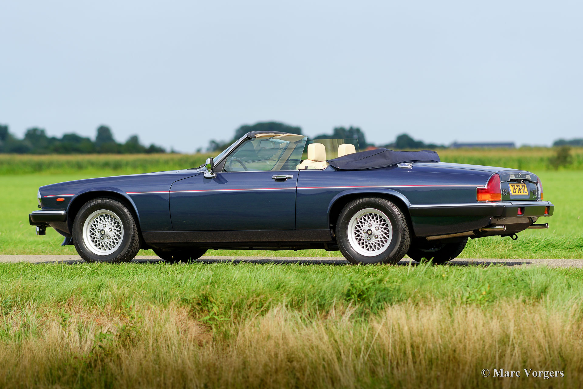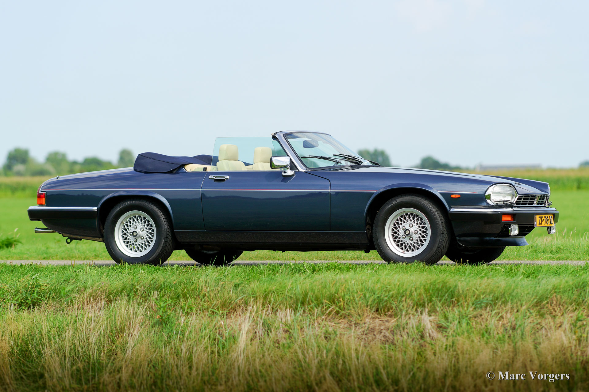 Jaguar XJS Convertible, year 1991. Colour dark blue metallic with a Magnolia (light beige) leather interior and grey carpet. Dark blue mohair convertible top and hood cover. This fabulous Jaguar XJS was sold new in the Netherlands by the official Jaguar representative Cito Motors in Eindhoven. This firm also serviced the car over the years. The automobile comes from the second owner and the car drove only 36.340 kilometres from new! The owner manual and the stamped service booklet are present. This Jaguar XJS is in superb original condition, like new; concours! The XJS features an automatic gearbox and the legendary Jaguar V12 engine; this XJS drives impressively!