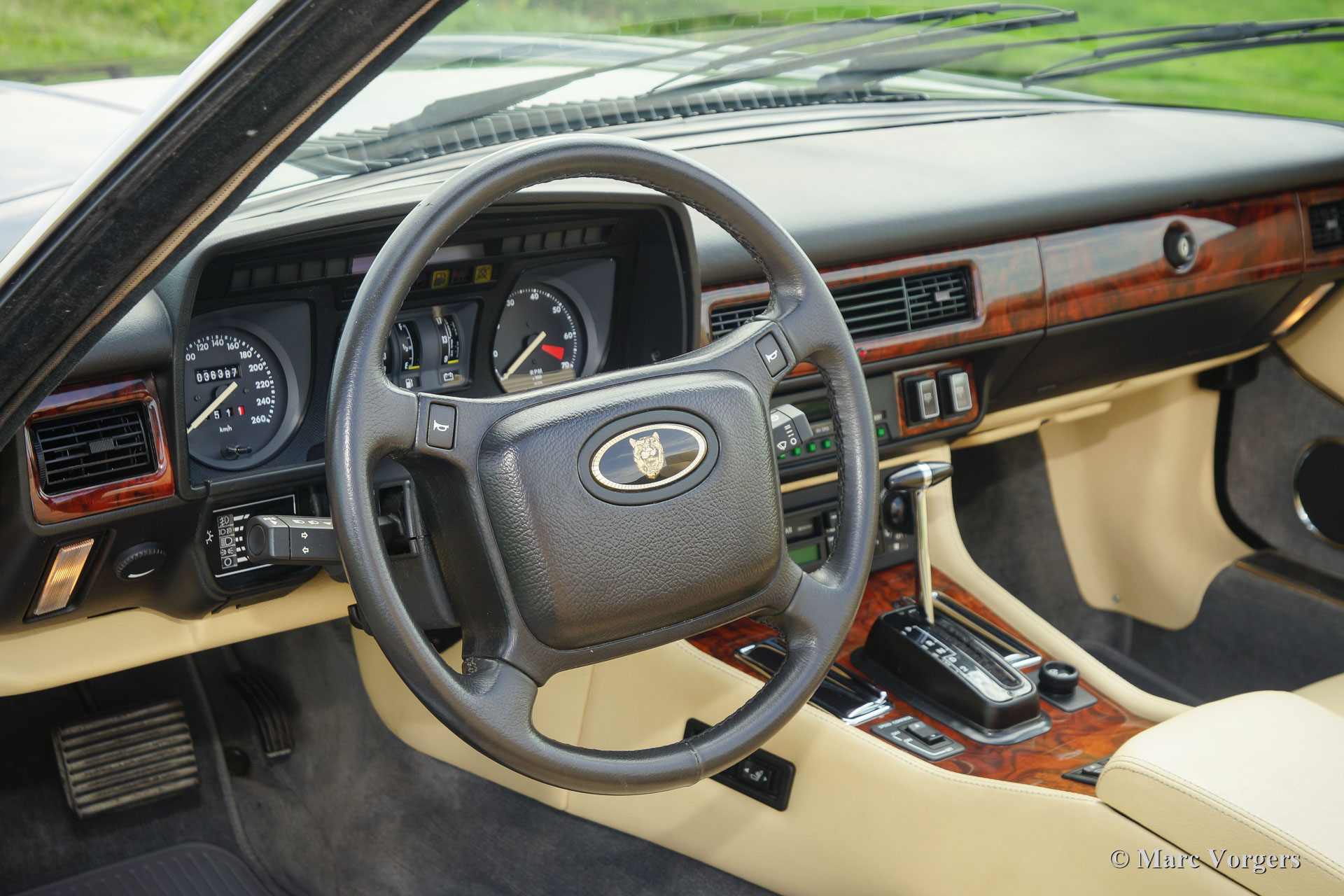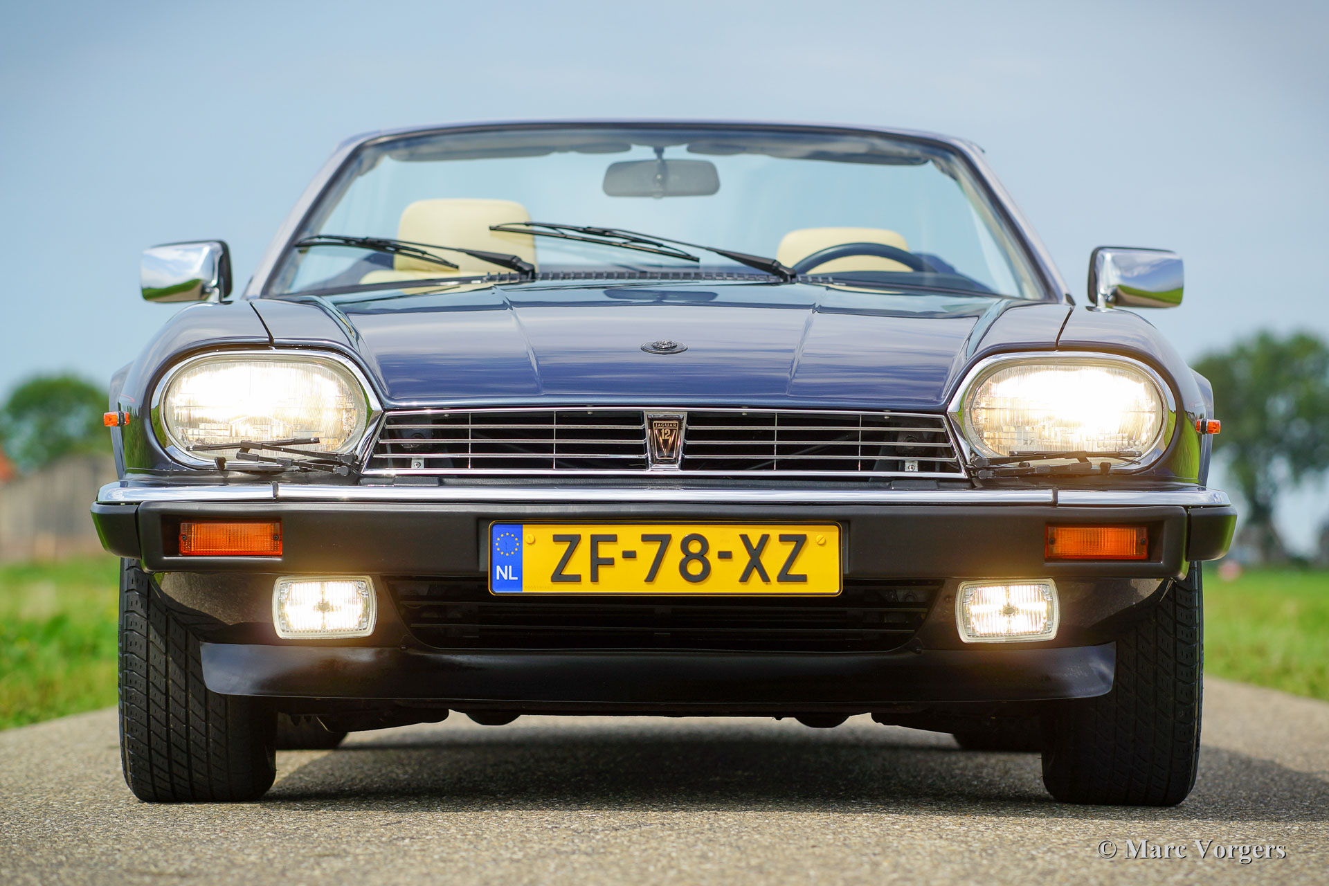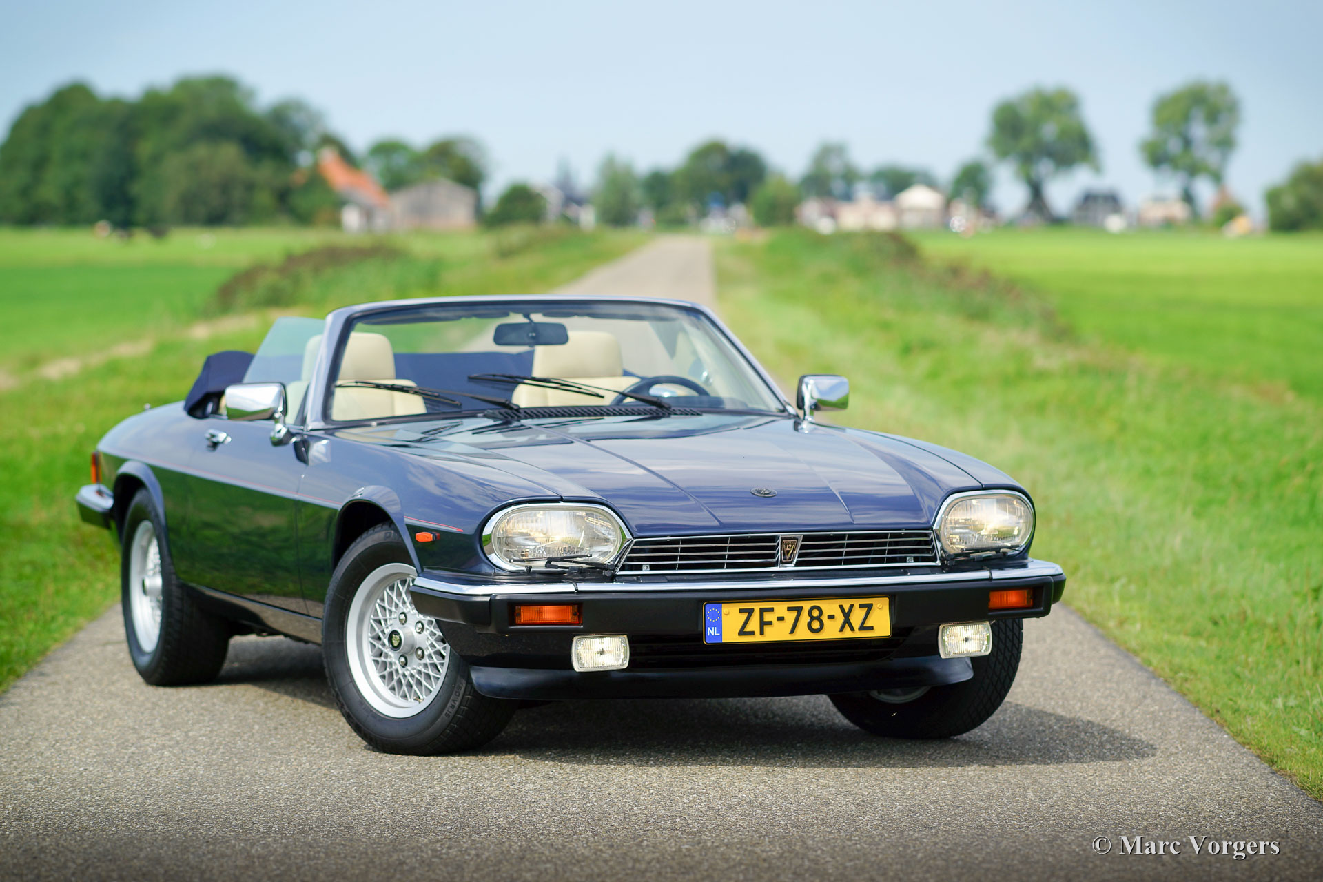 Jaguar XJS Convertible, year 1991. Colour dark blue metallic with a Magnolia (light beige) leather interior and grey carpet. Dark blue mohair convertible top and hood cover. This fabulous Jaguar XJS was sold new in the Netherlands by the official Jaguar representative Cito Motors in Eindhoven. This firm also serviced the car over the years. The automobile comes from the second owner and the car drove only 36.340 kilometres from new! The owner manual and the stamped service booklet are present. This Jaguar XJS is in superb original condition, like new; concours! The XJS features an automatic gearbox and the legendary Jaguar V12 engine; this XJS drives impressively!