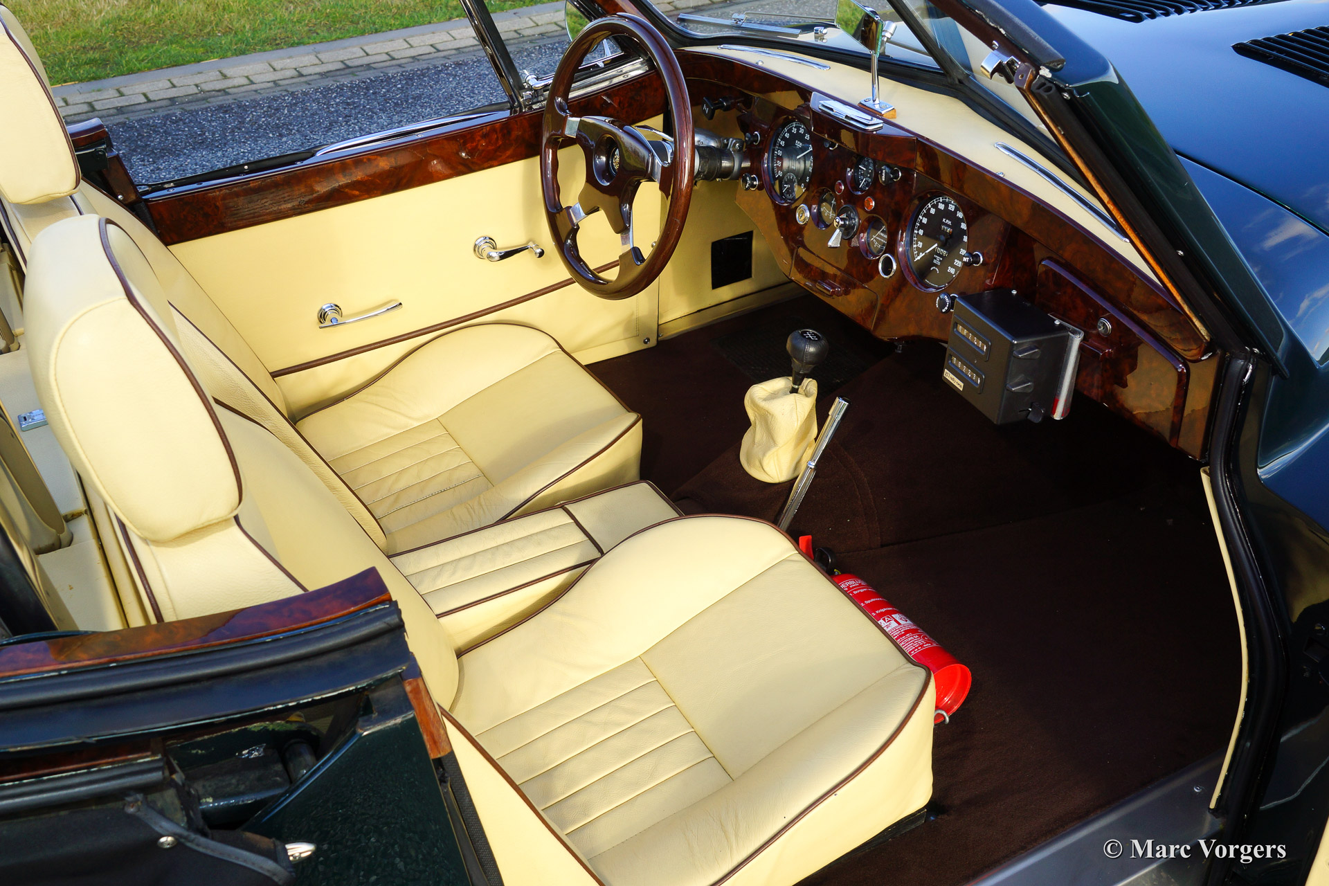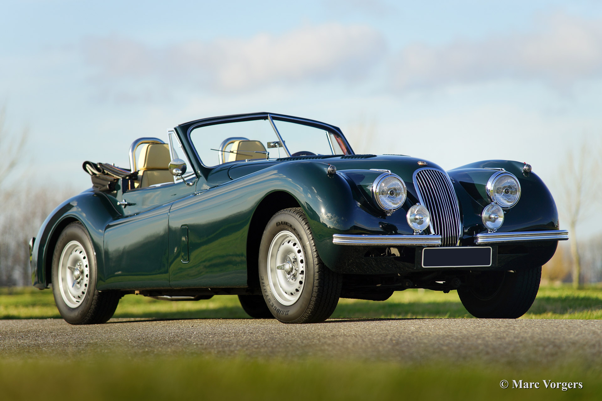 Jaguar XK 120 Drophead Coupe (DHC), year 1954. Chassis number: 678302, engine number: NAI242-8 and 7365-8. Colour British Racing Green with a beige leather interior trimmed with brown piping. Brown carpet. Black mohair soft top. This car was originally sold new in the Netherlands, the old linen registration 'paper' is still present. This fabulous Jaguar XK 120 was extensively restored in the year 2004. The automobile is in superb (excellent+) condition! Additionally some modifications were carried out to improve safety and reliability. Improvements: 'S' cylinderhead, 'fast road' camshafts, more precise XK 150 steering, Getrag 5-speed manual gearbox, special rollbars, special leather seats, 4-point safety harnesses, GTI rally twin, a louvered bonnet for improved cooling, 123 electronic ignition, 2 inch 'sand-cast' carburettors, Dunlop alloy wheels, additional driving lamps at front and a special steering wheel. This masculine XK 120 drives fantastic!