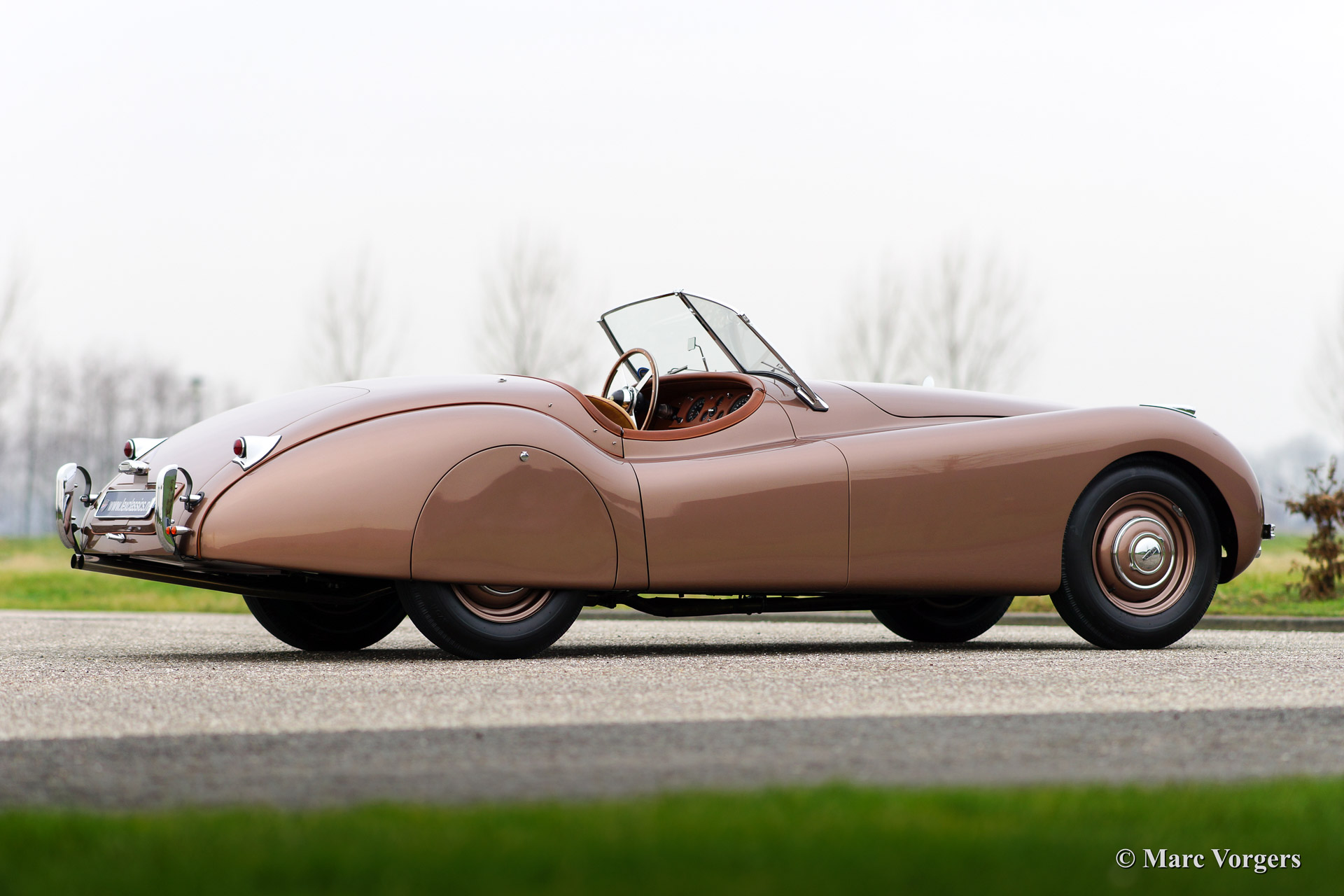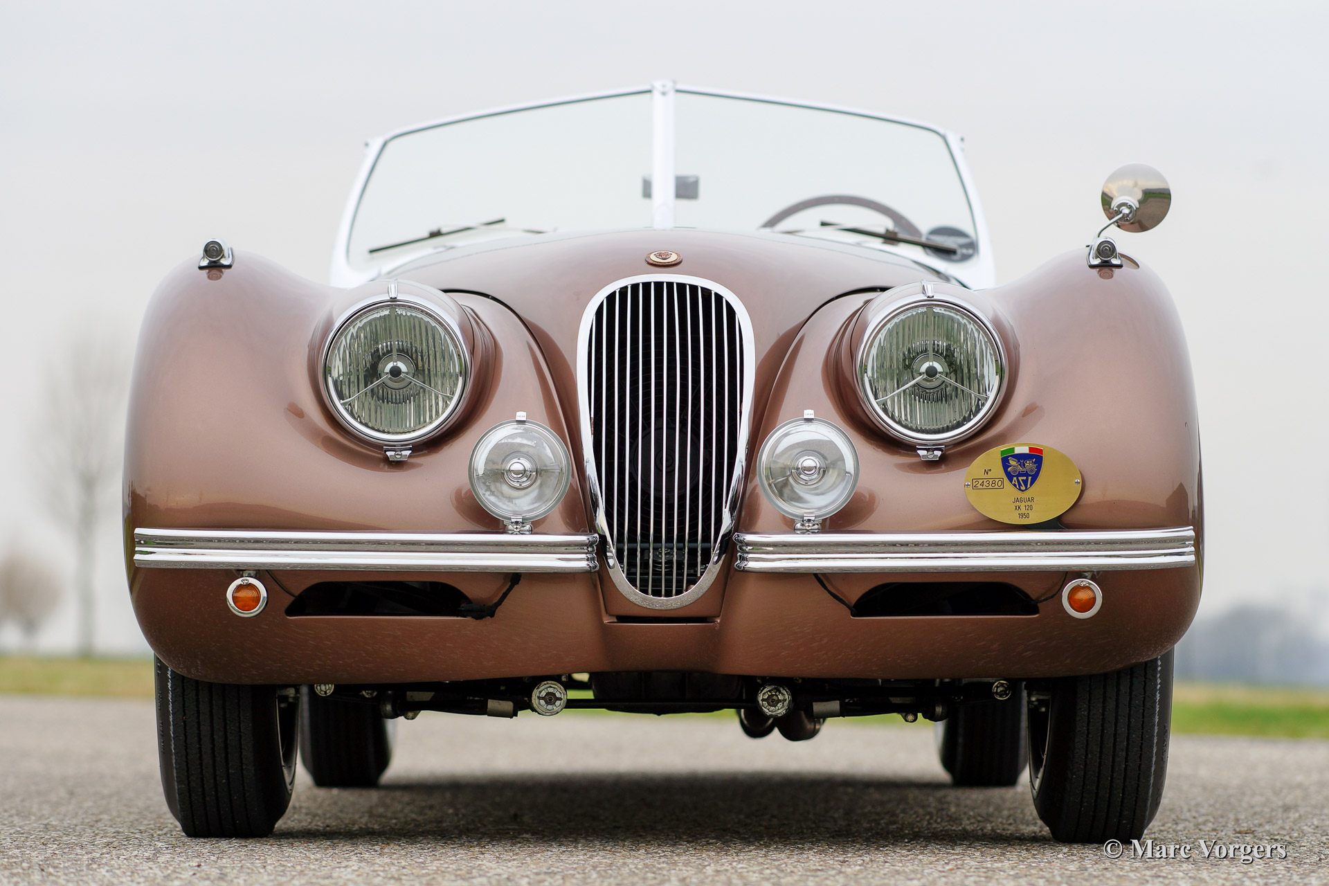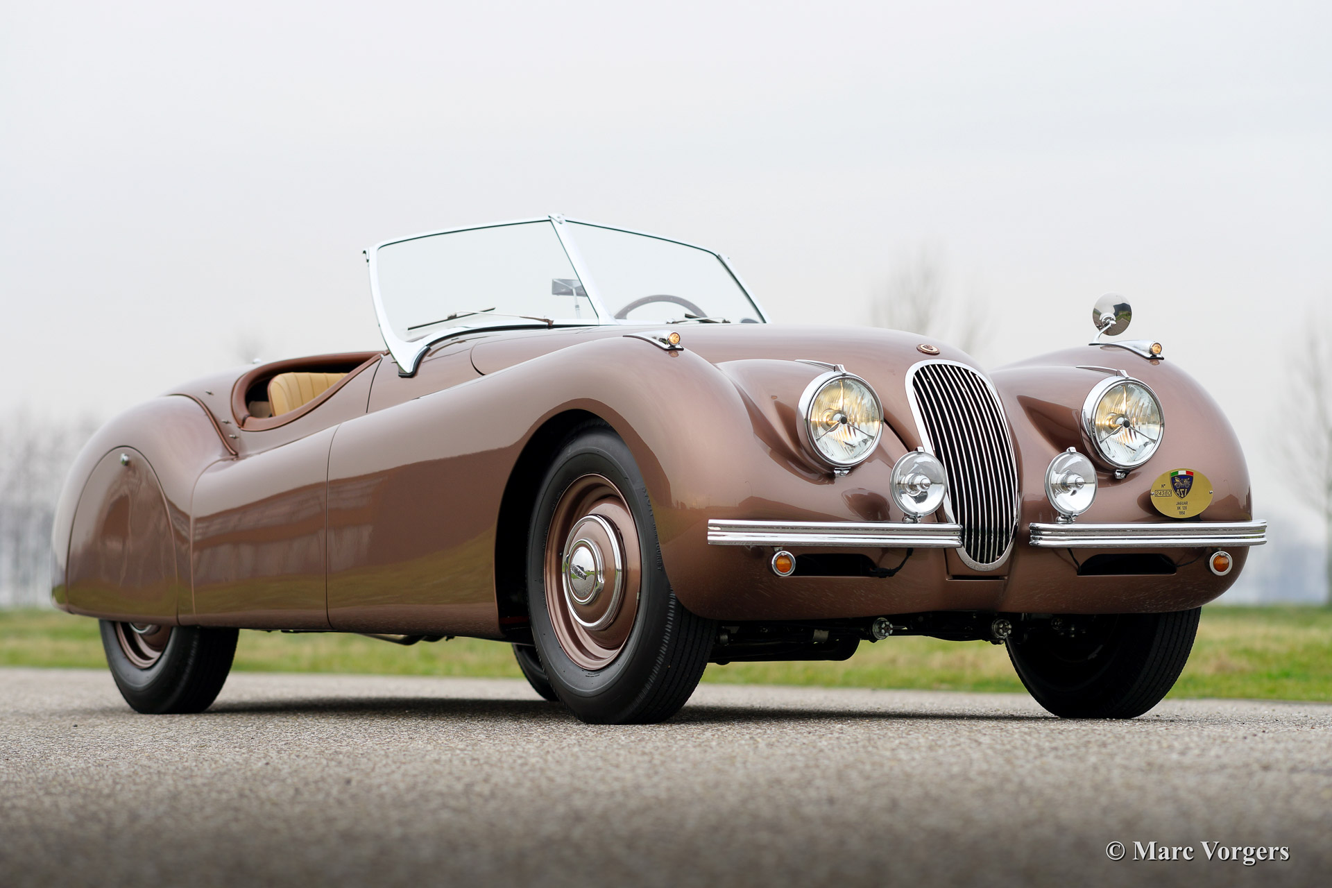 Jaguar XK 120 OTS (Open Two Seater / roadster), year 1950. Chassis number 670612, engine number W 1351-8. Colour bronze with a biscuit/tan leather interior. This early metal body Jaguar XK 120 was extensively and perfectly 'body off restored' a few years ago. The automobile is in concourse (show) condition. A Heritage certificate is present; this is a 'matching numbers' car. This XK 120 shows fantastic original details like the disc wheels and the 'spats' over the rear wheels. Furthermore the car is fitted with additional spot lamps at front and a beautiful 4-spoke steering wheel with wood rim. The rare polished metal lamps on the front wings were only fitted to the scarce aluminium bodied cars and to the earliest XK's with metal body work. This tremendous Jaguar XK 120 roadster has participated in the Mille Miglia Storiche in the years 2009, 2011 and 2012 and in the Gran Premio Nuvolari in the hands of a well-known Italian business man. This fine Jaguar comes beautifully documented. This car is a perfect investment and this car bring the chance to obtain a starting place in the famous Italian Mille Miglia.