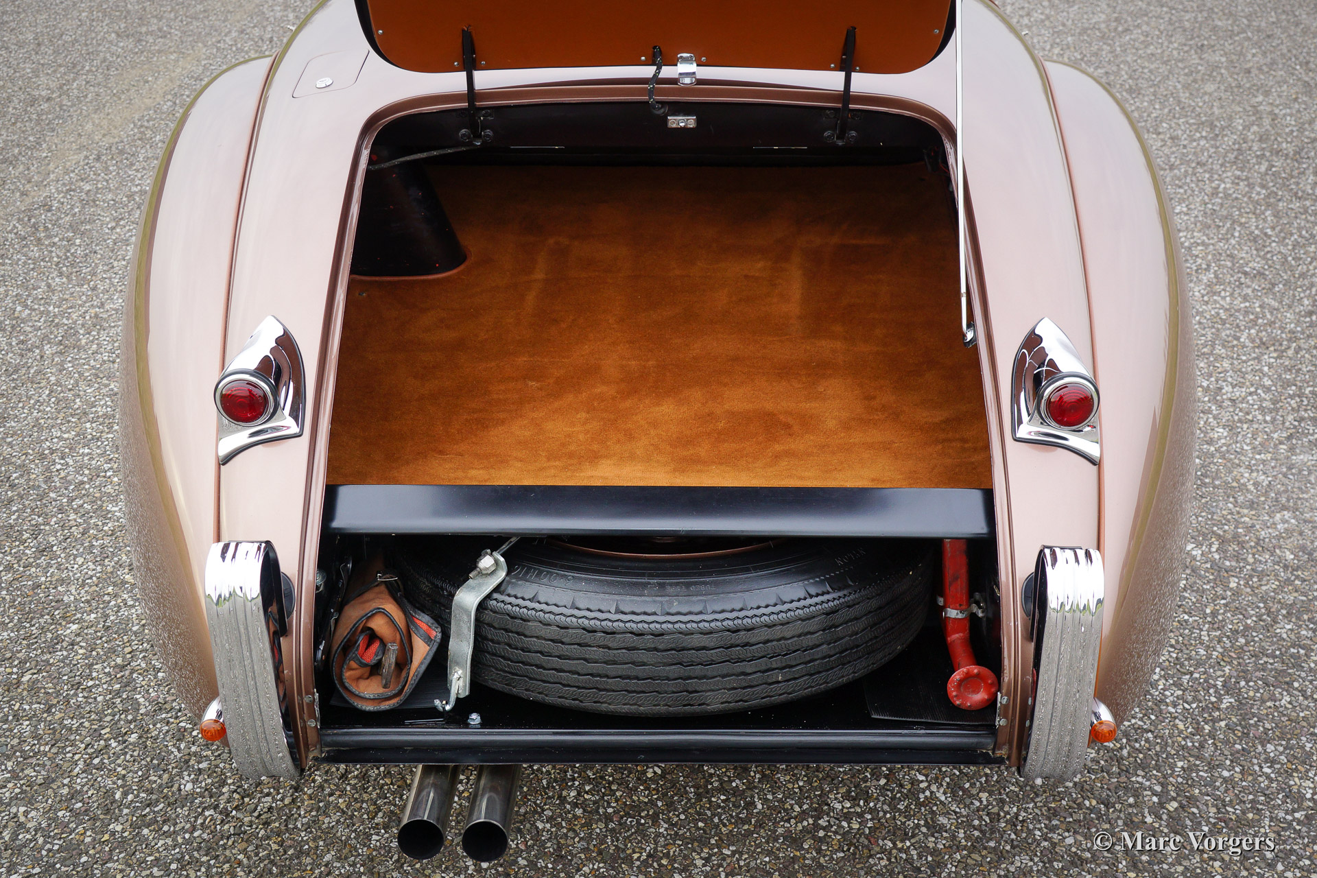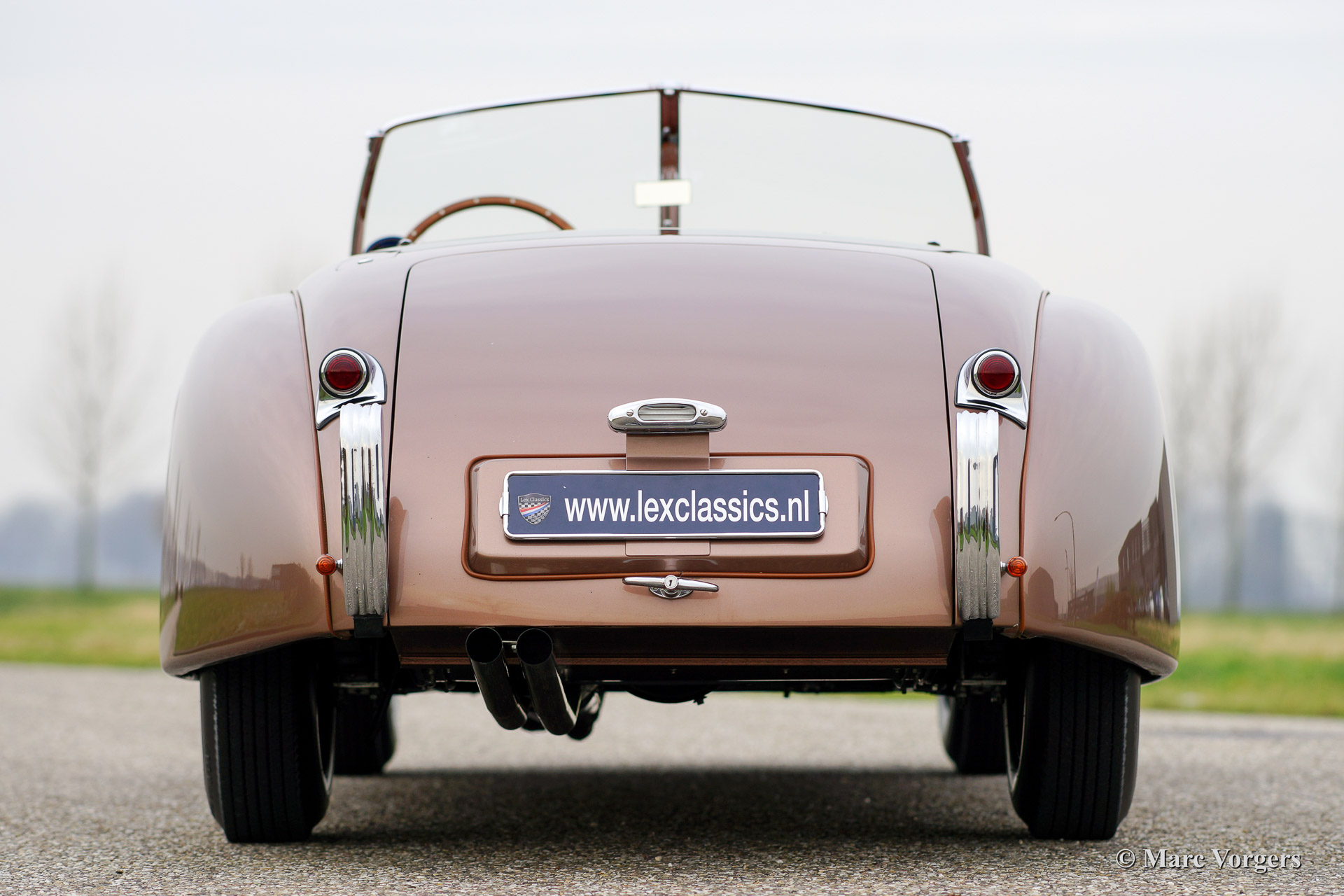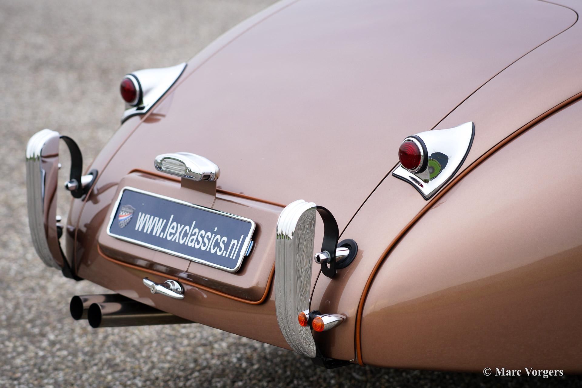 Jaguar XK 120 OTS (Open Two Seater / roadster), year 1950. Chassis number 670612, engine number W 1351-8. Colour bronze with a biscuit/tan leather interior. This early metal body Jaguar XK 120 was extensively and perfectly 'body off restored' a few years ago. The automobile is in concourse (show) condition. A Heritage certificate is present; this is a 'matching numbers' car. This XK 120 shows fantastic original details like the disc wheels and the 'spats' over the rear wheels. Furthermore the car is fitted with additional spot lamps at front and a beautiful 4-spoke steering wheel with wood rim. The rare polished metal lamps on the front wings were only fitted to the scarce aluminium bodied cars and to the earliest XK's with metal body work. This tremendous Jaguar XK 120 roadster has participated in the Mille Miglia Storiche in the years 2009, 2011 and 2012 and in the Gran Premio Nuvolari in the hands of a well-known Italian business man. This fine Jaguar comes beautifully documented. This car is a perfect investment and this car bring the chance to obtain a starting place in the famous Italian Mille Miglia.