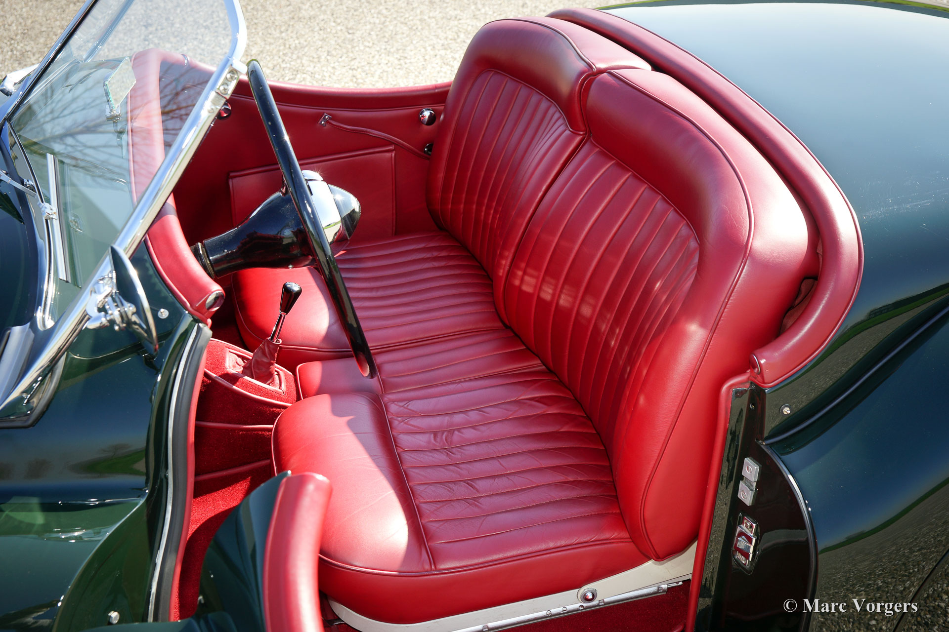 Jaguar XK 120 OTS (roadster), year 1951. Colour dark British Racing Green with a red leather interior. This fabulous and top-restored Jaguar XK 120 was sold new in New York, USA, by Jaguar representative Hoffmann on 22 May 1951. The car was fully and ‘body-off’ restored by Lex classics in the years 2002 – 2008. This fine Jaguar XK 120 roadster is in concours (show) condition! The bodywork shows a perfect panel fit, top class paint work and a perfectly upholstered leather interior. During the overhaul the six-cylinder engine was modified to run on lead free petrol. A photo reportage of the restoration is present. The automobile has ‘matching numbers’, a Heritage certificate to confirm this is present. Very special are the period accessories like the complete tool-set, trunks in the boot, original brochure, handbook and service manual. Also an original price list of Hoffmann New York is present. This is a magnificent TOP-example