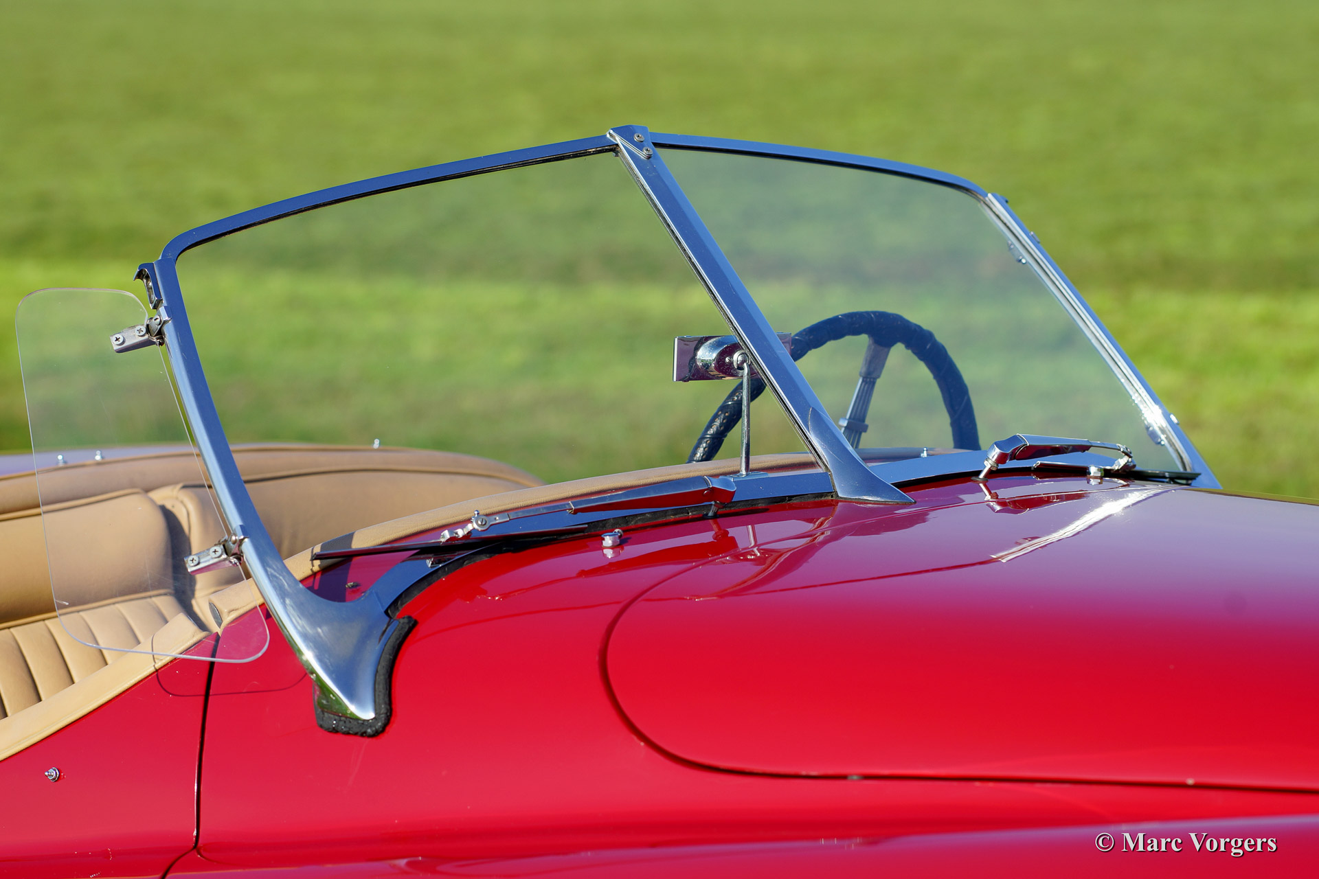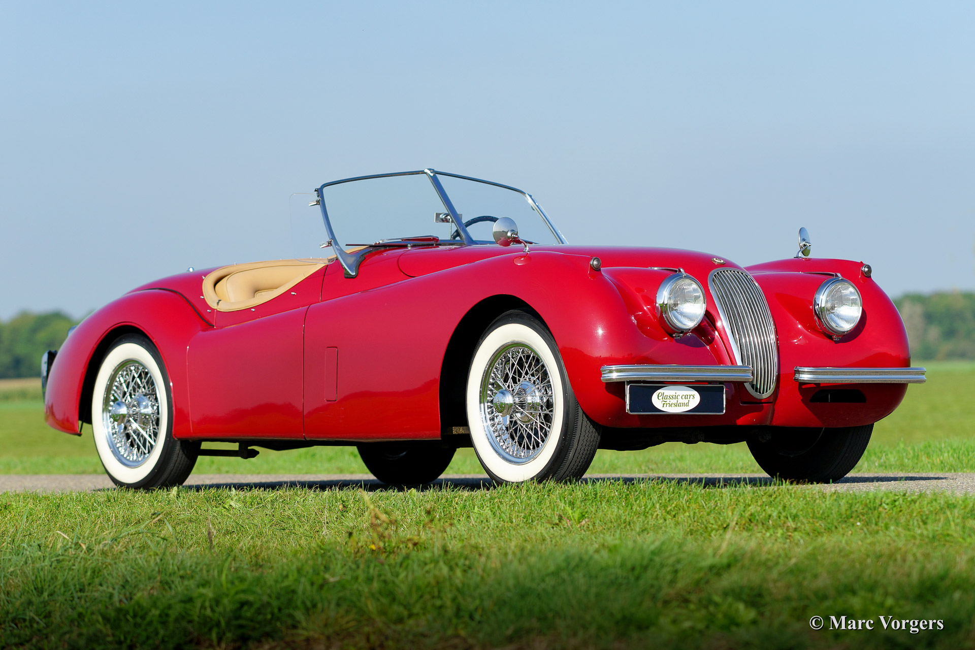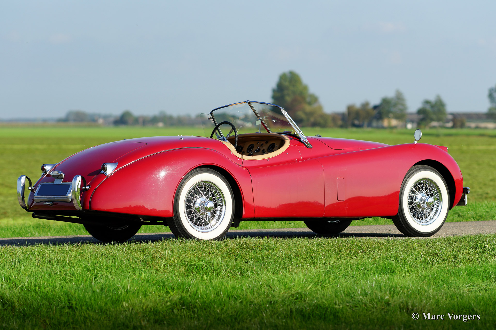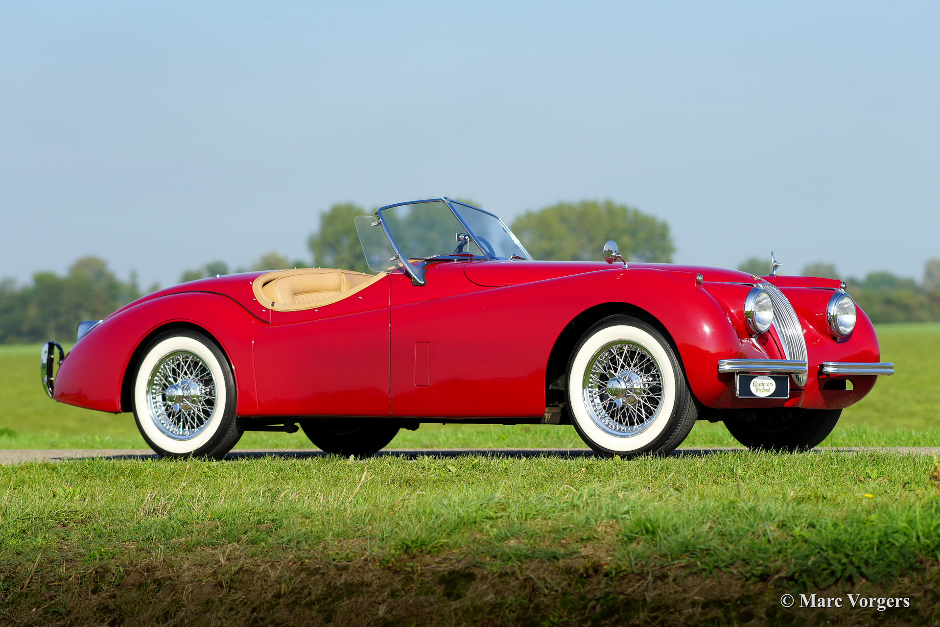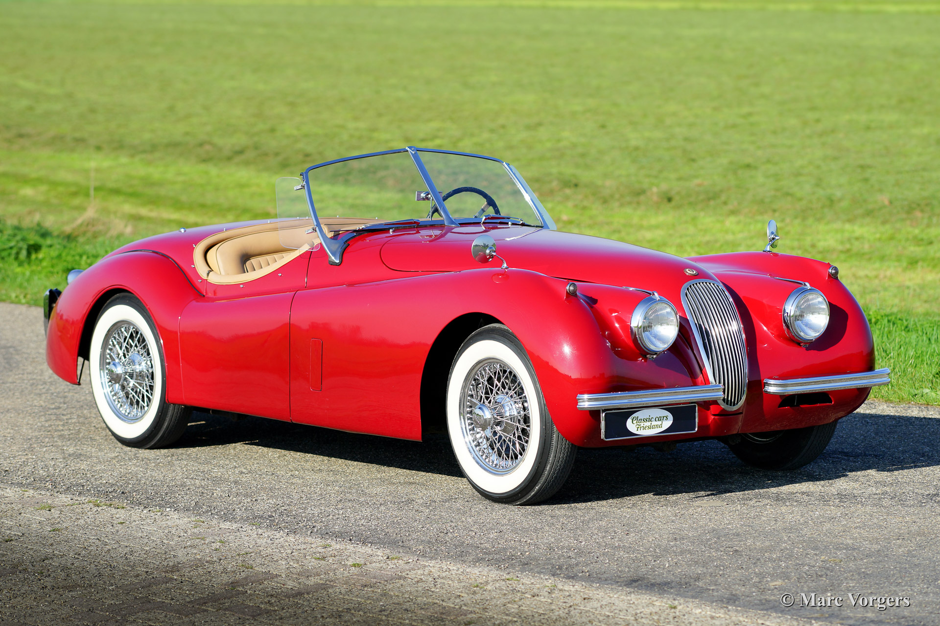 Jaguar XK 120 OTS (roadster), year 1954. Colour red with a beige leather interior. Beige mohair soft top and side screens. This fabulous looking and driving XK 120 roadster is in very good to excellent condition. The engine has been overhauled. The automobile features chrome wire wheels, white side-wall tyres, Stainless Steel exhaust, an aluminium petrol tank, an aluminium shift knob and a fantastic Brooklands style steering wheel. This beauty shows off crisp body lines and a dashing total appearance! Magnificent driver currently road registered in the Netherlands.