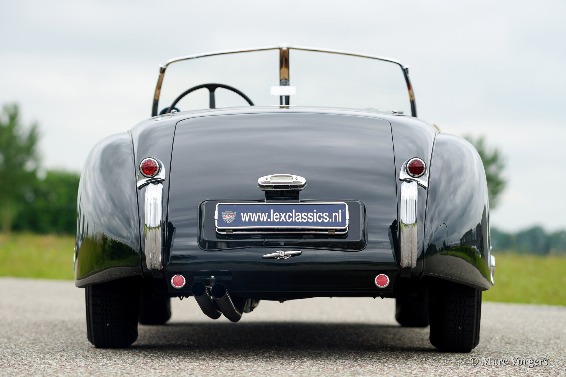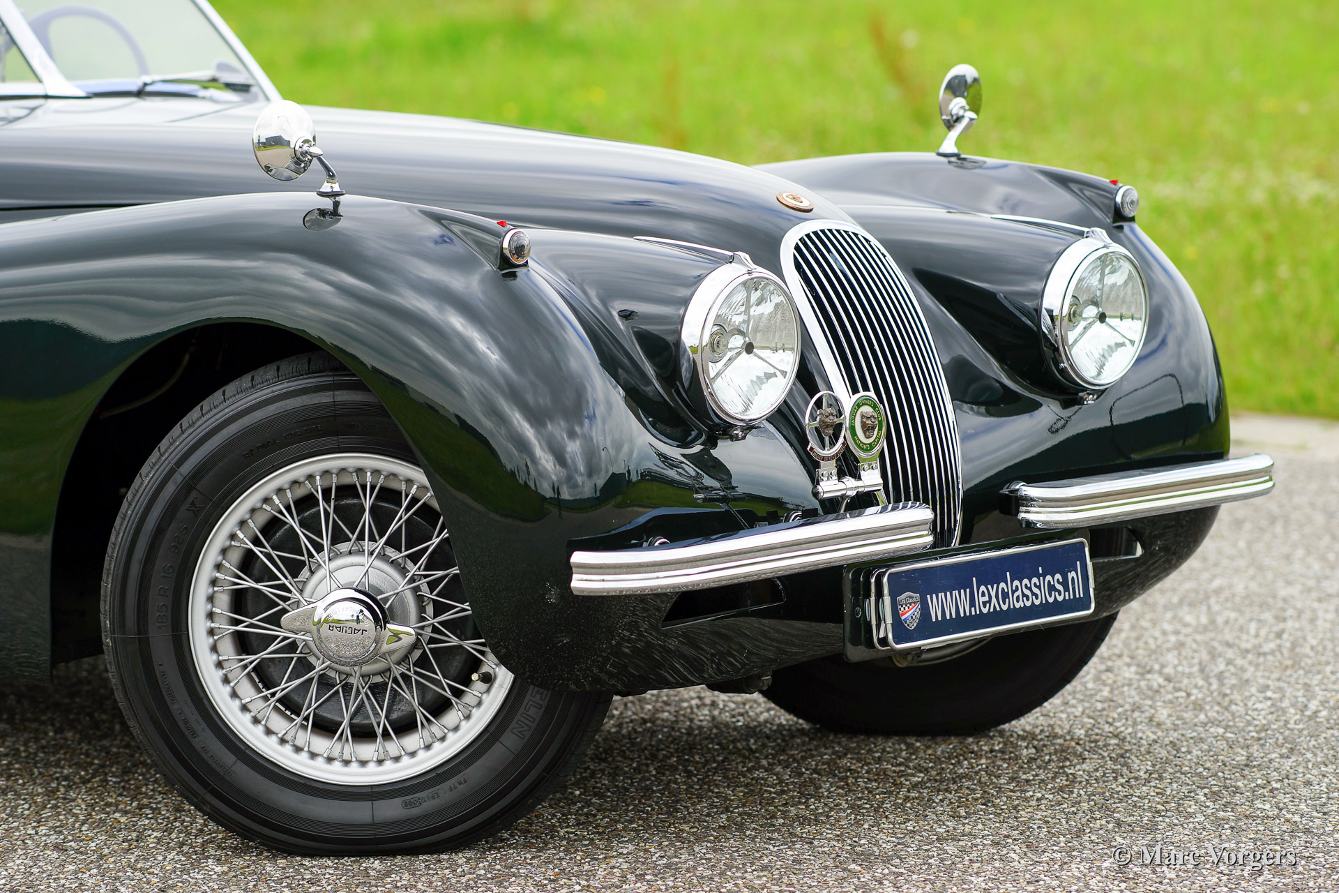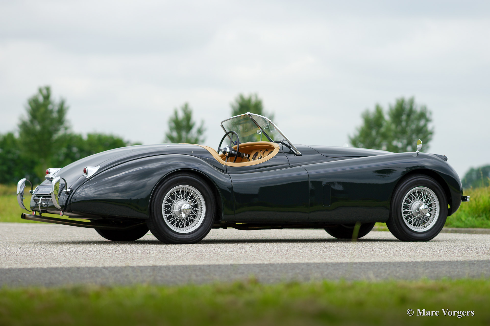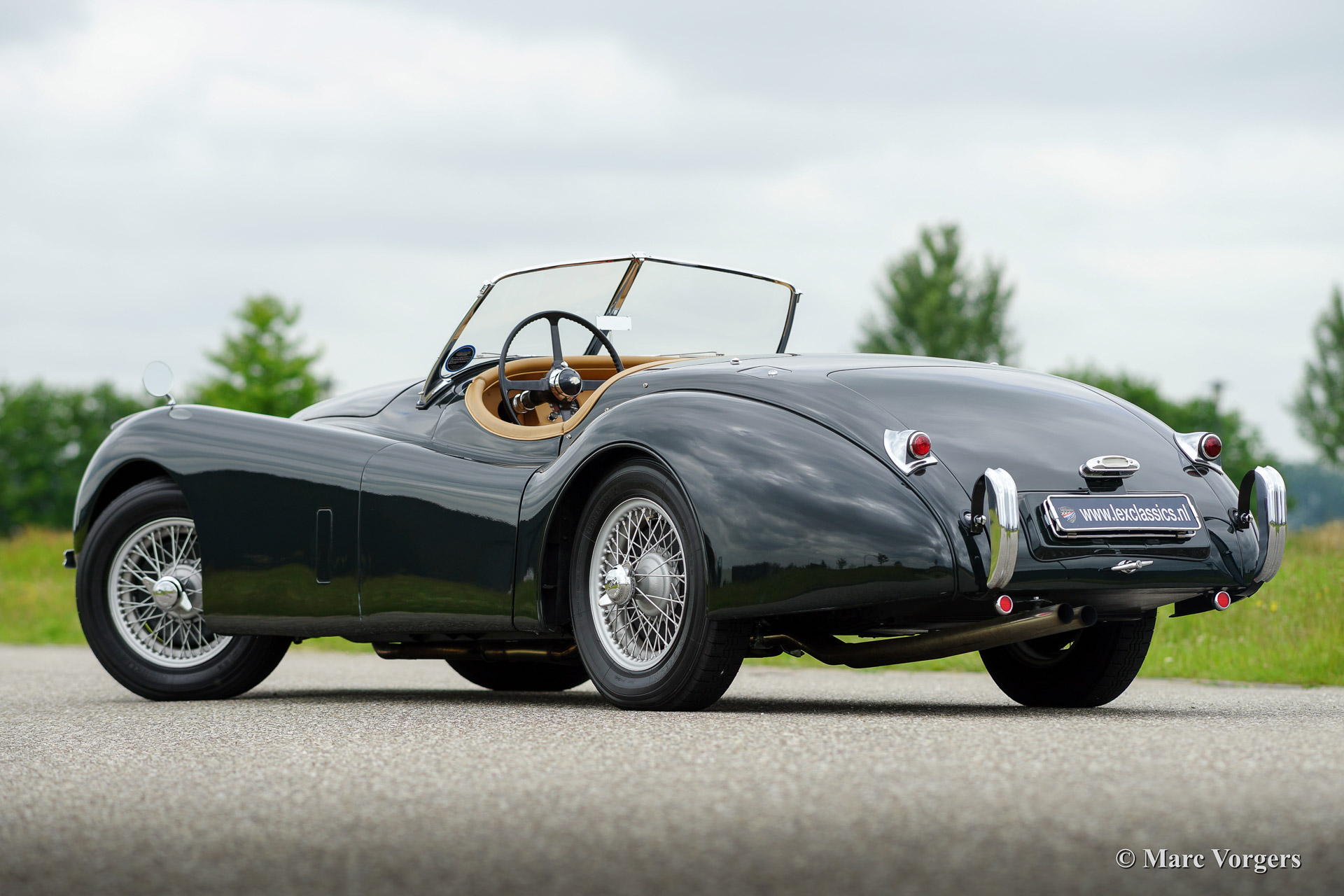 Jaguar XK 120 SE Open Two Seater (OTS/roadster), year 1954. Chassis number: S 674647. Colour British Racing Green with a beige leather interior. This fabulous Jaguar XK 120 SE roadster was sold new in the USA. This is a rare factory original Special Equipment (SE) model fitted with the more powerful engine. The automobile was imported to the Netherlands in the year 2003. The car was extensively restored, a photo reportage and documents of the restoration are present. In 2013 the XK 120 was registered and driven fro the first time. The car is in superb (excellent++) condition, concours! The automobile features silver enameled (54 spokes) wire wheels, a badge bar, tripod headlamps, a Stainless Steel exhaust system, Kenlow cooling fan, tool roll, tyre pump, crick and a grease gun. This magnificent Jaguar XK 120 SE OTS drives superbly!