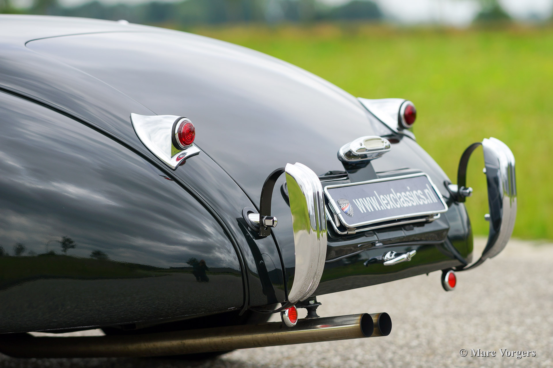 The Jaguar XK 120 was introduced in 1948, and caused an immediate sensation. The XK 120 had a top speed of 120 miles an hour (about. 200 km/h) and was the fastest production car for sale at that time. The XK 120 was designed by Jaguar’s boss and founder William Lyons. The bodywork had an almost sculptural design, with sober, well-chosen flowing lines and beautiful curves. With its exquisite long bonnet and elongated wing lines, the XK 120 has a very dynamic charisma.