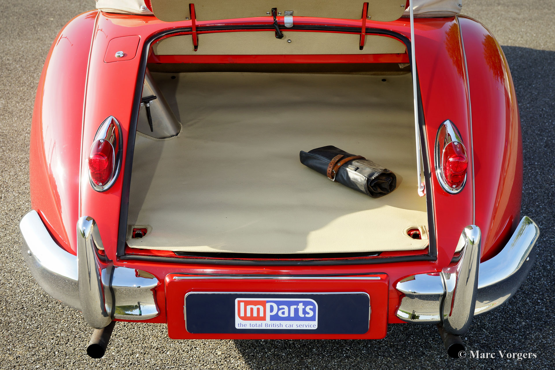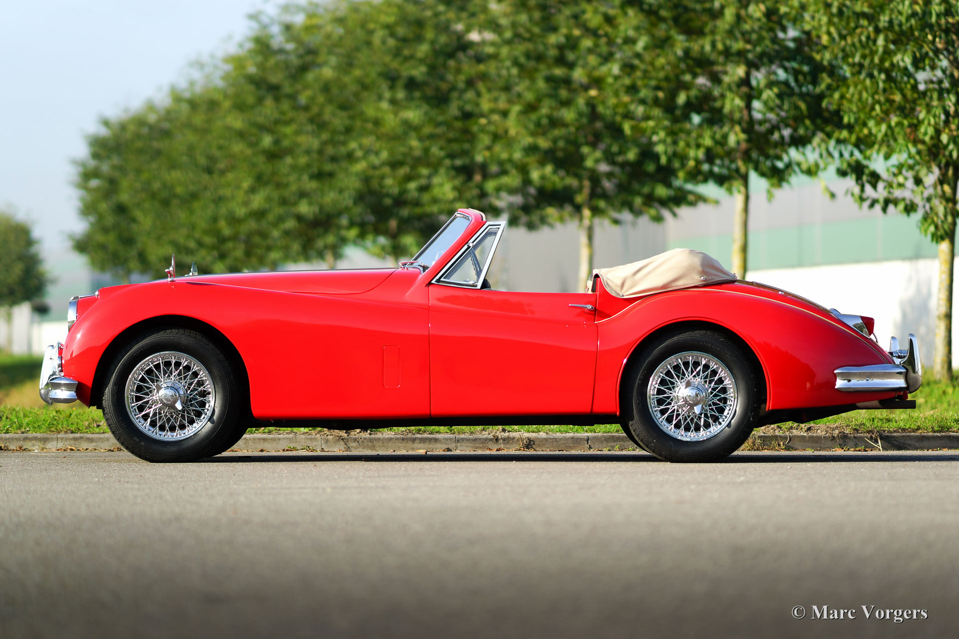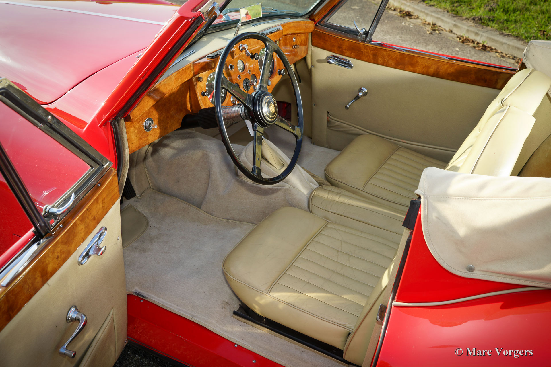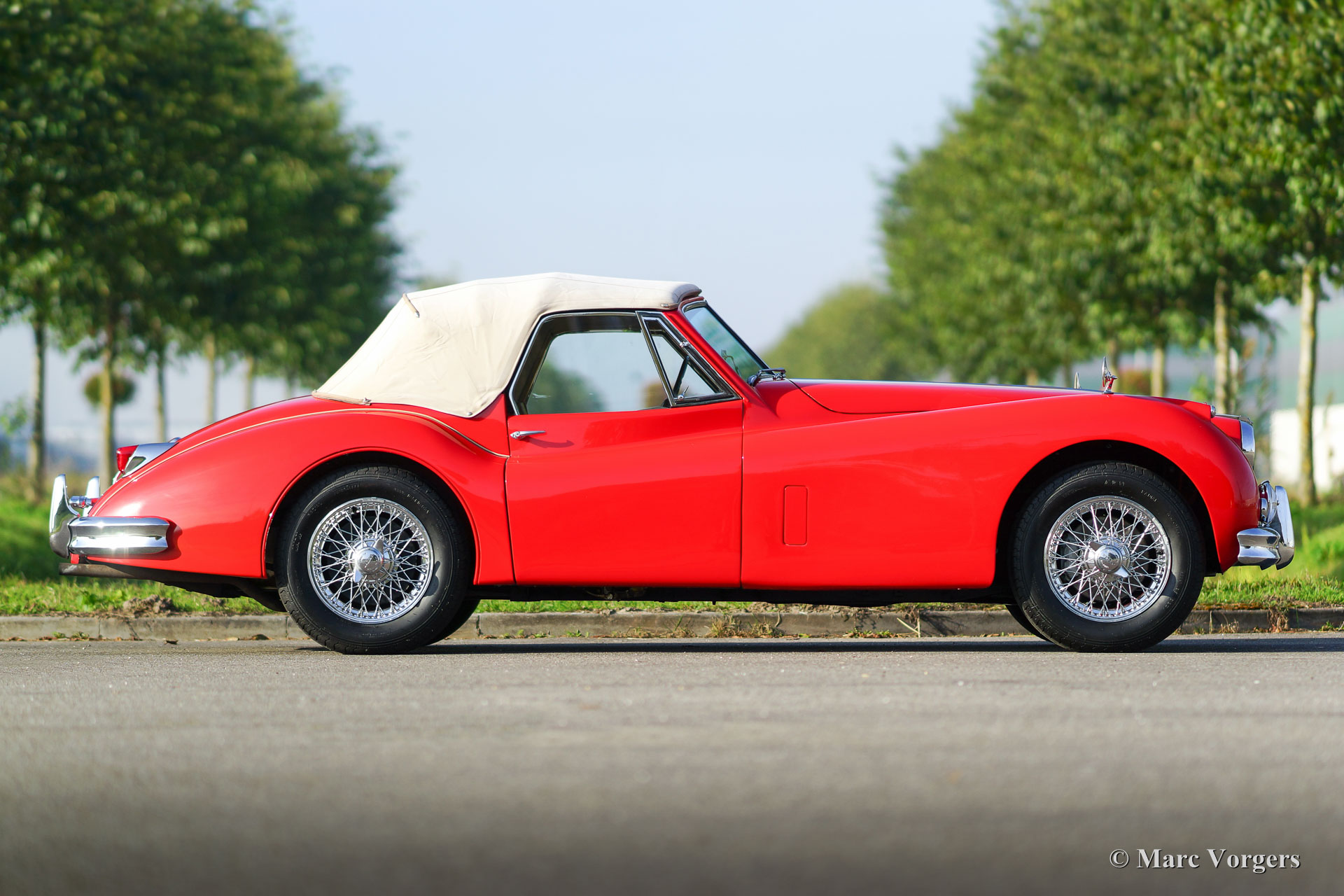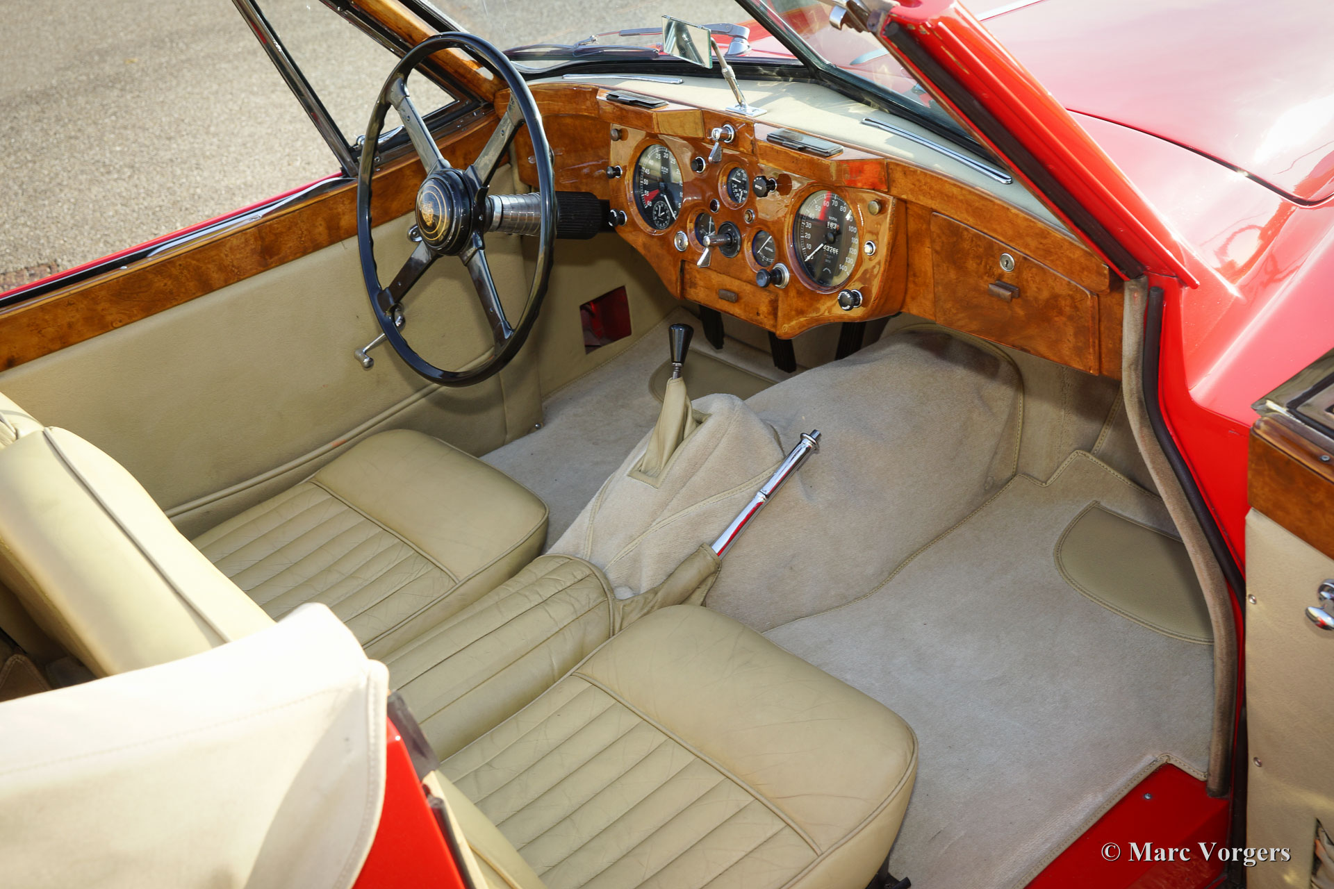 Jaguar XK 140 3.4 Litre (SE) DHC, year 1956. Colour red with a beige leather interior and beige carpet. Beige hood and hood cover. This majestic Jaguar XK 140 SE Drophead Coupe (DHC) is in very good to excellent condition and the car drives perfectly. Only 2310 left hand drive XK 140 DHC models have been built. The car features a manually operated gearbox, chrome wire wheels and disc brakes at the front wheels.