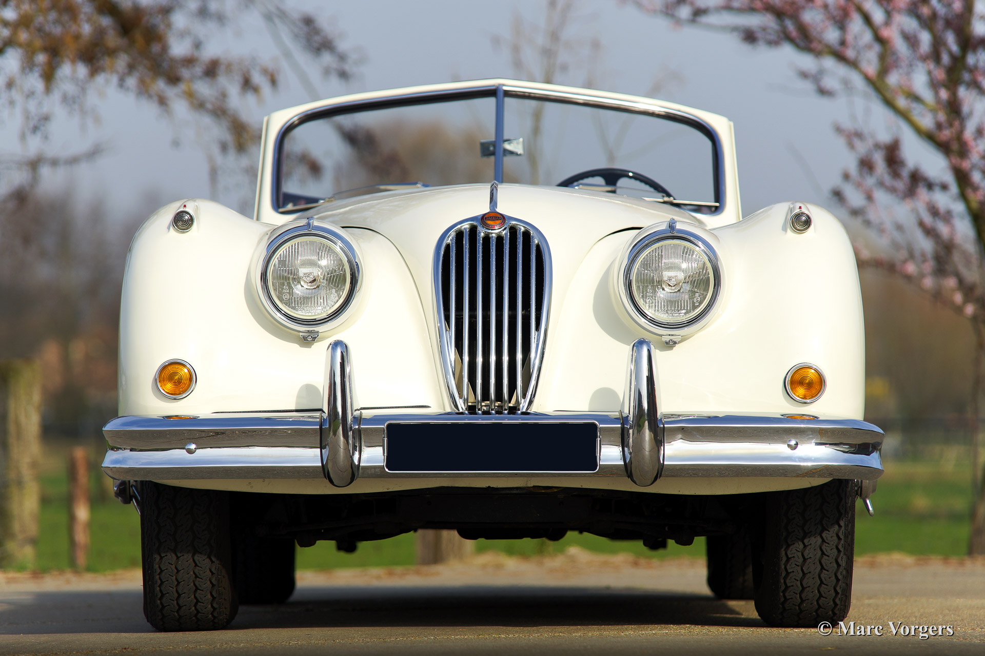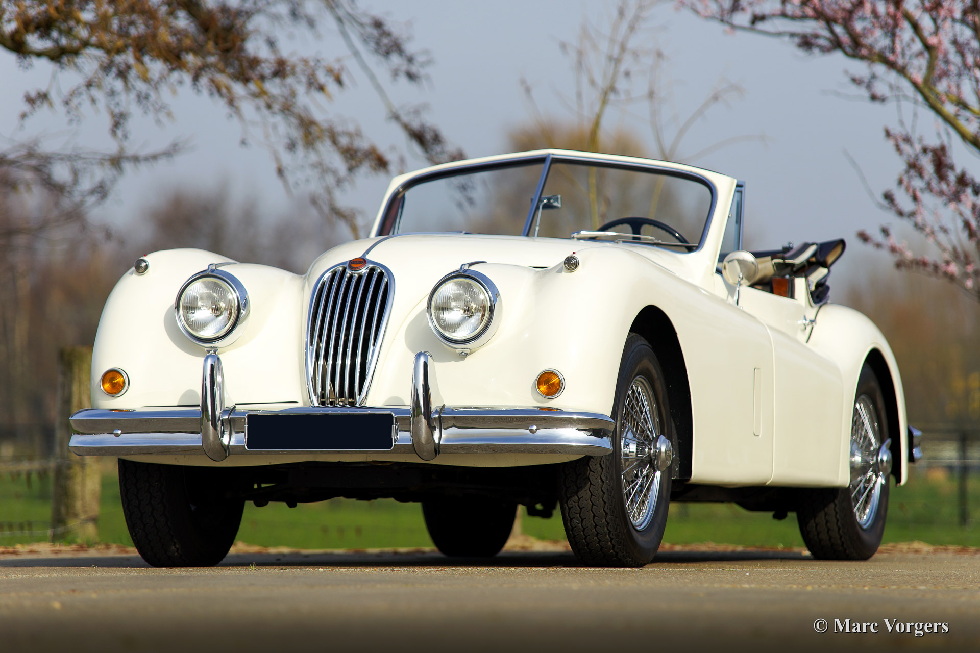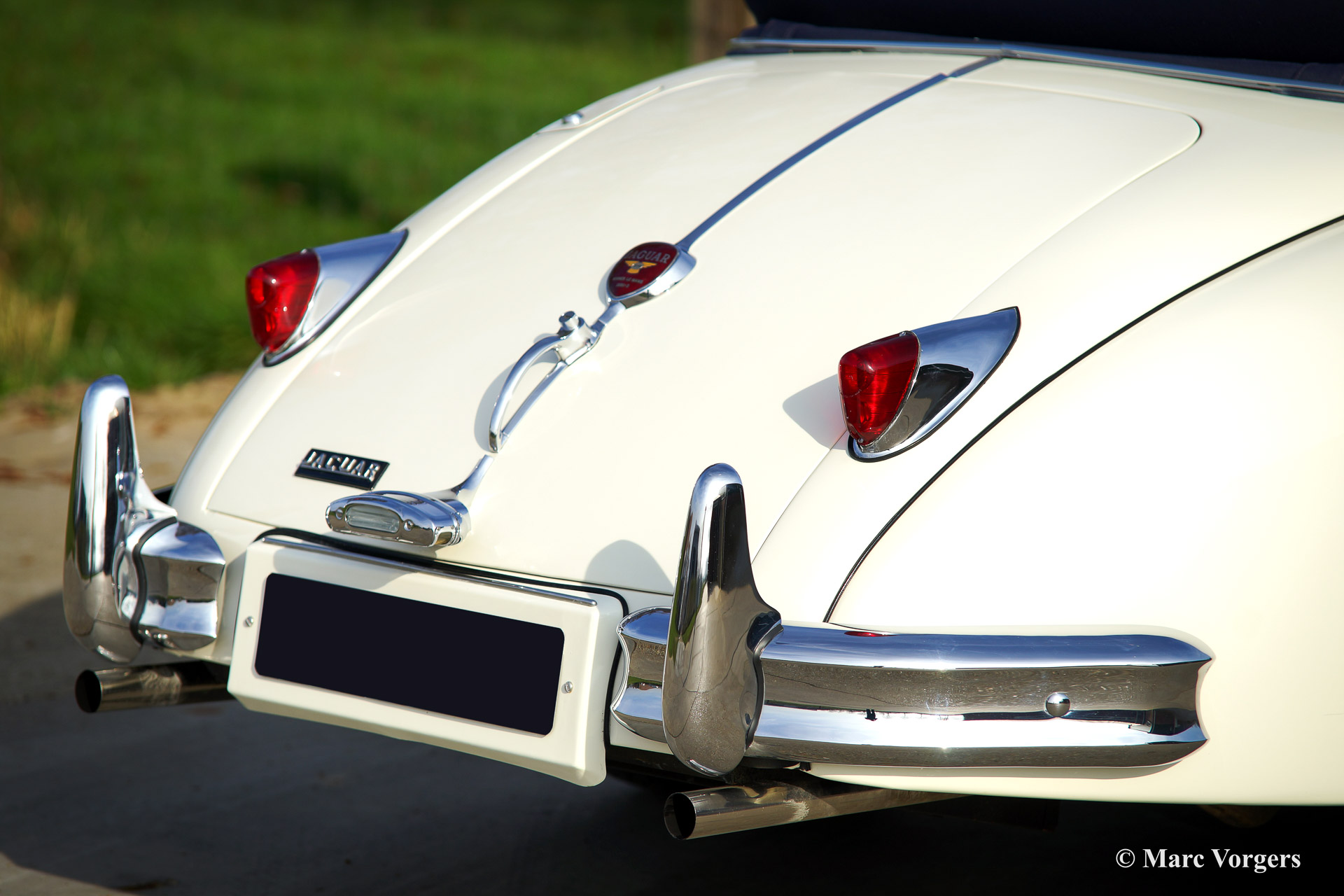Jaguar XK 140 3.4 Litre DHC (Drophead Coupe), year 1956. Chassis number 818391, engine number G6995-8, 'matching numbers'. Colour Glacier White with a dark blue leather interior and dark blue carpet. Dark blue mohair hood. This fantastic Jaguar XK 140 DHC was extensively restored in the Netherlands about twenty years ago. The automobile shows minor signs of use, the car is in very good to excellent condition. The XK 140 features the 3.4 Litre XK engine mated to a manual four speed gearbox and the car drives perfect. This XK 140 was given some useful upgrades like an AC dynamo (alternator) and disc brakes with four-pot calipers replacing the original drum brakes.