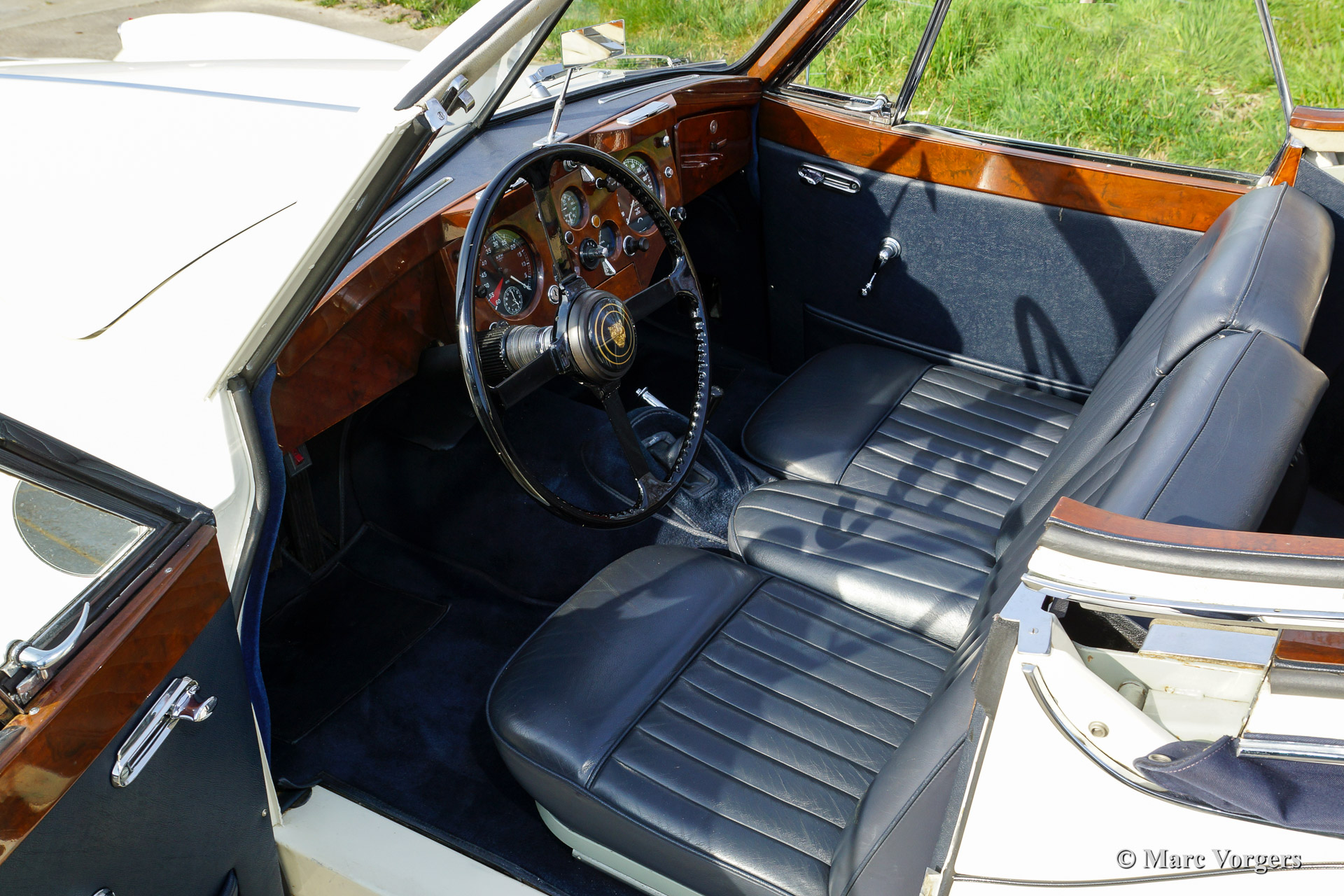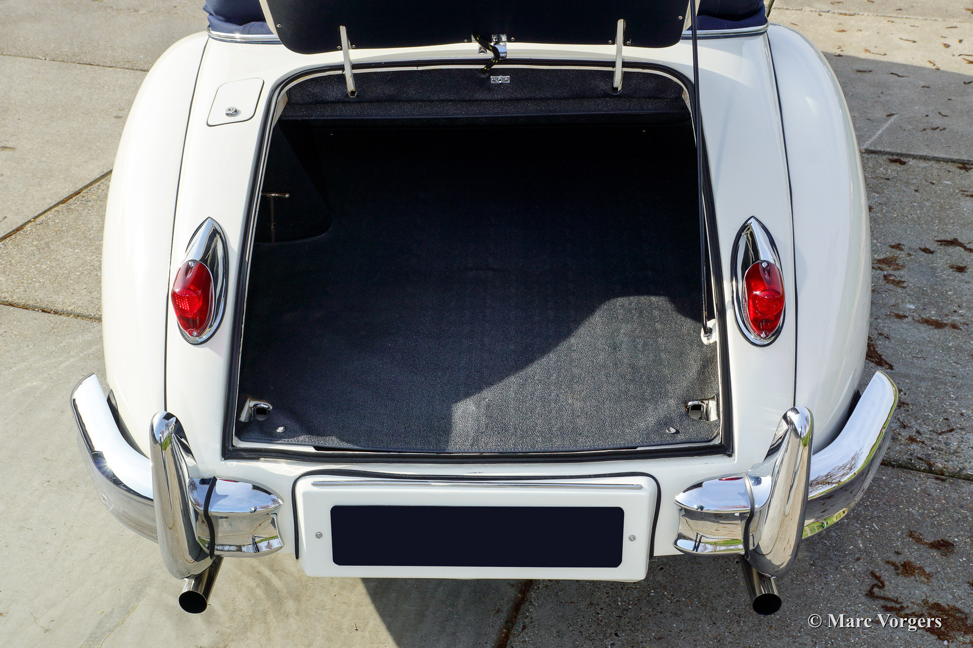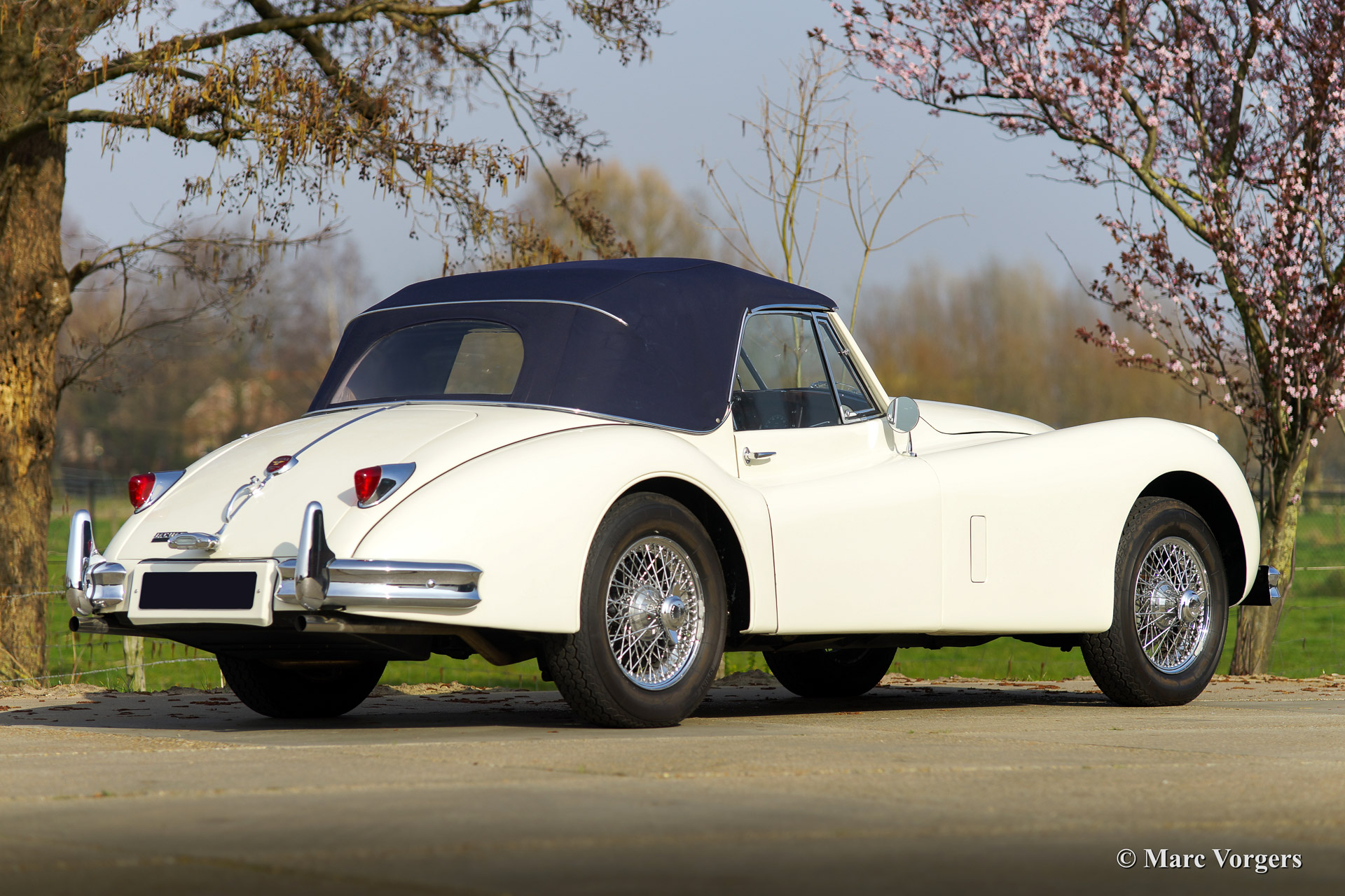 Jaguar XK 140 3.4 Litre DHC (Drophead Coupe), year 1956. Chassis number 818391, engine number G6995-8, 'matching numbers'. Colour Glacier White with a dark blue leather interior and dark blue carpet. Dark blue mohair hood. This fantastic Jaguar XK 140 DHC was extensively restored in the Netherlands about twenty years ago. The automobile shows minor signs of use, the car is in very good to excellent condition. The XK 140 features the 3.4 Litre XK engine mated to a manual four speed gearbox and the car drives perfect. This XK 140 was given some useful upgrades like an AC dynamo (alternator) and disc brakes with four-pot calipers replacing the original drum brakes.