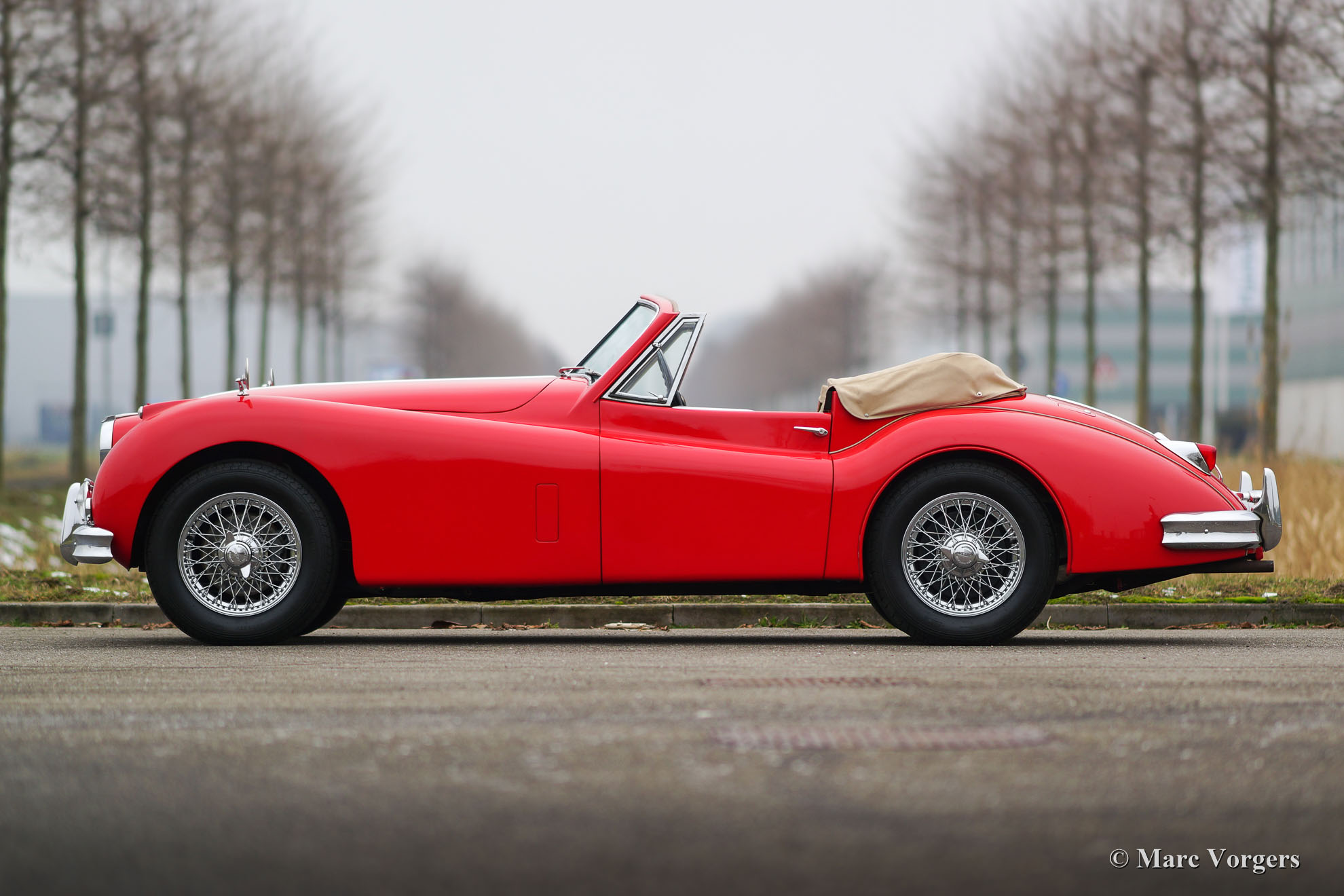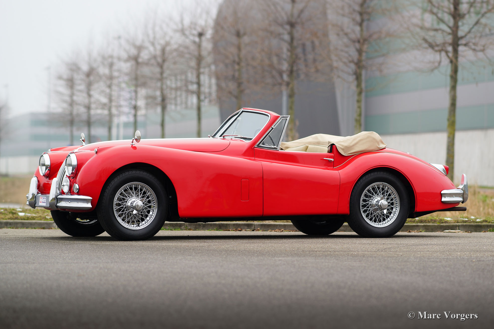 The Jaguar XK 140 replaced the famous XK 120 and was brought onto the market in 1954. The XK 140 was an evolution of the XK 120 with some visual differences and technical improvements. The handsome and dynamic features remained largely unchanged. New was the grille, which counted fewer vertical bars; the rear lights were larger, the bumpers were thicker, and the front indicators, which were placed on the front of the front wing. The important technical improvement was that the XK 140 was provided with a rack and pinion steering which greatly improved steering and driving.