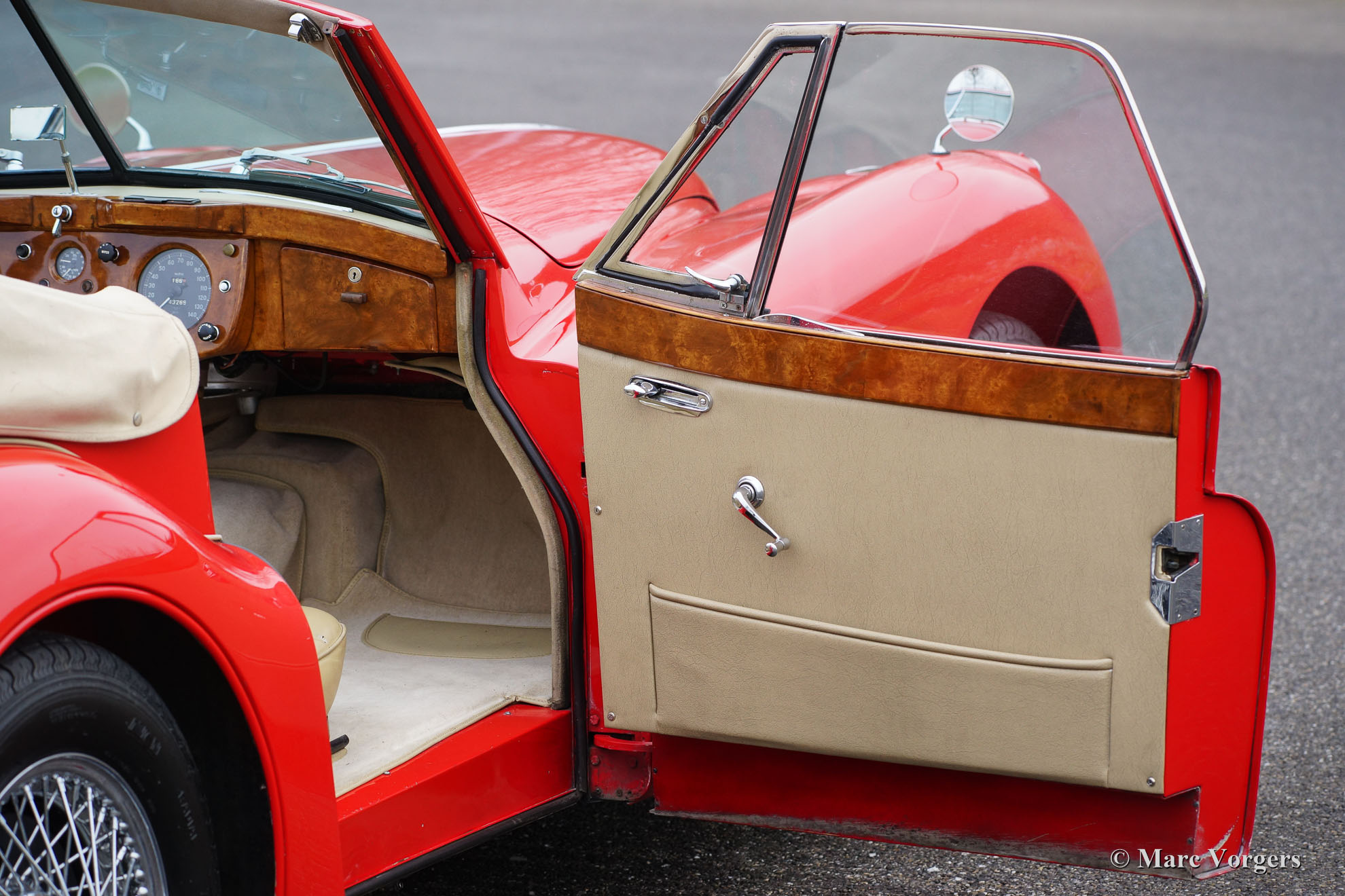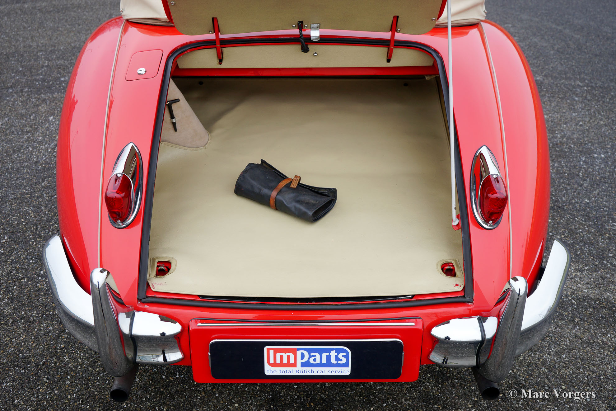 Jaguar XK 140 DHC, year 1956. Colour red (Carmen red) with a beige leather interior and beige carpet. Beige hood and hood-cover. This fantastic Jaguar XK 140 DHC (Drop Head Coupe) is in very good condition and the car drives perfectly! Only 2310 LHD (left hand drive) Jaguar XK 140 DHC cars have been built. The chassis number, engine number and body number of this fine automobile are ‘matching’ and factory original. The Jaguar features beautiful 16 inch chrome wire wheels, disc brakes at the front wheels, OVERDRIVE and two Lucas fog lamps at the front.