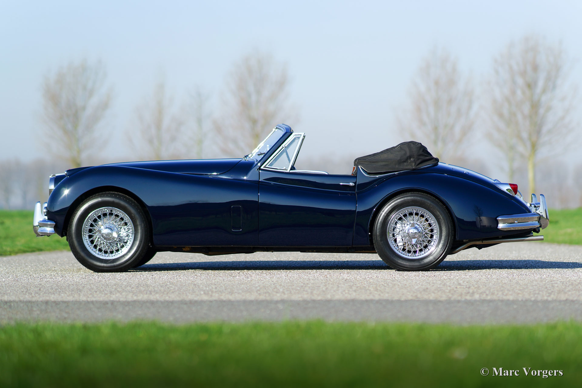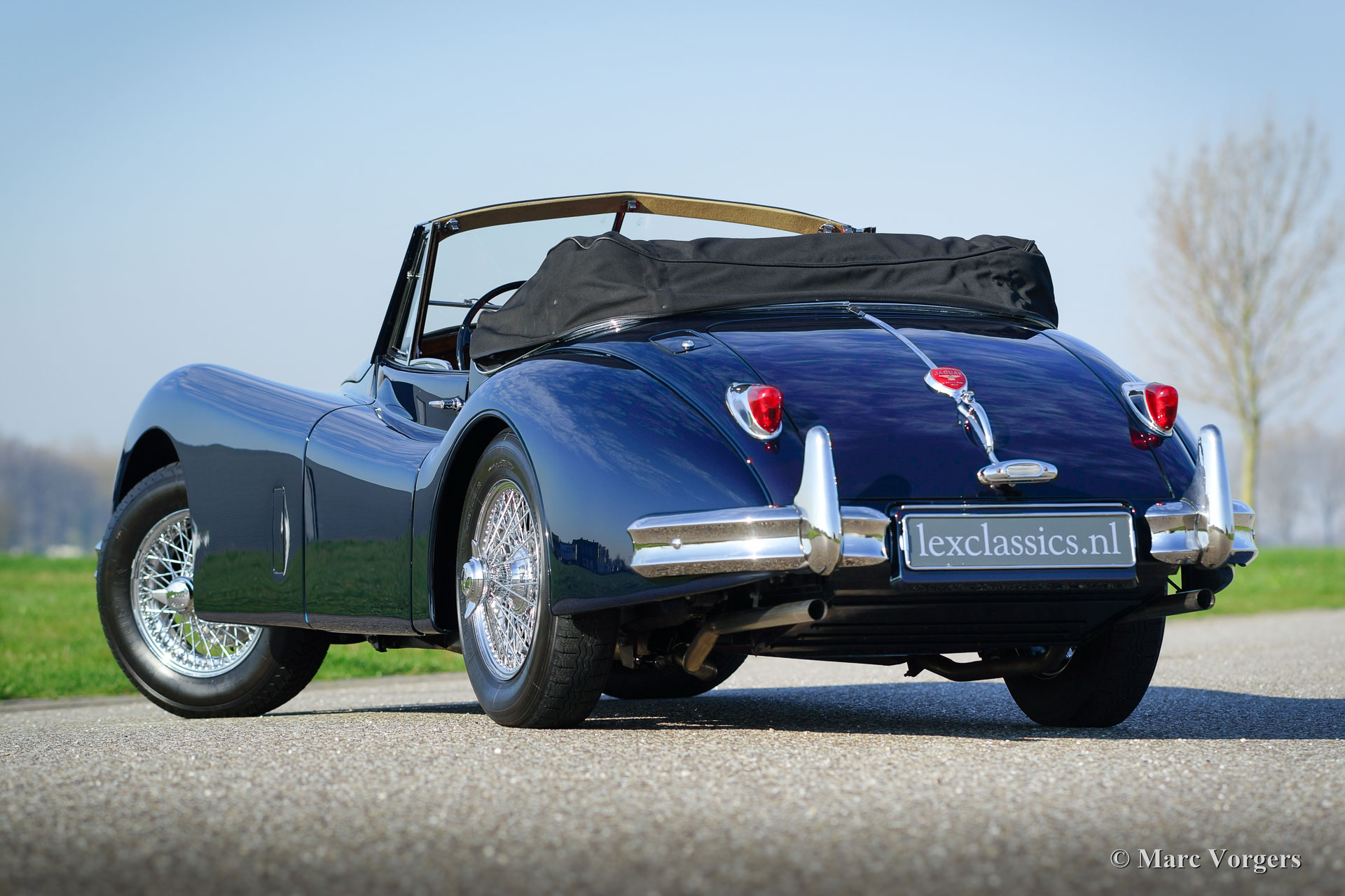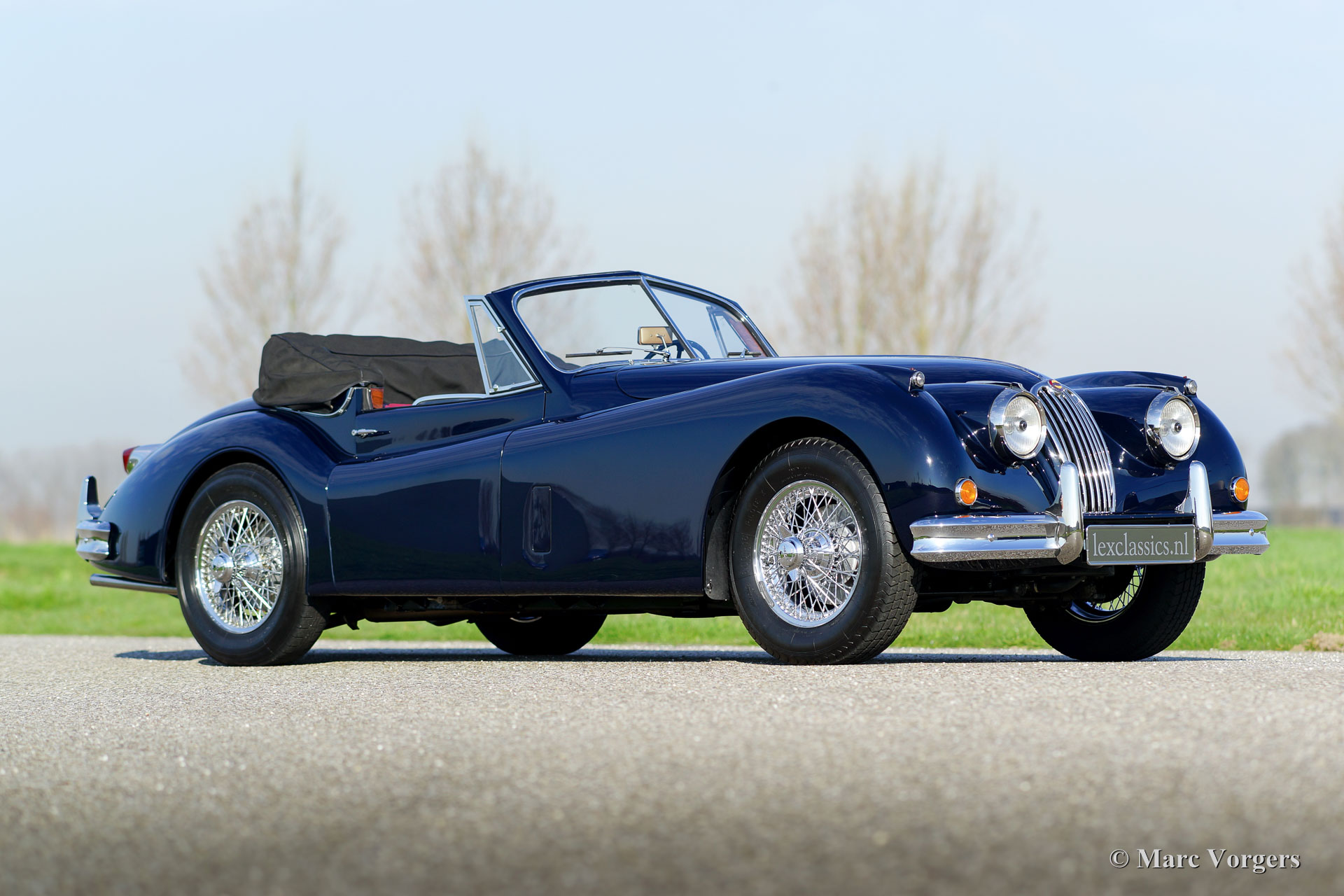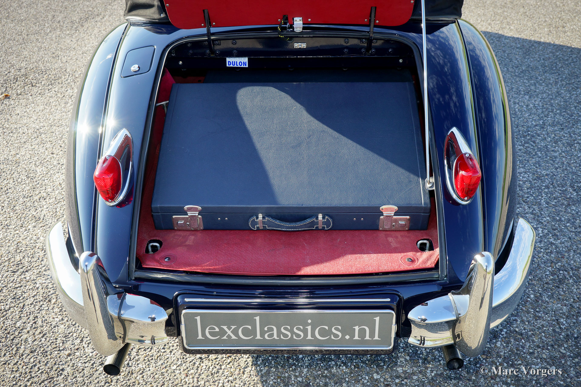 Jaguar XK 140 DHC, year 1956. Colour Pacific Blue with a red leather interior and a black mohair hood. This wonderful Jaguar XK 140 Drop Head Coupe (DHC) was extensively and beautifully restored in the Great Britain. The automobile is in superb TOP-condition! Photos of the restoration are present. The interior features fantastic classic type bucket seats which add lateral support and more room for the legs. A Heritage certificate is present; the engine and chassis numbers are matching as are the colours. The gearbox was exchanged for a five-speed Getrag unit. Furthermore, this beautiful Jaguar XK 140 features chrome wire wheels with chrome ‘knock off’ wheel-nuts, disc brakes all round, 123 electronic ignition and Jaguar headlamps with the ‘J’ logo on the glass. In total only 2.310 left hand drive examples of the XK 140 DHC have been build. This is a perfectly driving top-specimen!