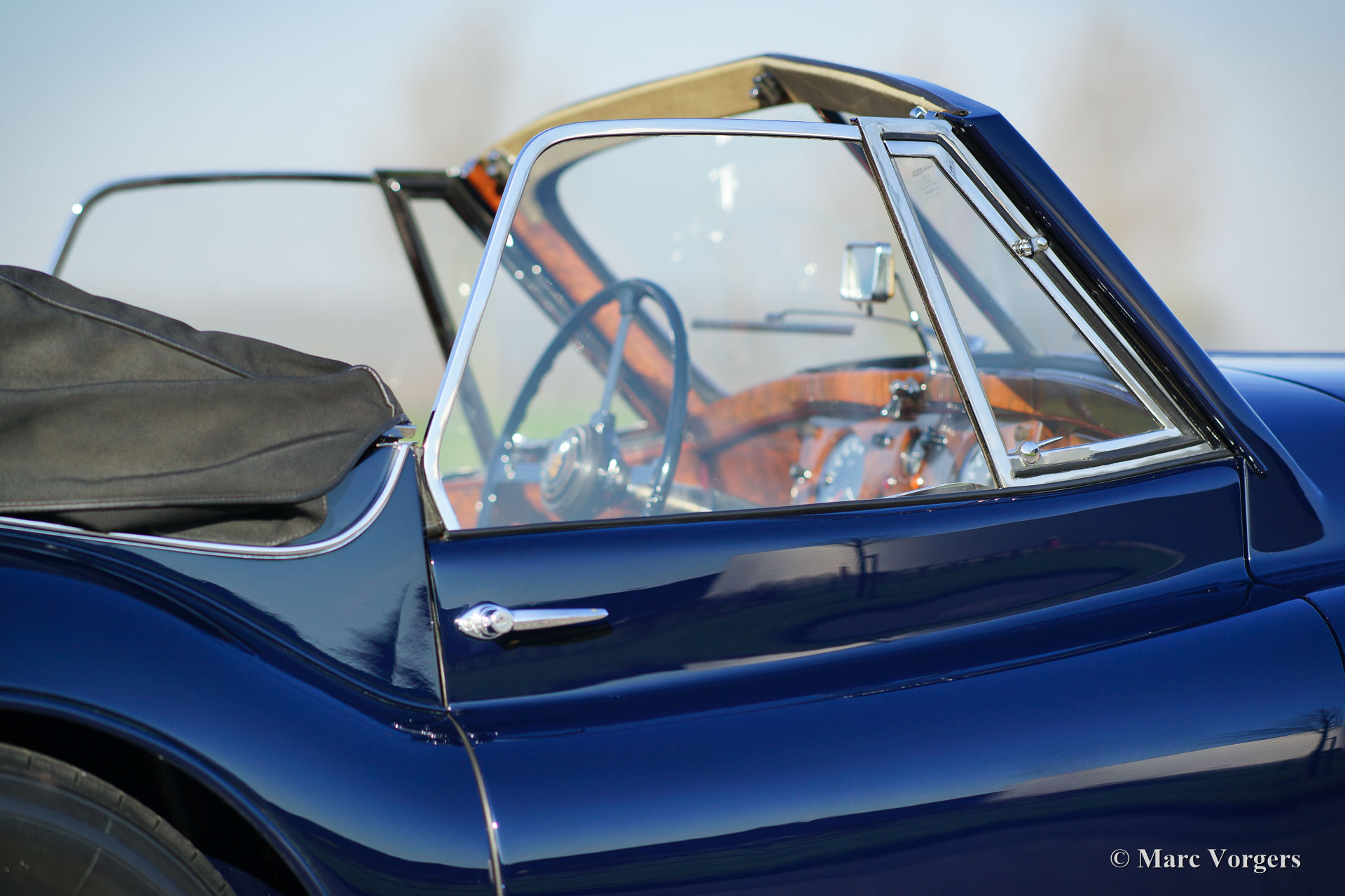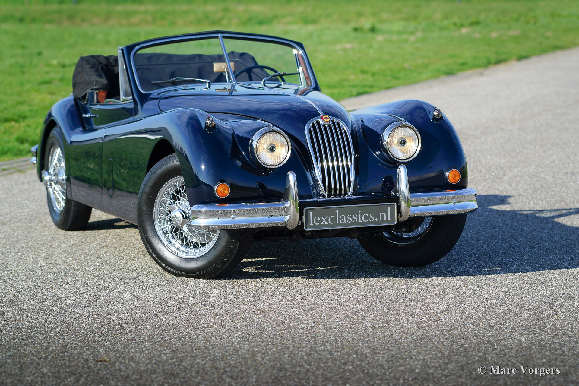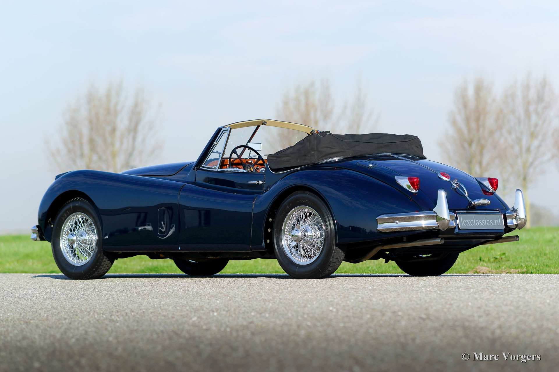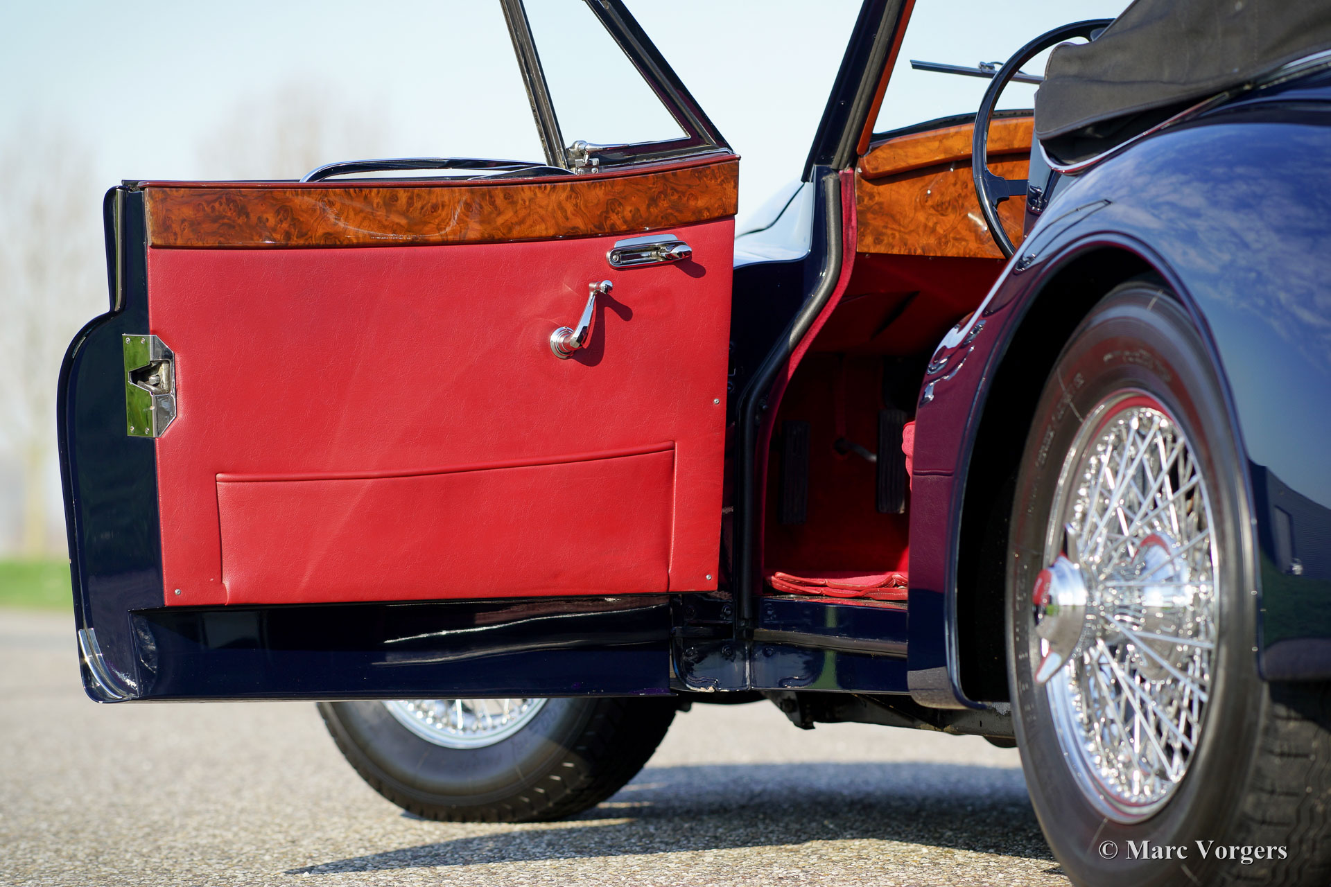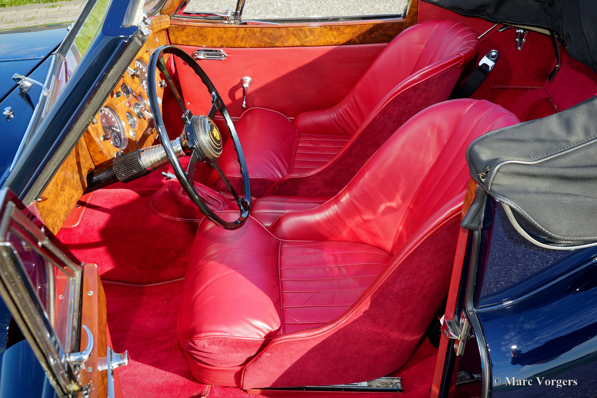 Jaguar XK 140 DHC, year 1956. Colour Pacific Blue with a red leather interior and a black mohair hood. This wonderful Jaguar XK 140 Drop Head Coupe (DHC) was extensively and beautifully restored in the Great Britain. The automobile is in superb TOP-condition! Photos of the restoration are present. The interior features fantastic classic type bucket seats which add lateral support and more room for the legs. A Heritage certificate is present; the engine and chassis numbers are matching as are the colours. The gearbox was exchanged for a five-speed Getrag unit. Furthermore, this beautiful Jaguar XK 140 features chrome wire wheels with chrome ‘knock off’ wheel-nuts, disc brakes all round, 123 electronic ignition and Jaguar headlamps with the ‘J’ logo on the glass. In total only 2.310 left hand drive examples of the XK 140 DHC have been build. This is a perfectly driving top-specimen!