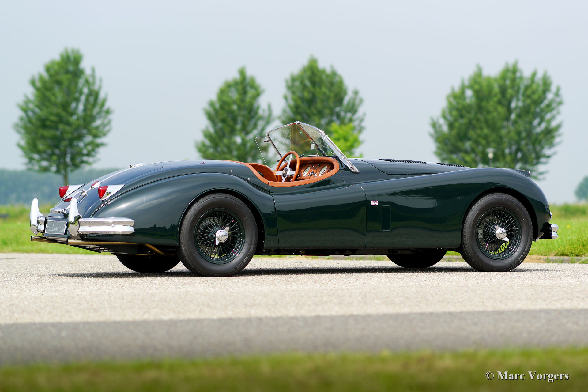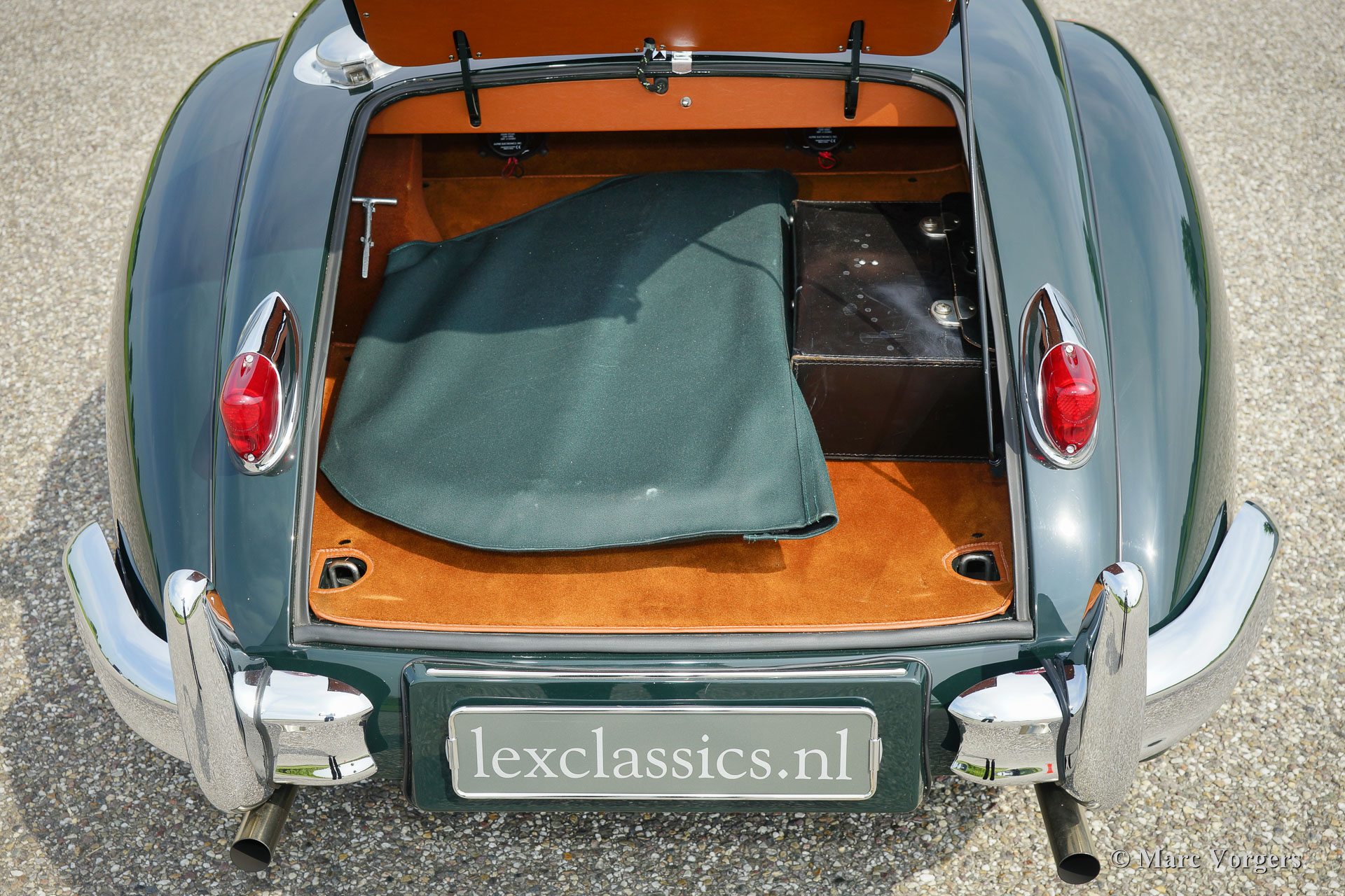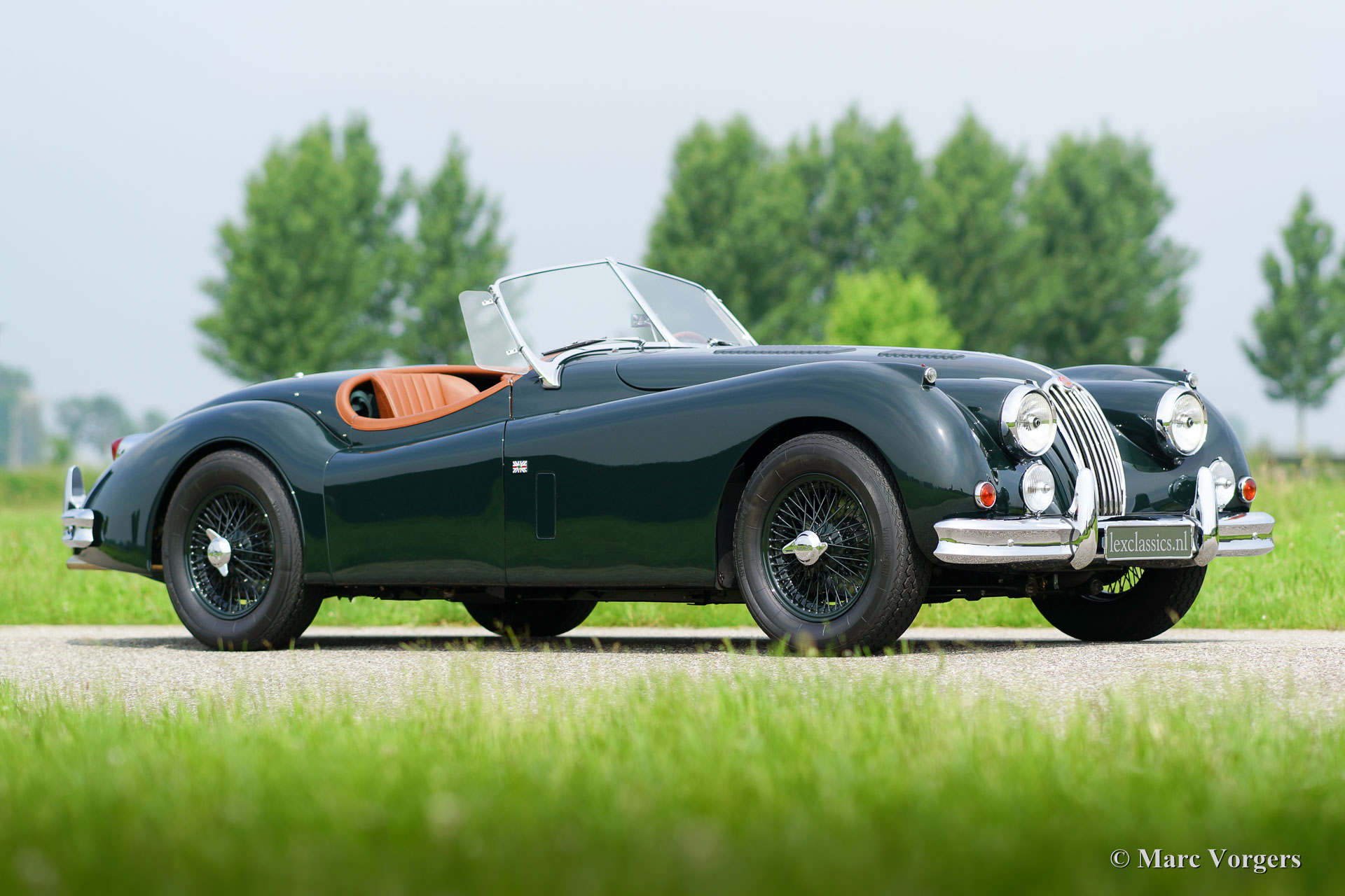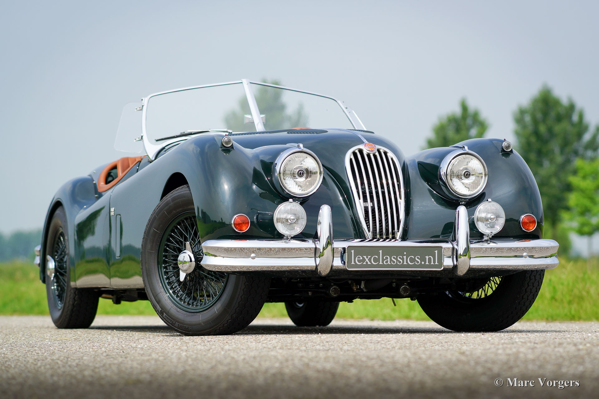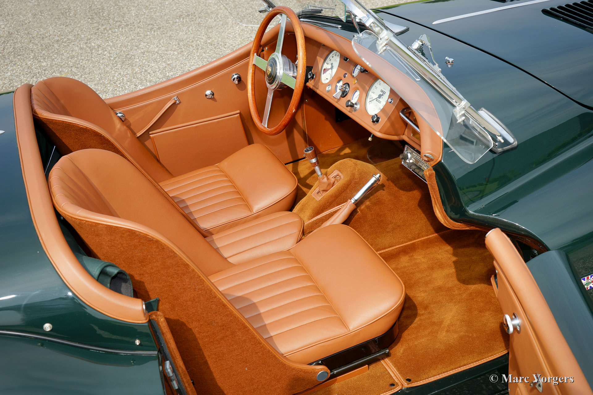 Jaguar XK 140 OTS, year 1955. Colour British Racing Green with a cognac full leather interior and carpet to match. Green mohair soft top, green upholstered side screens, and a green mohair tonneau cover. This magnificent Jaguar XK 140 Open Two Seater (OTS), also named ‘roadster’ is in superb TOP-condition; concourse! The automobile was perfectly restored, overhauled, and rebuilt in the Netherlands. A photo reportage of this very thorough restoration is present. The car was given some ‘period correct’ sporty improvements during the restoration. A ‘quick-filler’ aluminium fuel cap was added and the bonnet was given ‘louvers’ for better cooling of the engine room. The interior has been fitted with excellent period correct bucket seats and the gauges / clocks were given stylish cream white dials. Also a beautiful classic radio was fitted. Furthermore, the car features wire spoke wheels painted in body colour, a five-speed gearbox, Jaguar head lamps, a Stainless Steel exhaust, disc brakes all-round, AC-generator, Lucas fog lamps at the front, a Moto-Lita sports steering wheel with wood rim, a dual circuit brake system and wind deflectors at the windscreen frame. This is one of the best and most delightful driving Jaguar XKs’ we have ever driven; a TOP example!