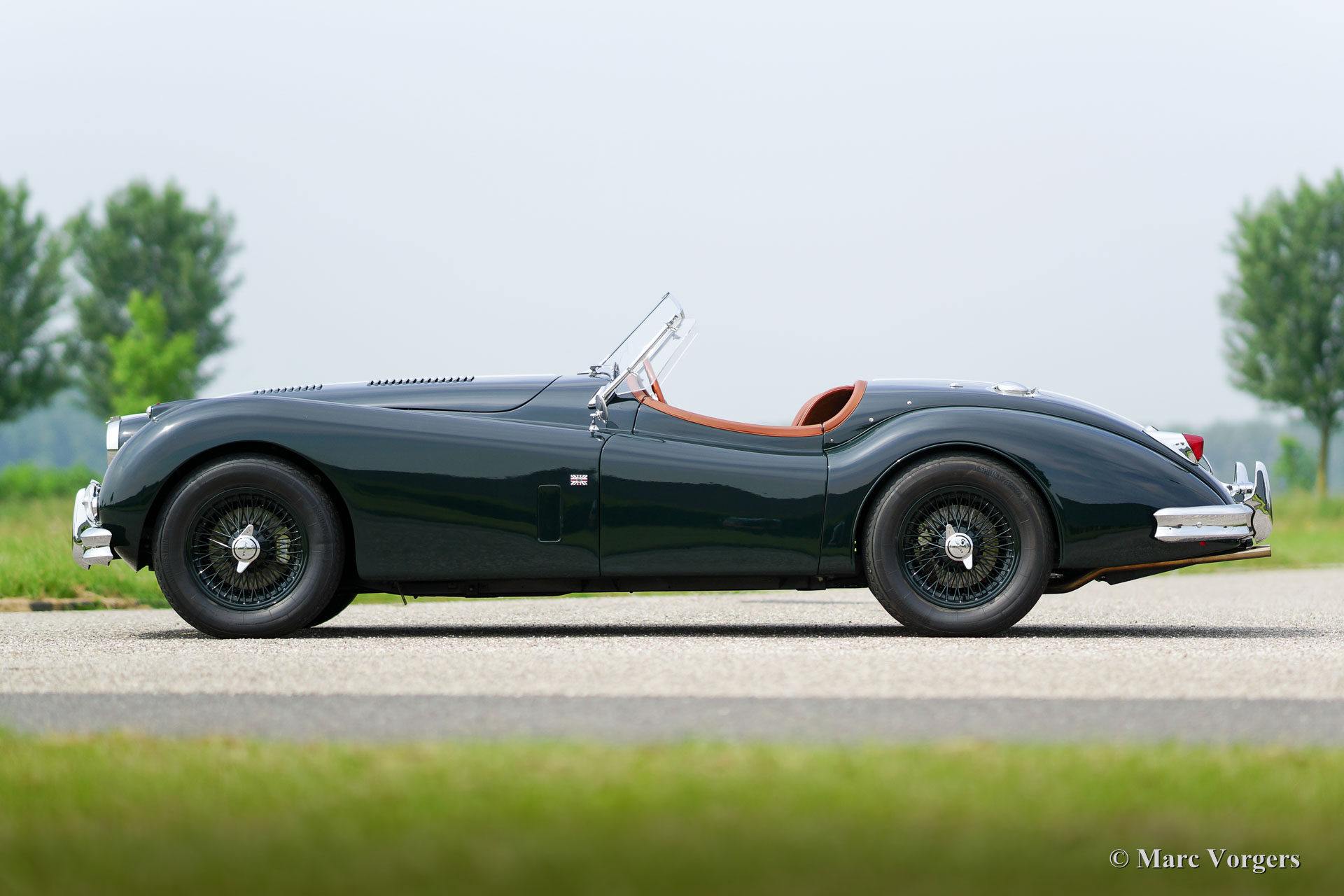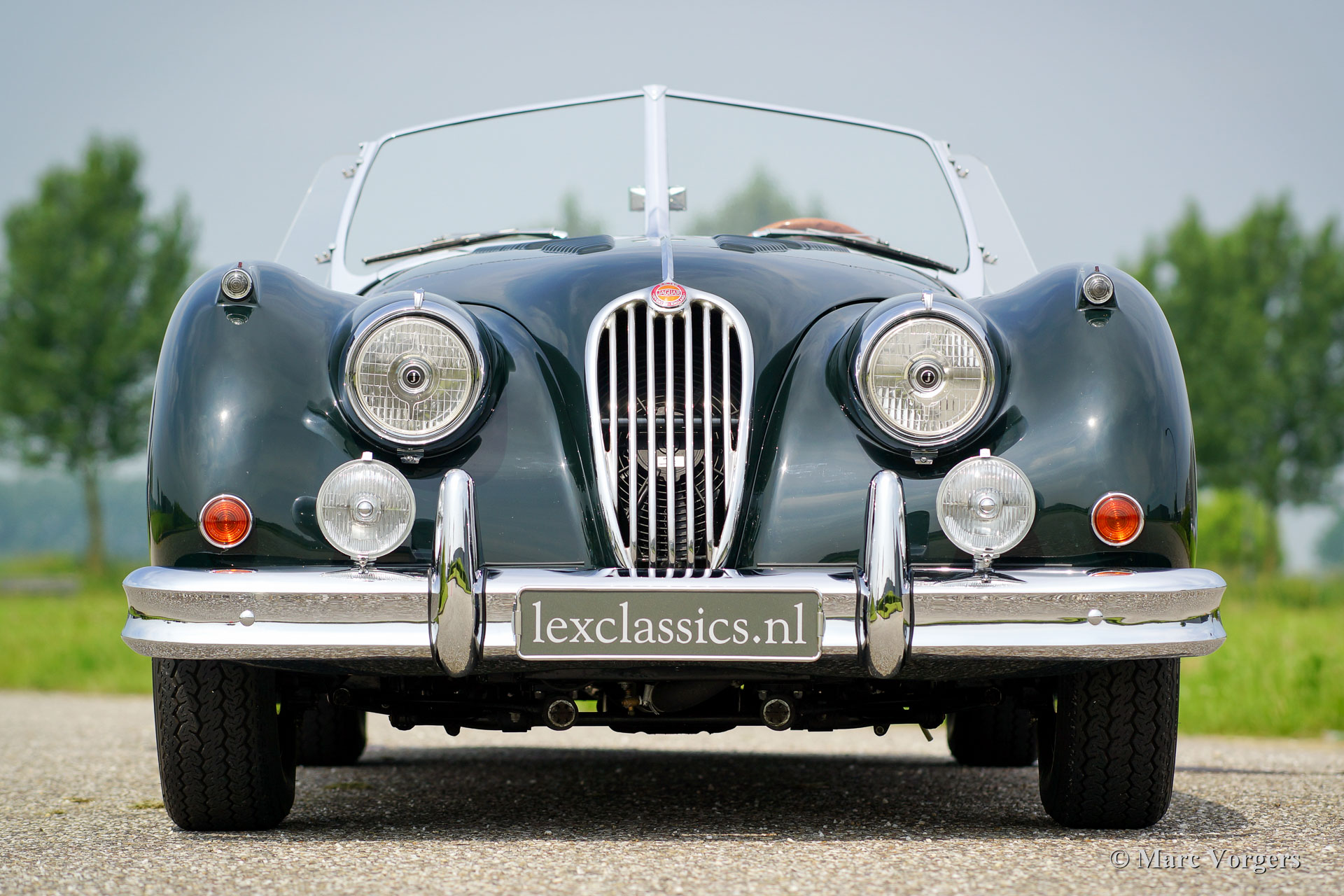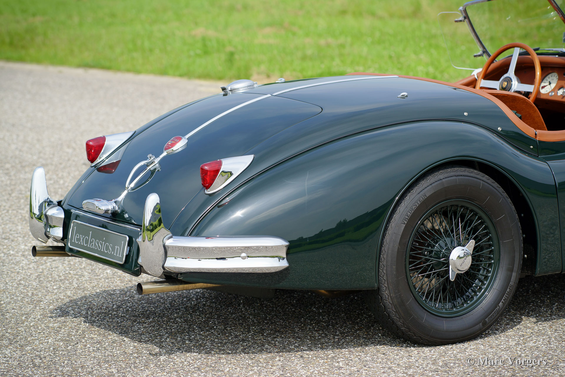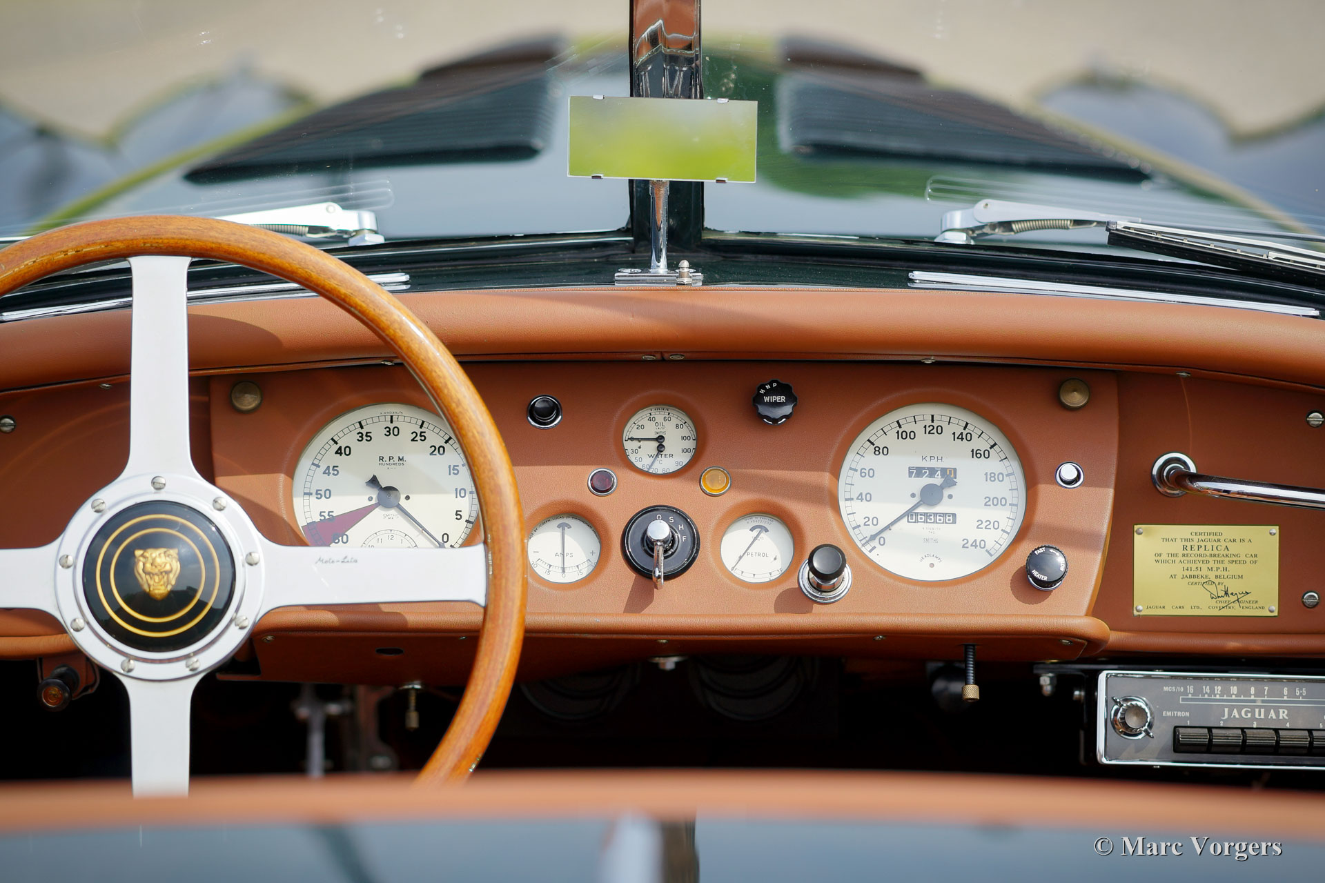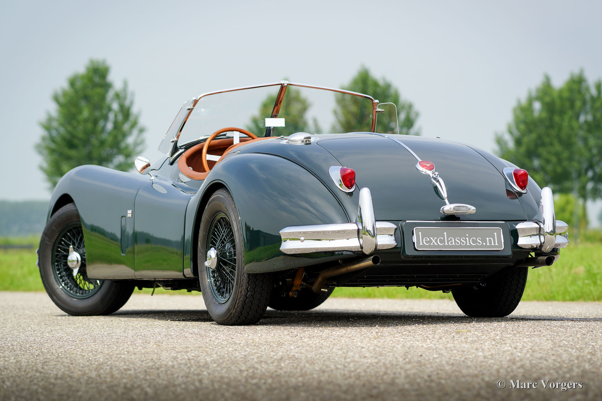 Jaguar XK 140 OTS, year 1955. Colour British Racing Green with a cognac full leather interior and carpet to match. Green mohair soft top, green upholstered side screens, and a green mohair tonneau cover. This magnificent Jaguar XK 140 Open Two Seater (OTS), also named ‘roadster’ is in superb TOP-condition; concourse! The automobile was perfectly restored, overhauled, and rebuilt in the Netherlands. A photo reportage of this very thorough restoration is present. The car was given some ‘period correct’ sporty improvements during the restoration. A ‘quick-filler’ aluminium fuel cap was added and the bonnet was given ‘louvers’ for better cooling of the engine room. The interior has been fitted with excellent period correct bucket seats and the gauges / clocks were given stylish cream white dials. Also a beautiful classic radio was fitted. Furthermore, the car features wire spoke wheels painted in body colour, a five-speed gearbox, Jaguar head lamps, a Stainless Steel exhaust, disc brakes all-round, AC-generator, Lucas fog lamps at the front, a Moto-Lita sports steering wheel with wood rim, a dual circuit brake system and wind deflectors at the windscreen frame. This is one of the best and most delightful driving Jaguar XKs’ we have ever driven; a TOP example!