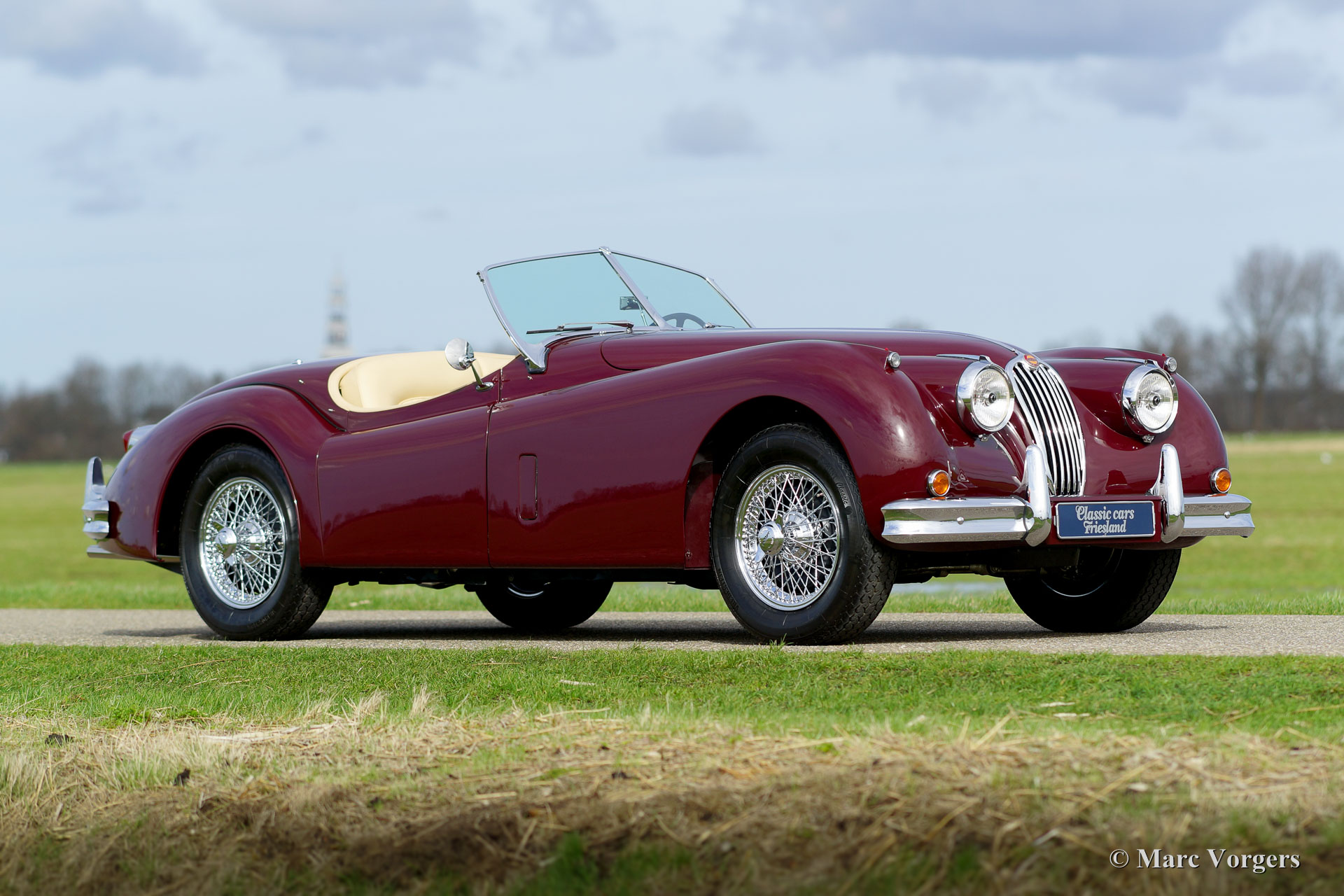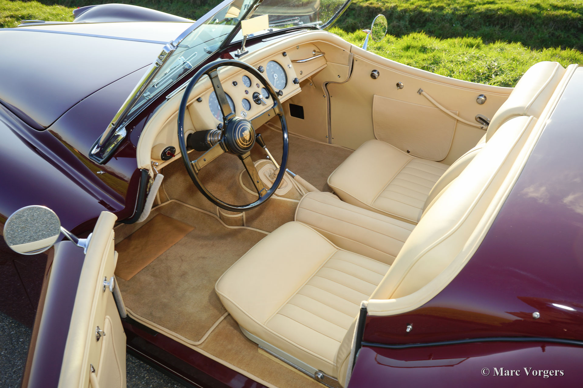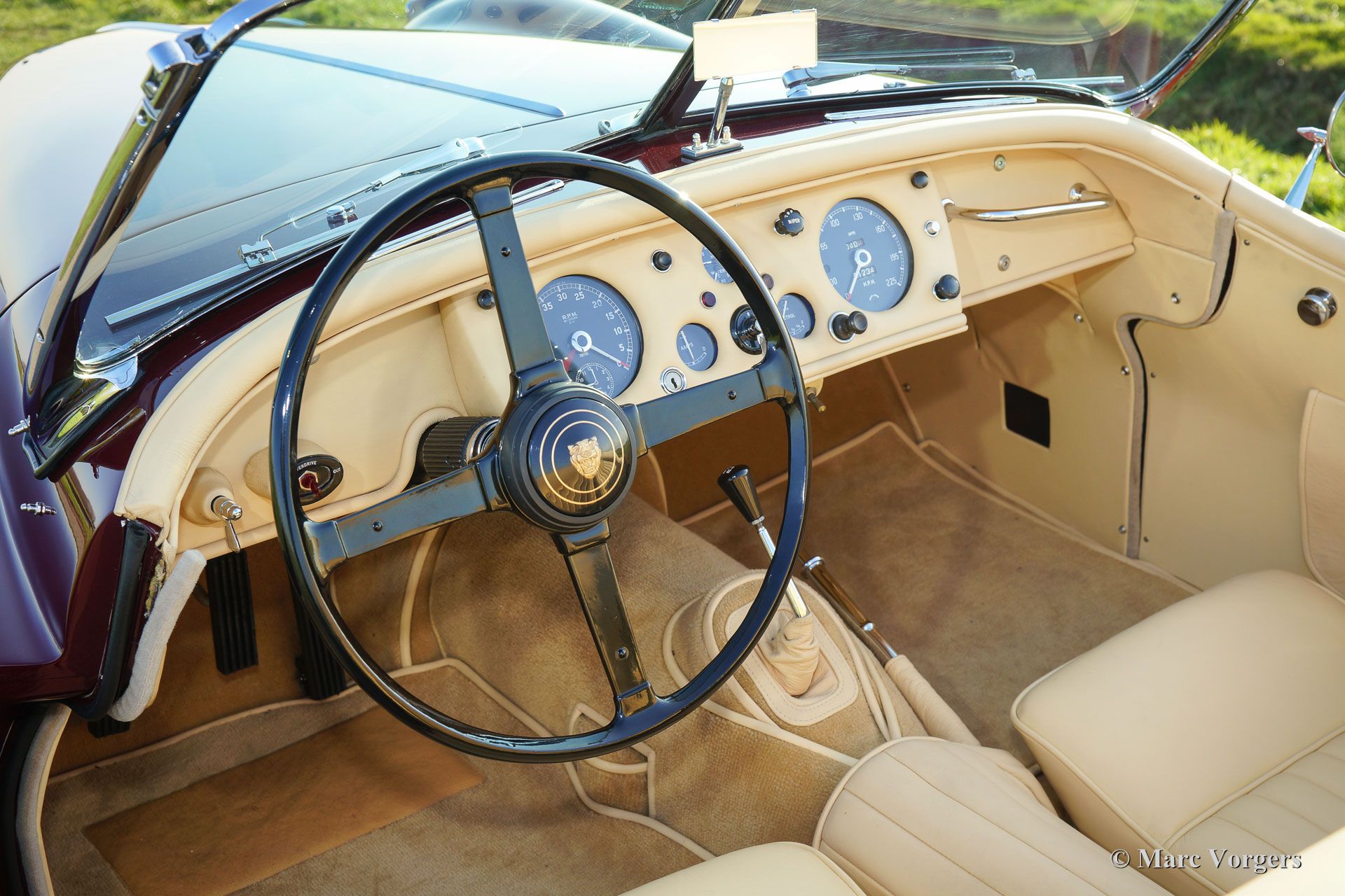 Jaguar XK 140 OTS (roadster), year 1956. Colour Maroon red with a light beige leather interior. This magnificent Jaguar was extensively and professionally 'body off' restored. Of course including overhaul of the engine, gearbox and overdrive. New wiring loom and perfect chrome. This Jaguar XK 140 OTS is in concourse (show) condition! The automobile features, overdrive, adjustable steering wheel, chrome wire wheels, a black mohair soft top with original glass rear window, a black mohair tonneau cover, a Stainless Steel exhaust and an aluminium petrol tank. This is a TOP specimen and the car drives absolutely perfect.