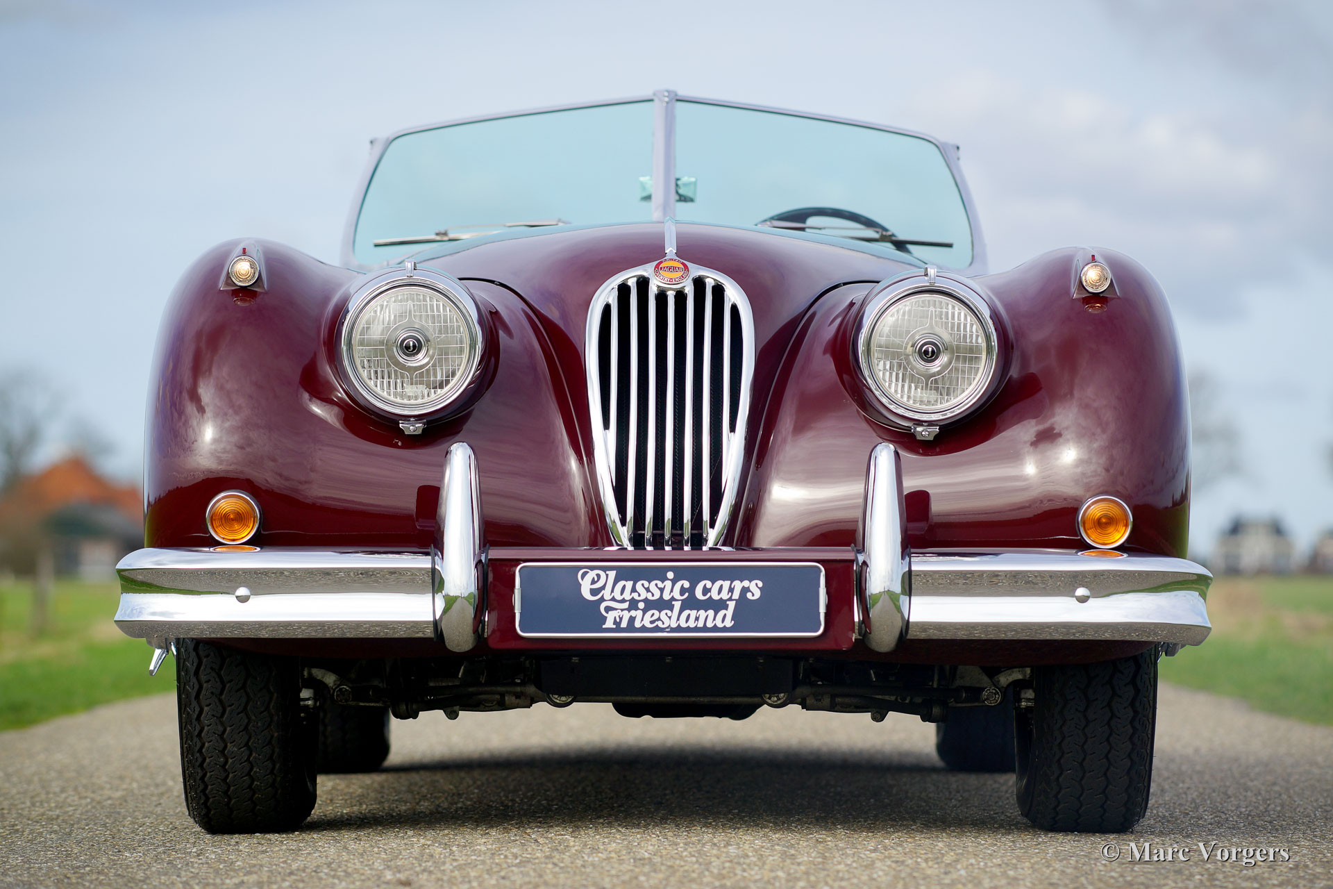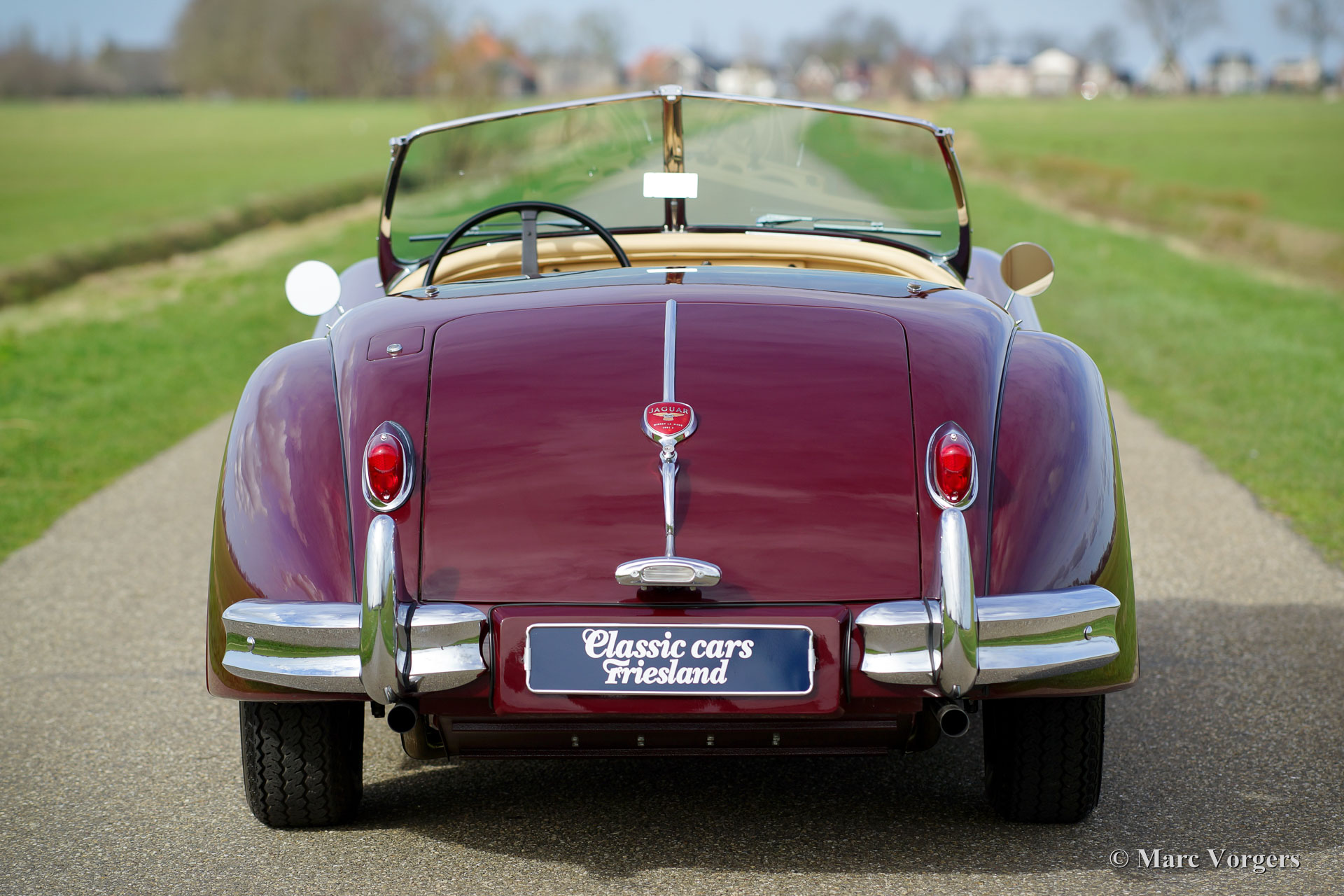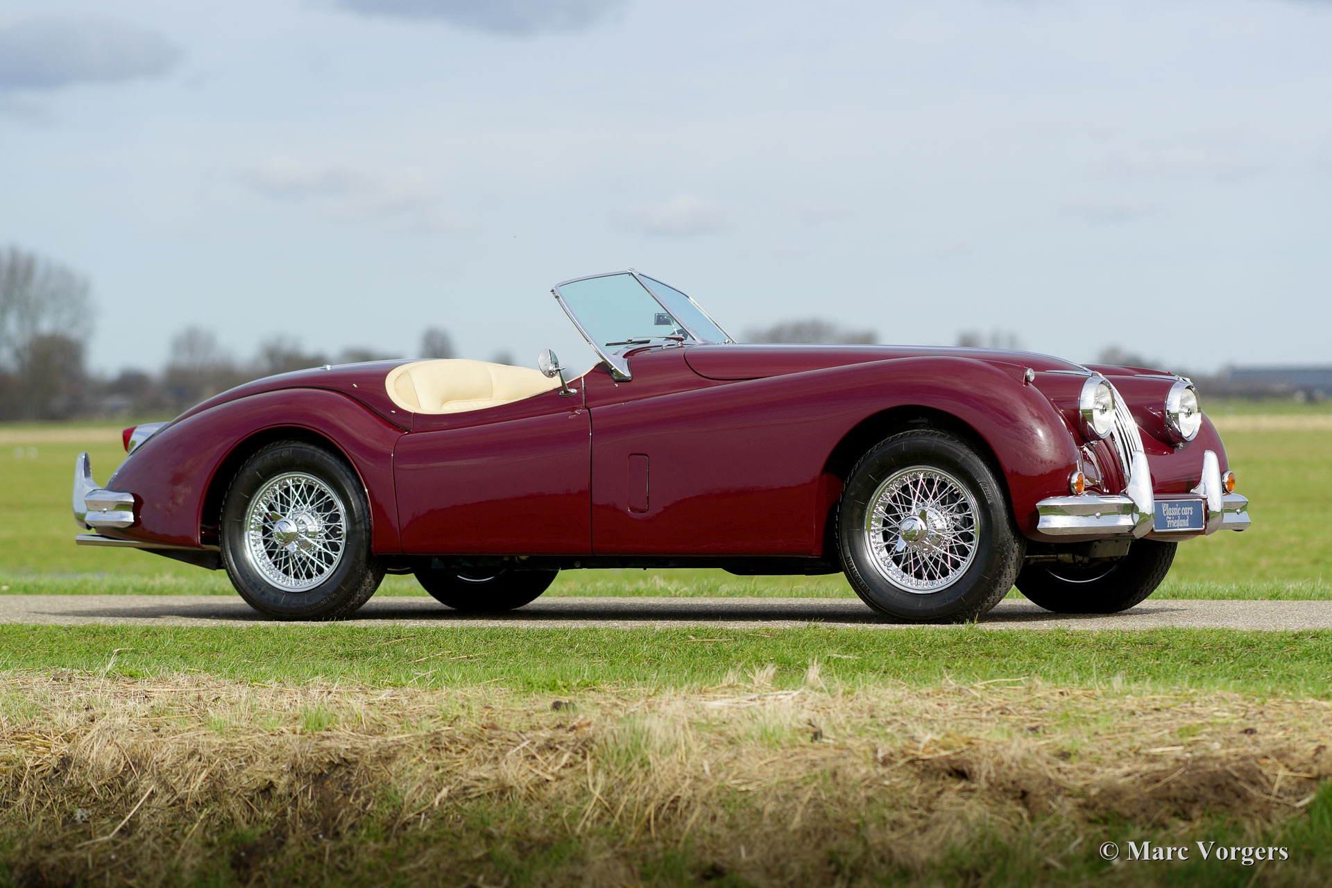 Jaguar XK 140 OTS (roadster), year 1956. Colour Maroon red with a light beige leather interior. This magnificent Jaguar was extensively and professionally 'body off' restored. Of course including overhaul of the engine, gearbox and overdrive. New wiring loom and perfect chrome. This Jaguar XK 140 OTS is in concourse (show) condition! The automobile features, overdrive, adjustable steering wheel, chrome wire wheels, a black mohair soft top with original glass rear window, a black mohair tonneau cover, a Stainless Steel exhaust and an aluminium petrol tank. This is a TOP specimen and the car drives absolutely perfect.