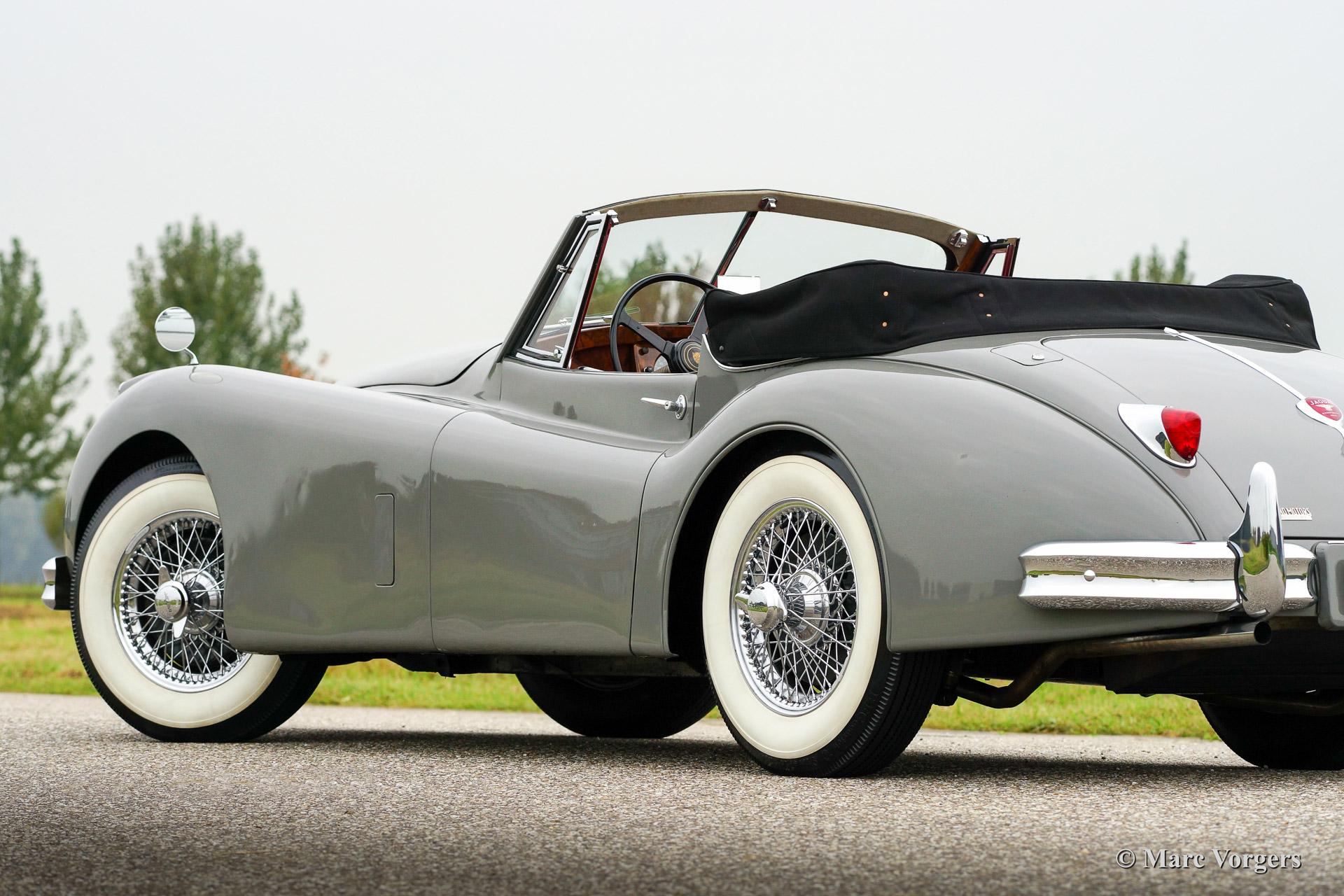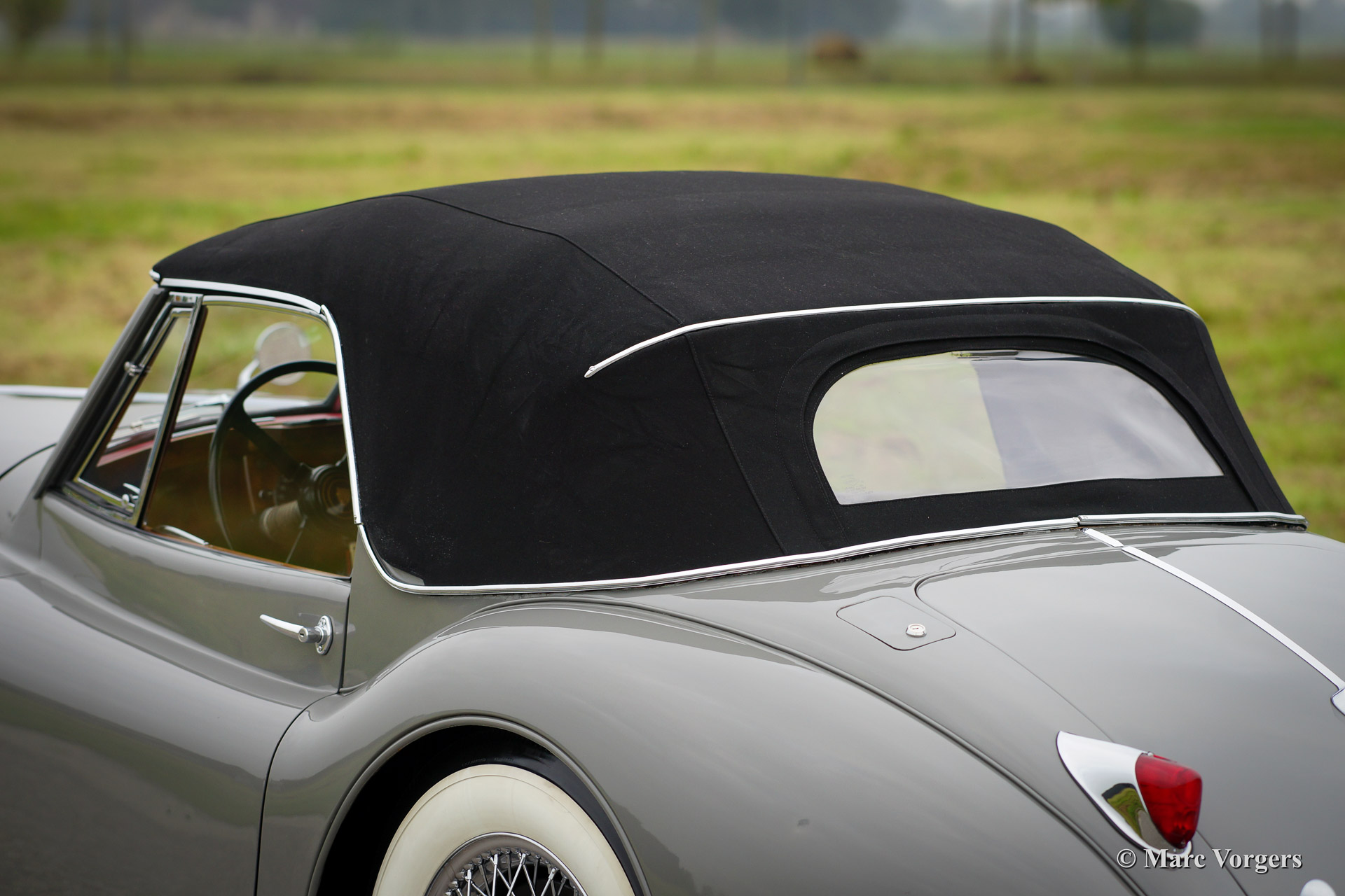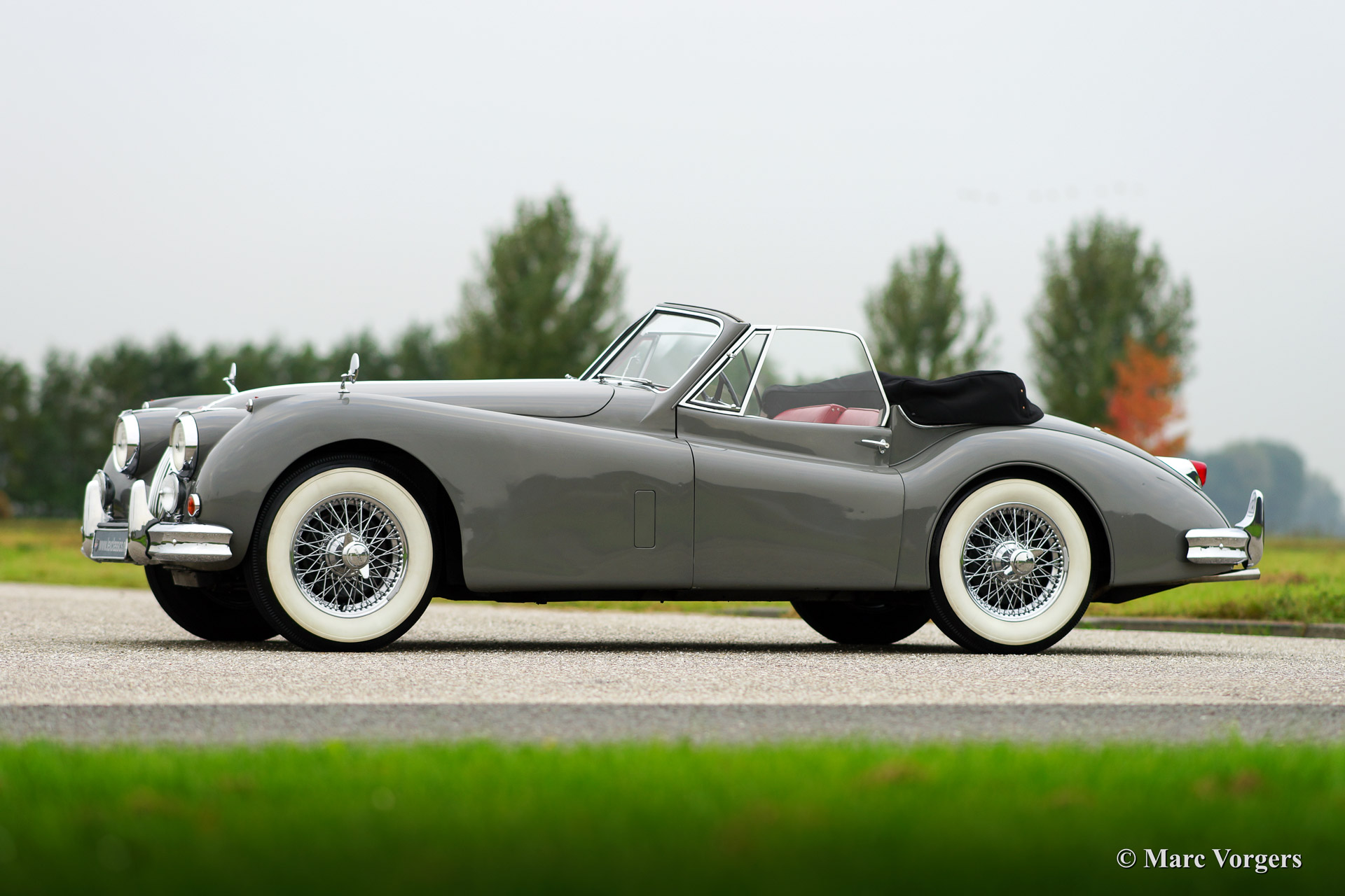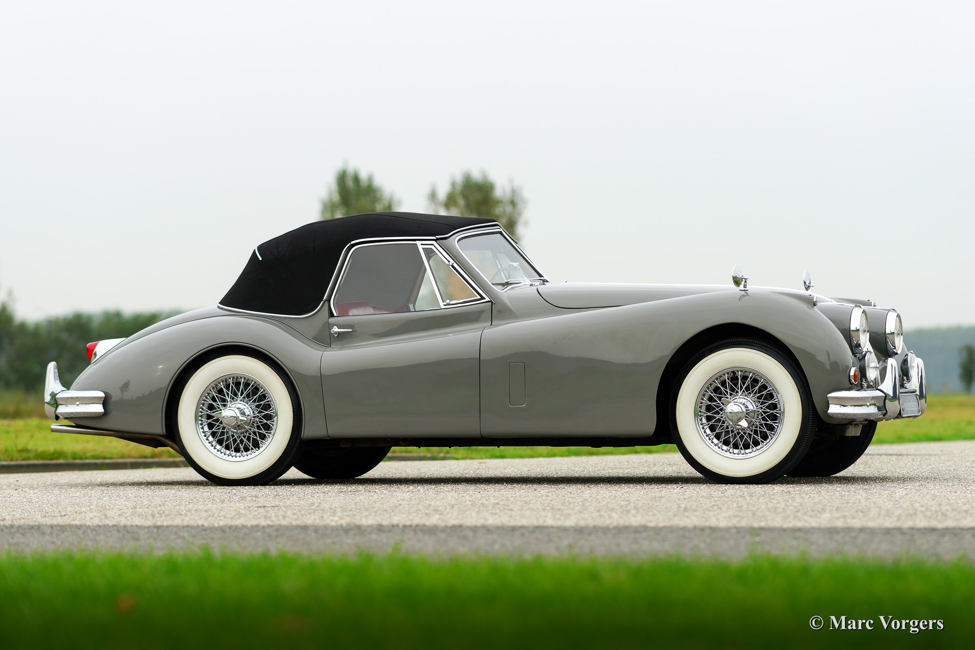 Jaguar XK 140 SE Drophead Coupe, year 1955. Colour Birch Grey with a red leather interior and a black hood. Fitted with Special Equipment (SE) goodies like the C-type cylinder head.