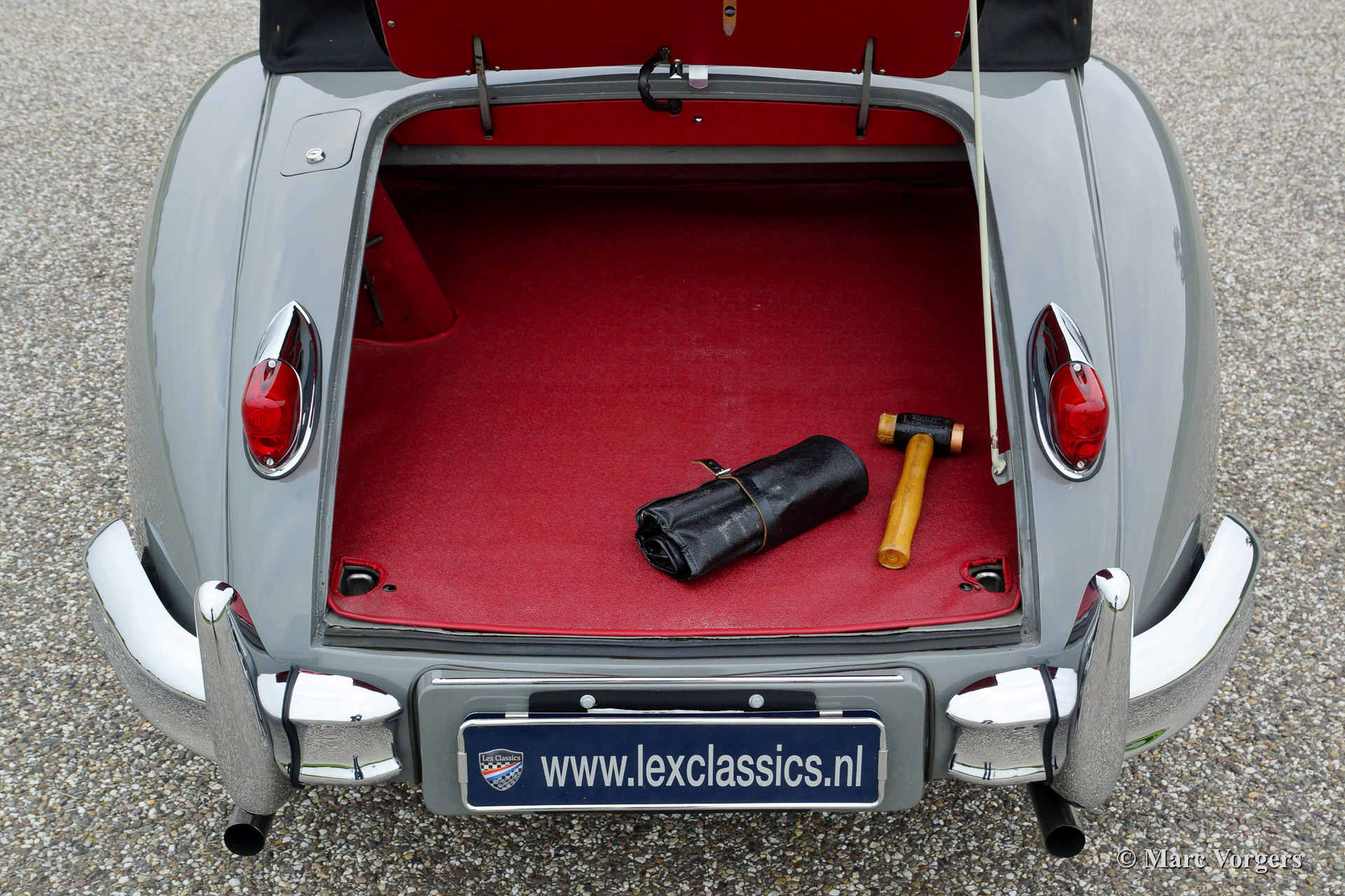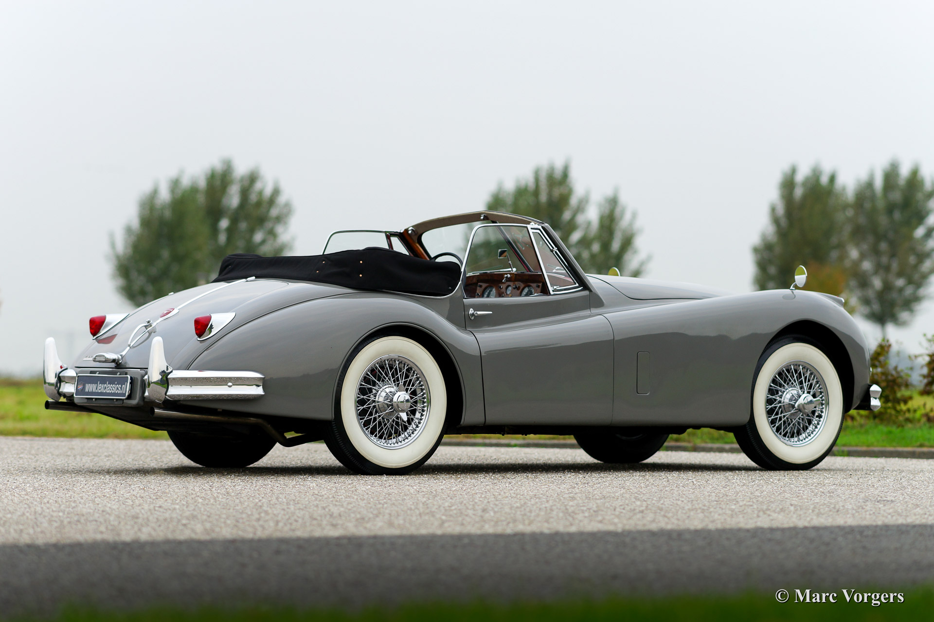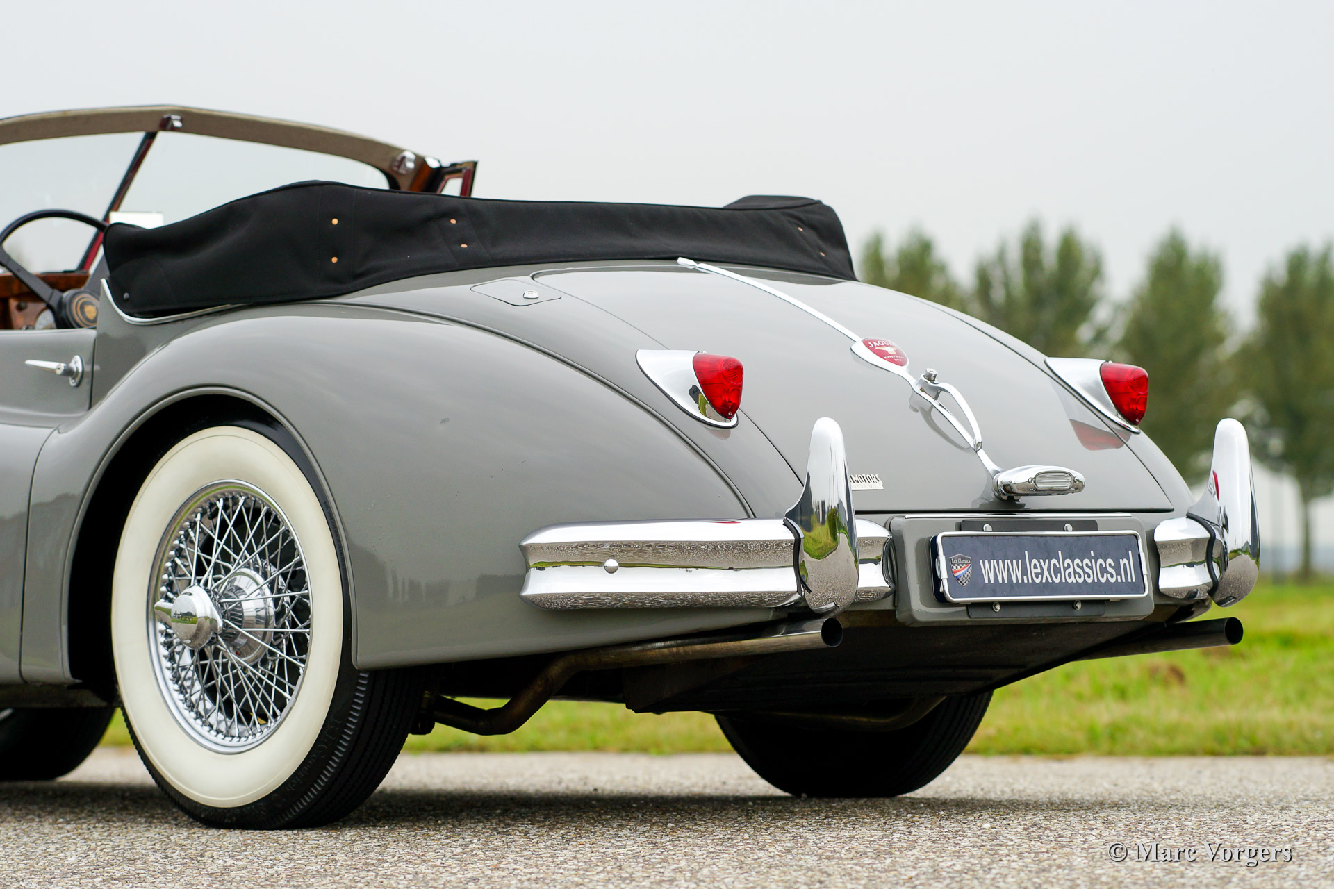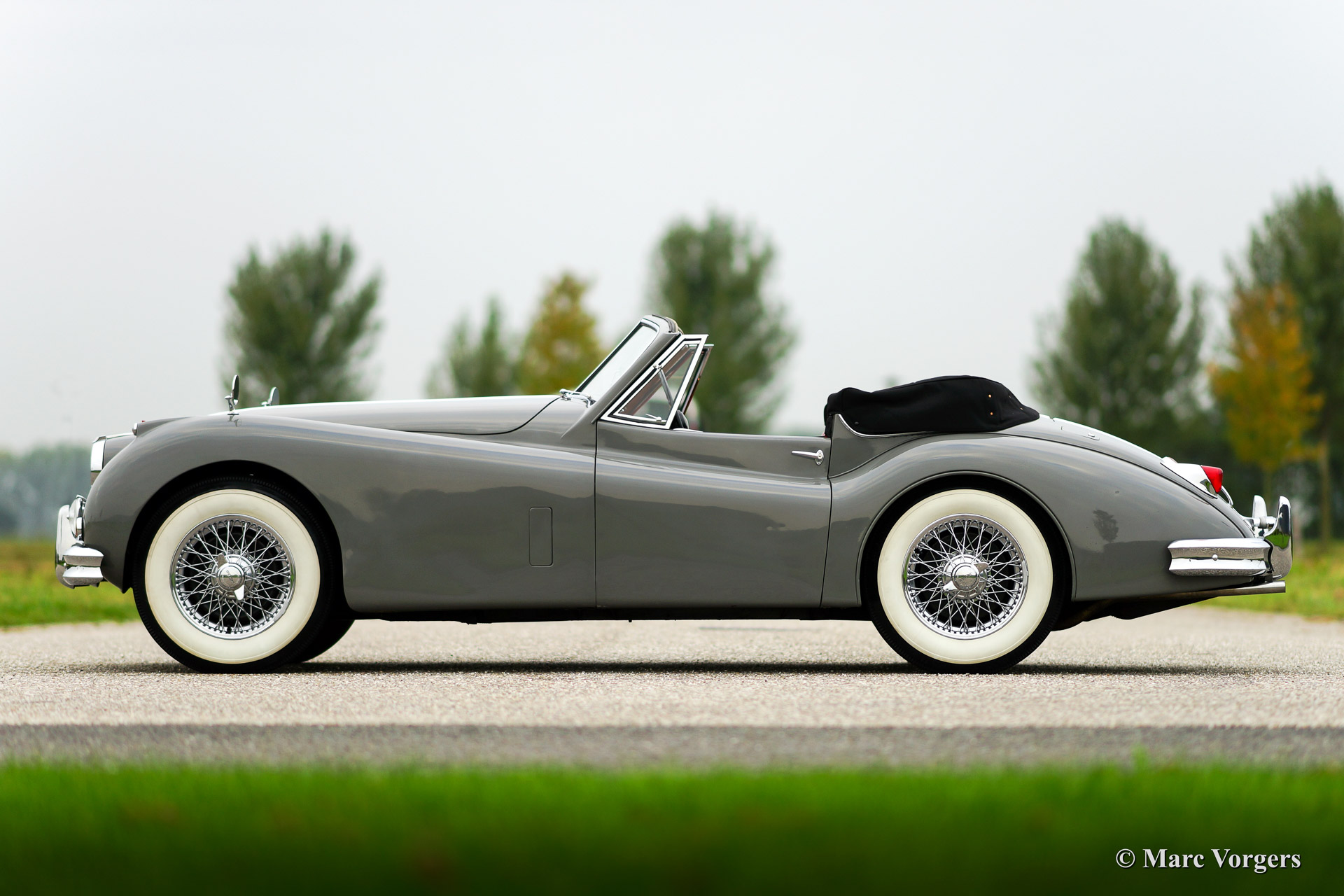 Jaguar XK 140 SE Drophead Coupe, year 1955. Colour Birch Grey with a red leather interior and a black hood. Fitted with Special Equipment (SE) goodies like the C-type cylinder head.