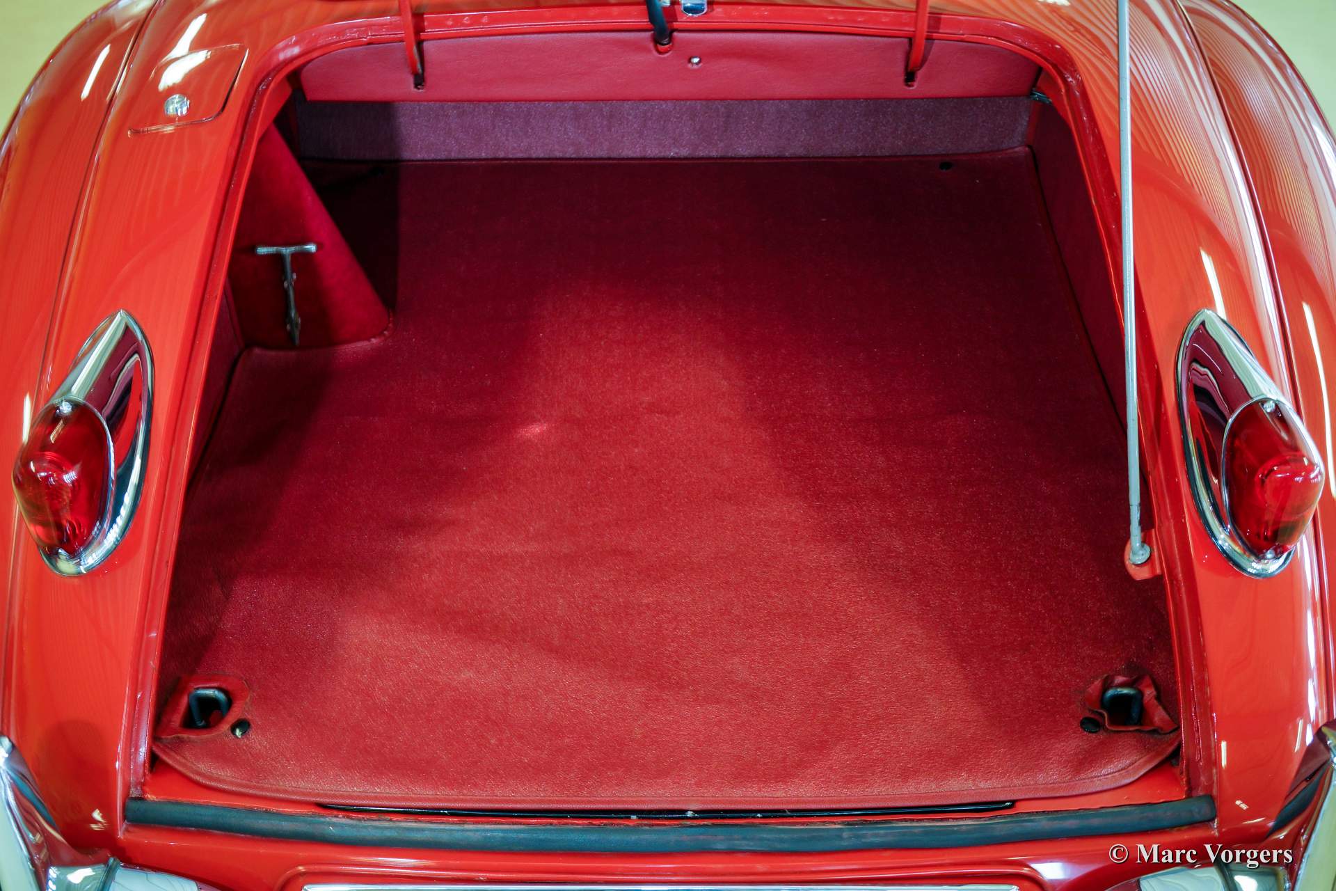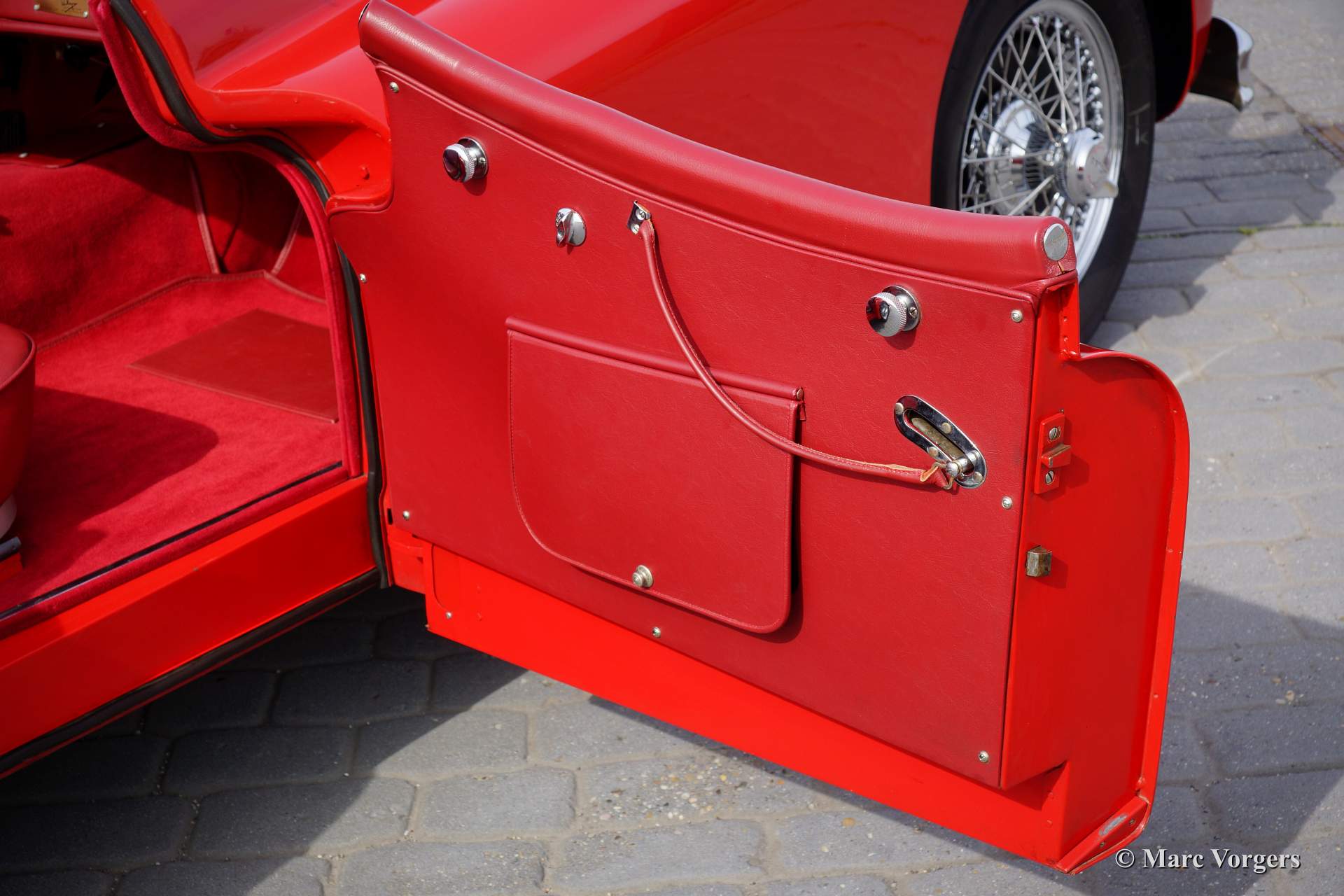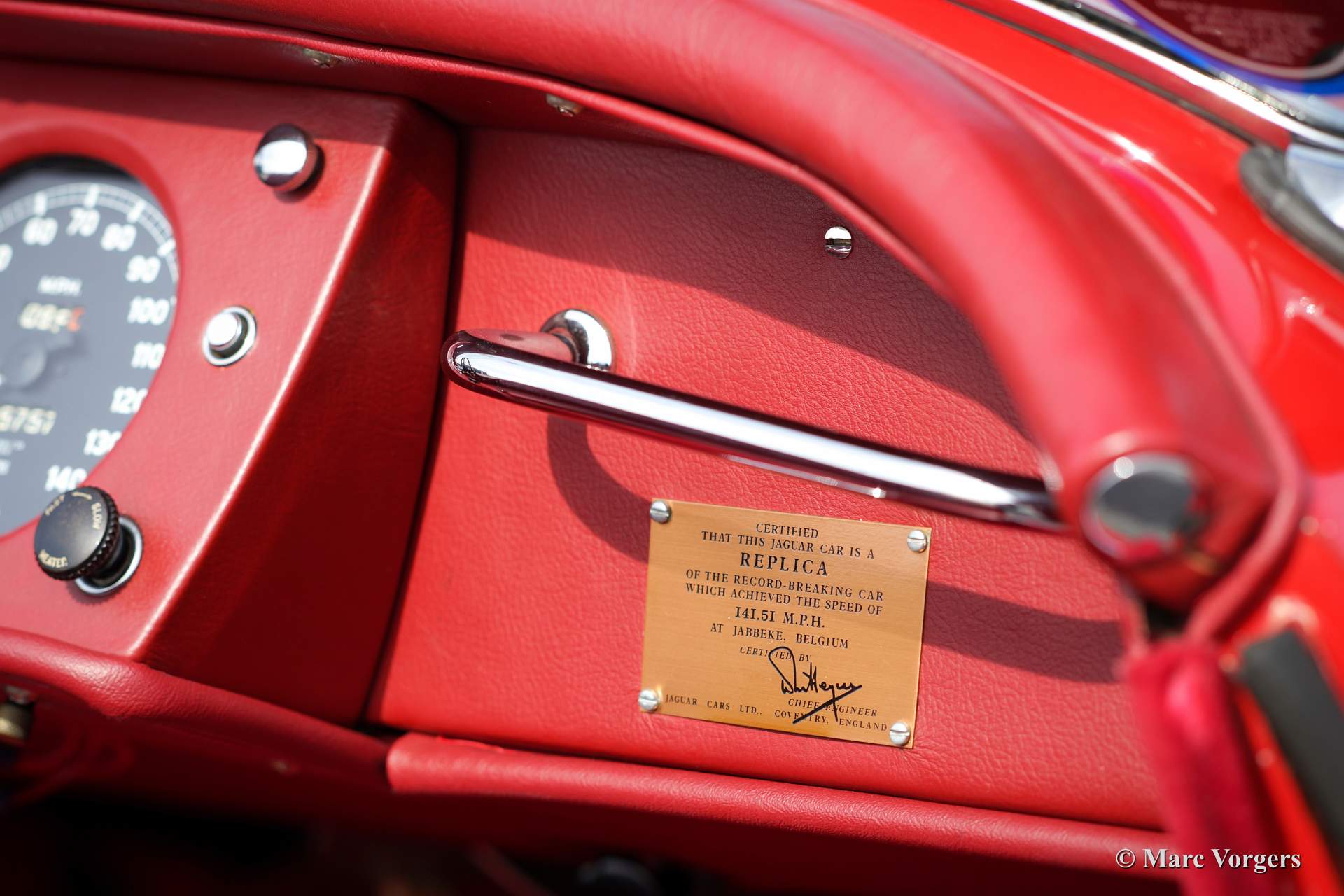 Jaguar XK 140 SE OTS (roadster), year 1956. Chassis number: S81178XXX, engine number: G5839-XX: ‘matching numbers’. Colour red with a red leather interior and red carpet. Beige soft top, tonneau cover and ‘side curtains’. This fabulous Jaguar XK 140 SE was extensively restored in the past. The engine was modified to run on lead free petrol. Only 3282 left hand drive XK 140 SE roadsters have been built. The car features chrome wire wheels, the C-type cylinder head and overdrive.