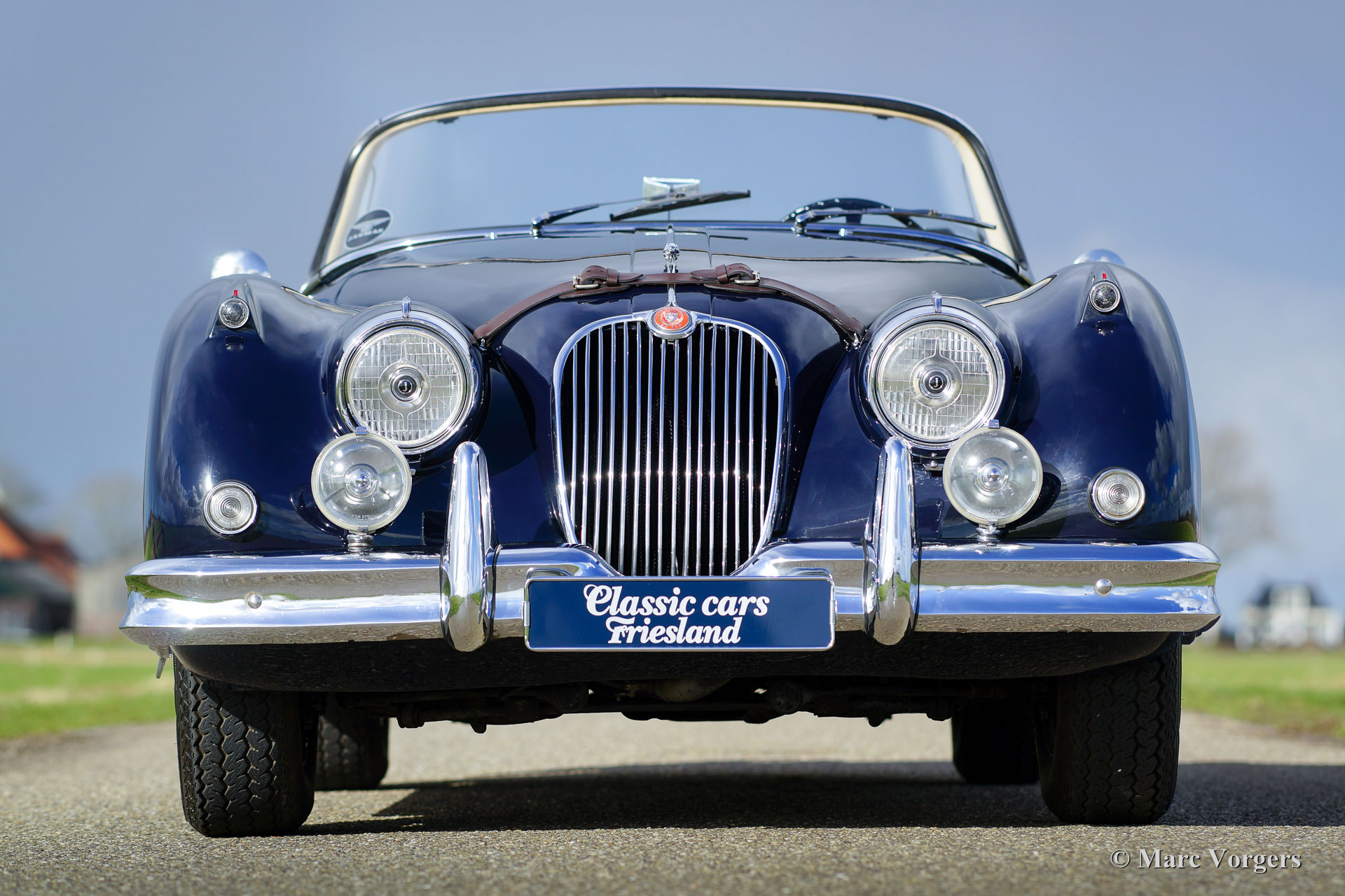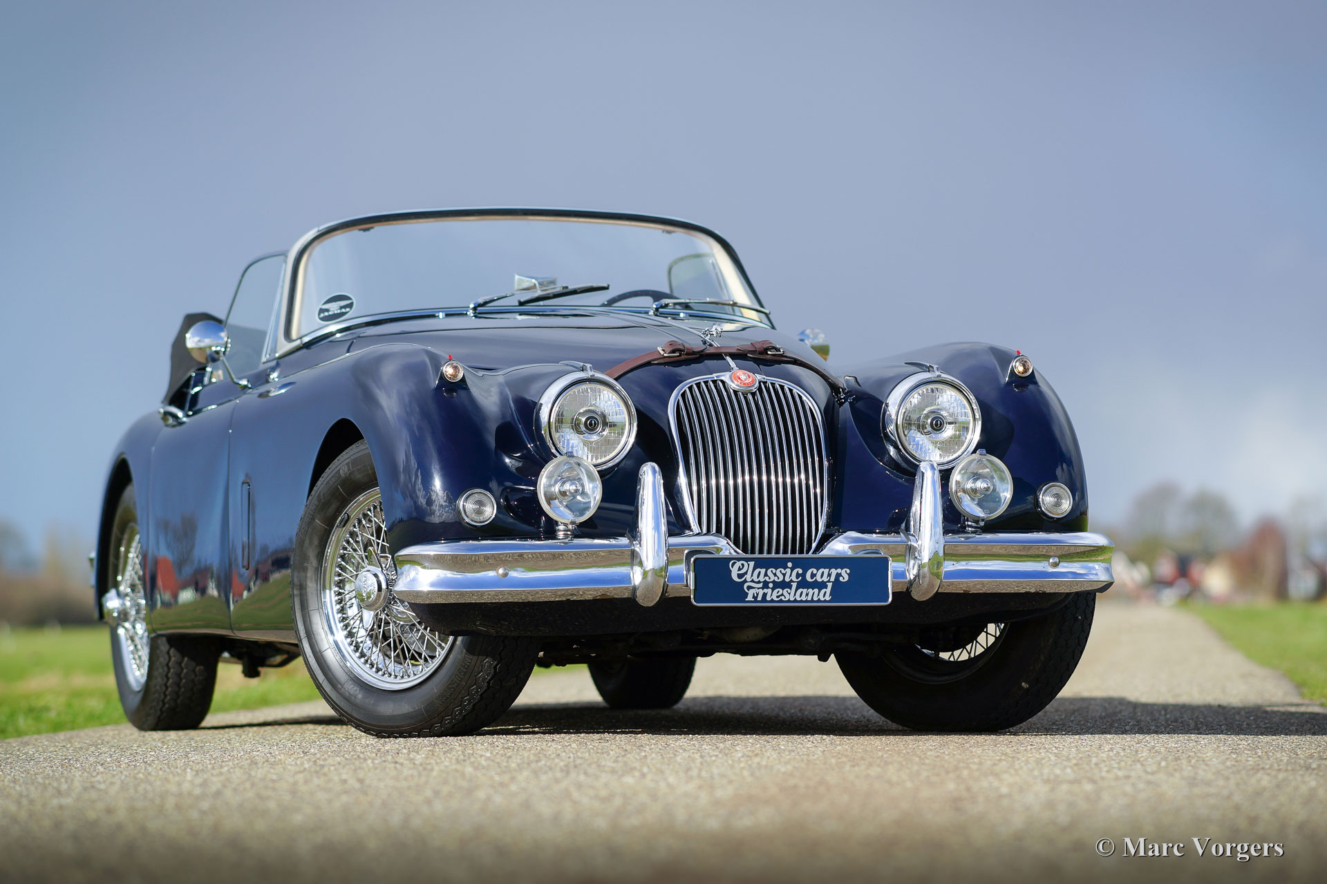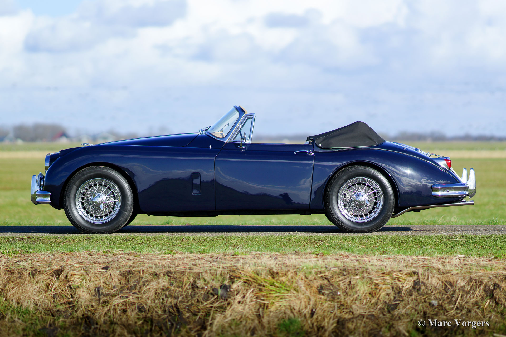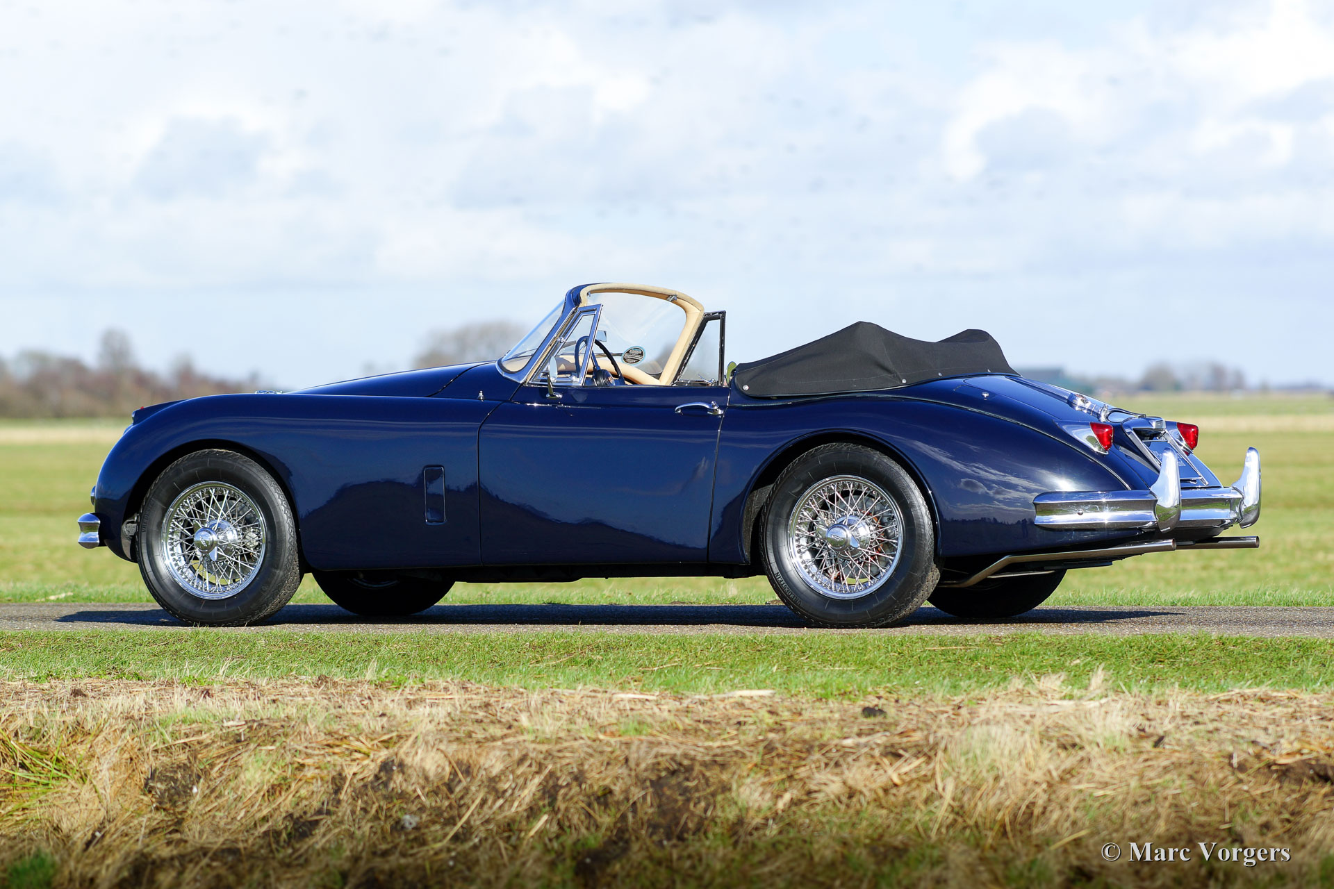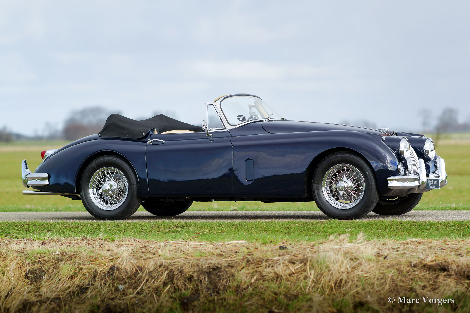 Jaguar XK 150 3.4 Litre DHC, year 1958. Colour dark blue with a beige leather interior and beige carpet. Black mohair hood and hood-cover. A Heritage certificate is present, this gorgeous XK 150 has ‘matching numbers’. The automobile was extensively and beautifully restored in the past; this XK 150 is in superb top condition and the car drives perfectly! This Jaguar XK 150 Drop Head Coupe (DHC) features electric power steering (EZ powersteering), a Getrag 5-speed gearbox, chrome wire wheels with Vredestein Sprint Classic tyres, a Stainless-Steel exhaust, a walnut dashboard and a walnut shifter knob. This is a beautifully restored example!