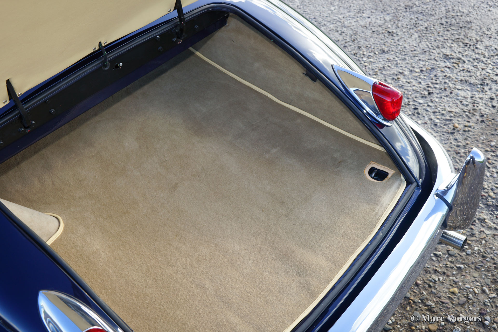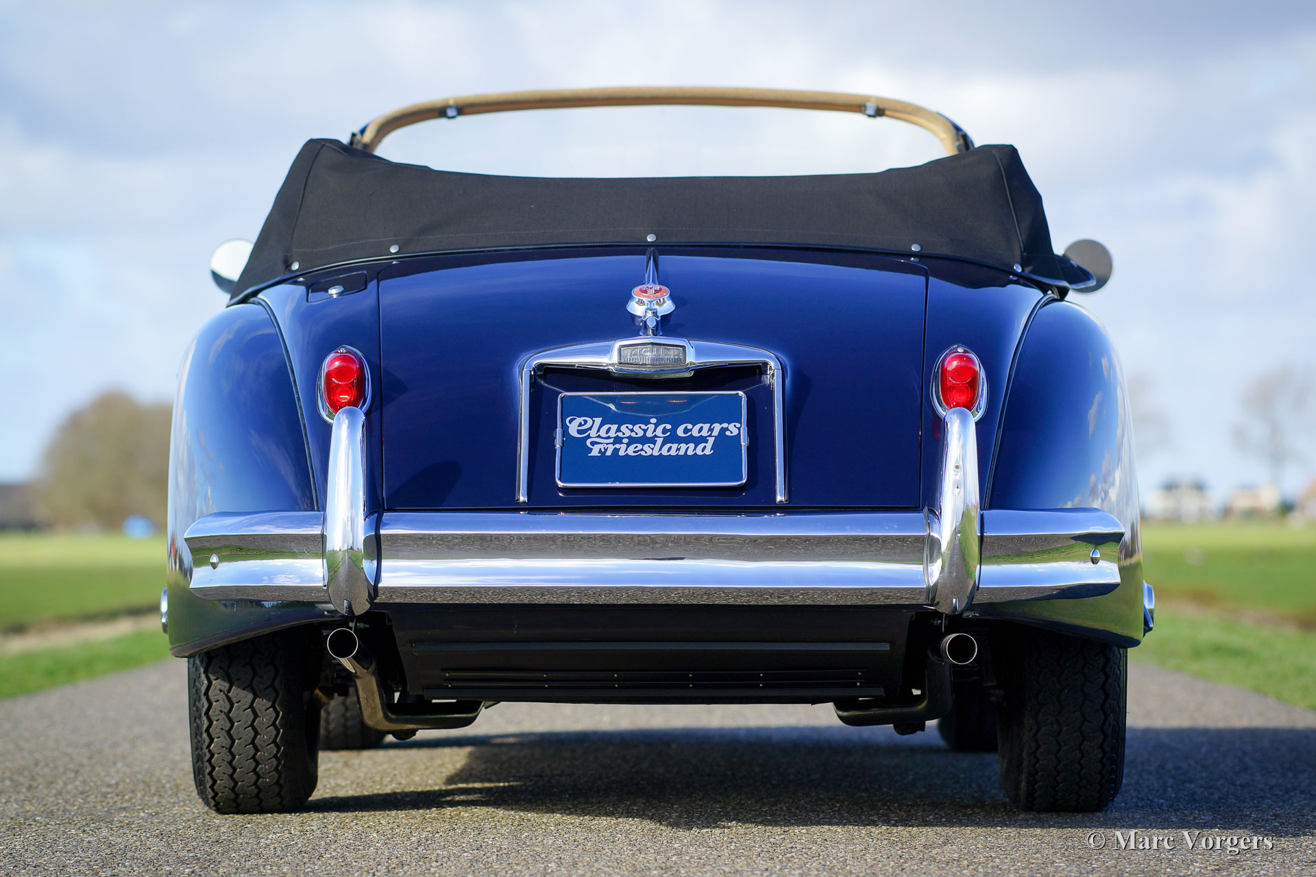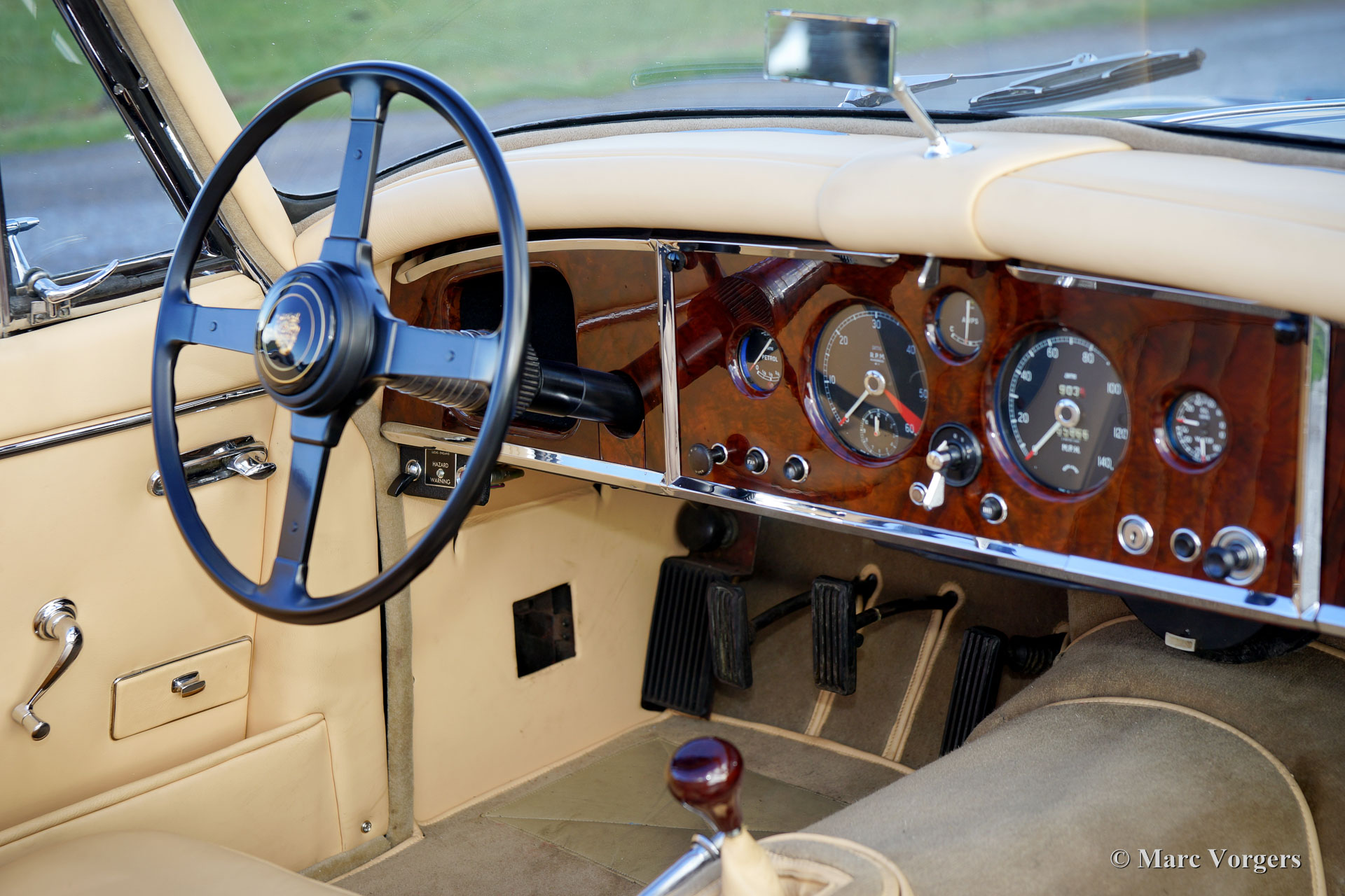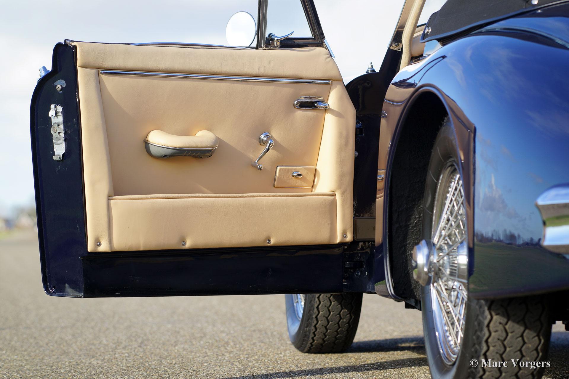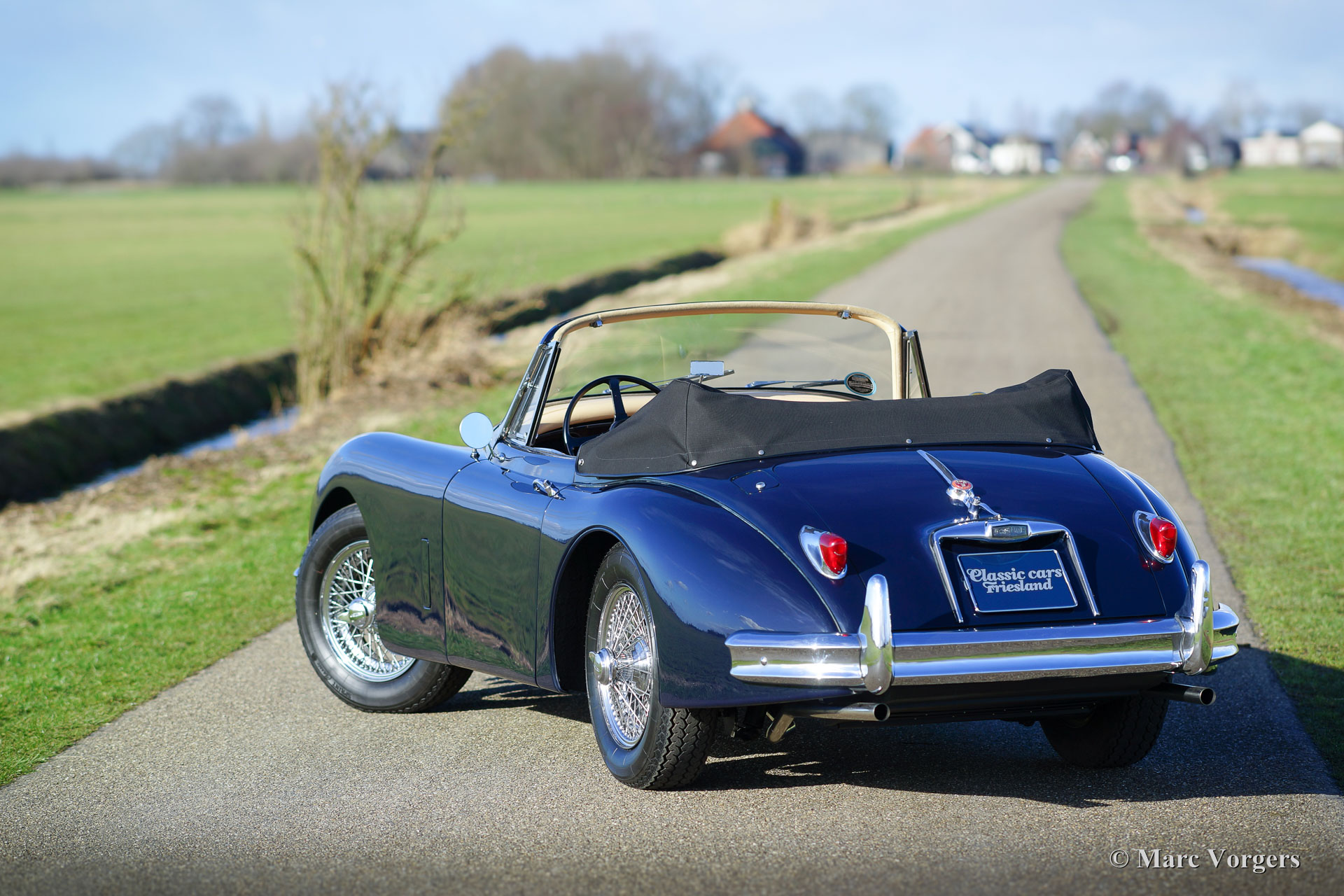 Jaguar XK 150 3.4 Litre DHC, year 1958. Colour dark blue with a beige leather interior and beige carpet. Black mohair hood and hood-cover. A Heritage certificate is present, this gorgeous XK 150 has ‘matching numbers’. The automobile was extensively and beautifully restored in the past; this XK 150 is in superb top condition and the car drives perfectly! This Jaguar XK 150 Drop Head Coupe (DHC) features electric power steering (EZ powersteering), a Getrag 5-speed gearbox, chrome wire wheels with Vredestein Sprint Classic tyres, a Stainless-Steel exhaust, a walnut dashboard and a walnut shifter knob. This is a beautifully restored example!