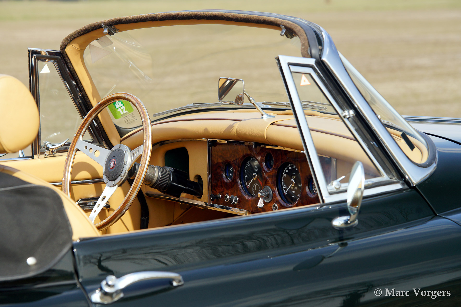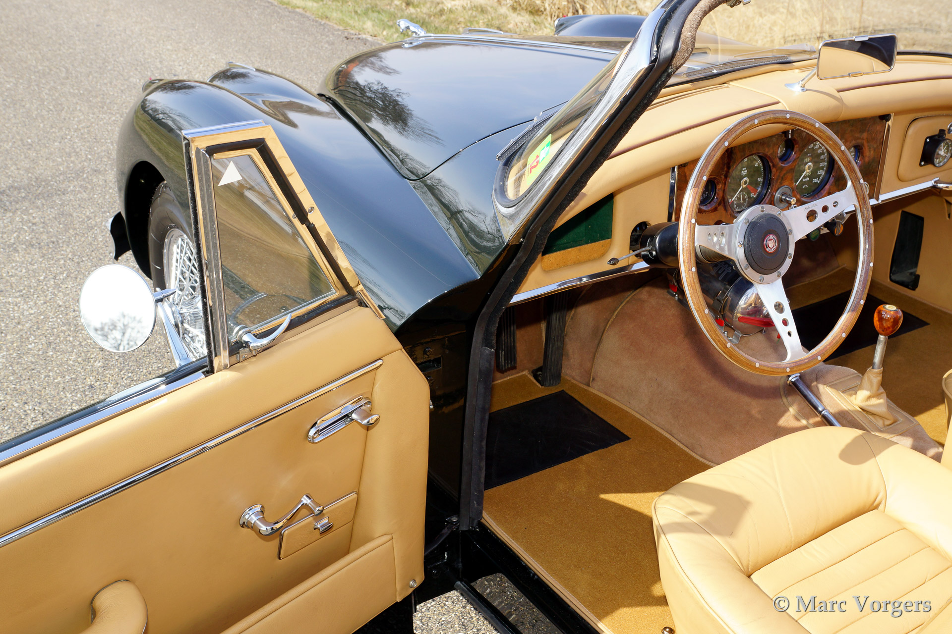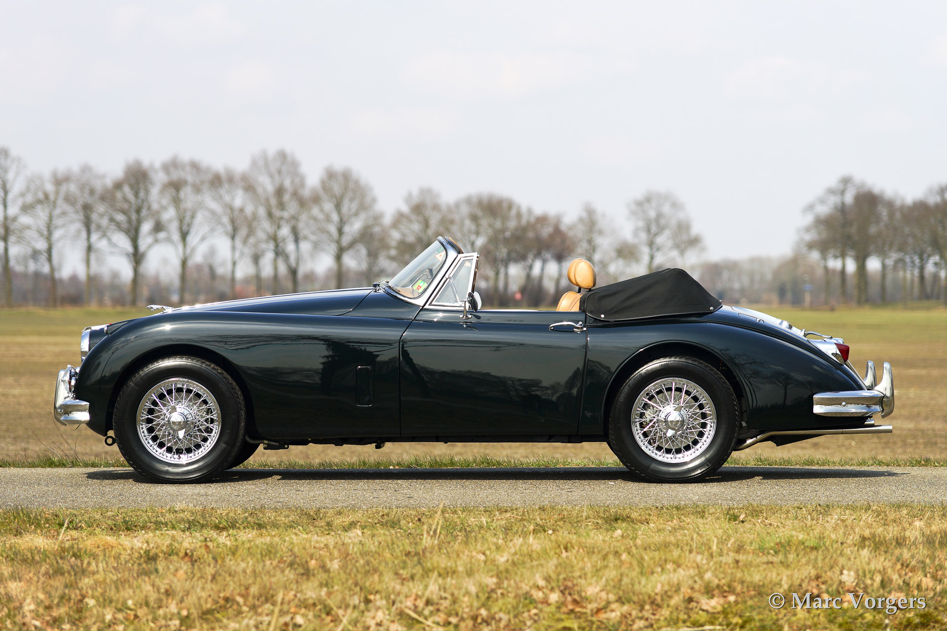 Jaguar XK 150 3.4 Litre DHC (Drophead Coupe), year 1961. Colour British Racing Green with a beige leather interior. Black mohair hood and hood cover. This very beautiful Jaguar XK Drophead Coupe was extensively and professionally restored in the past. The car features a bespoke interior with additional stowage space between the seats, special comfort seats and a sports steering wheel with wood rim. This to make the car a splendid companion for long (trans-European) travels in great style.