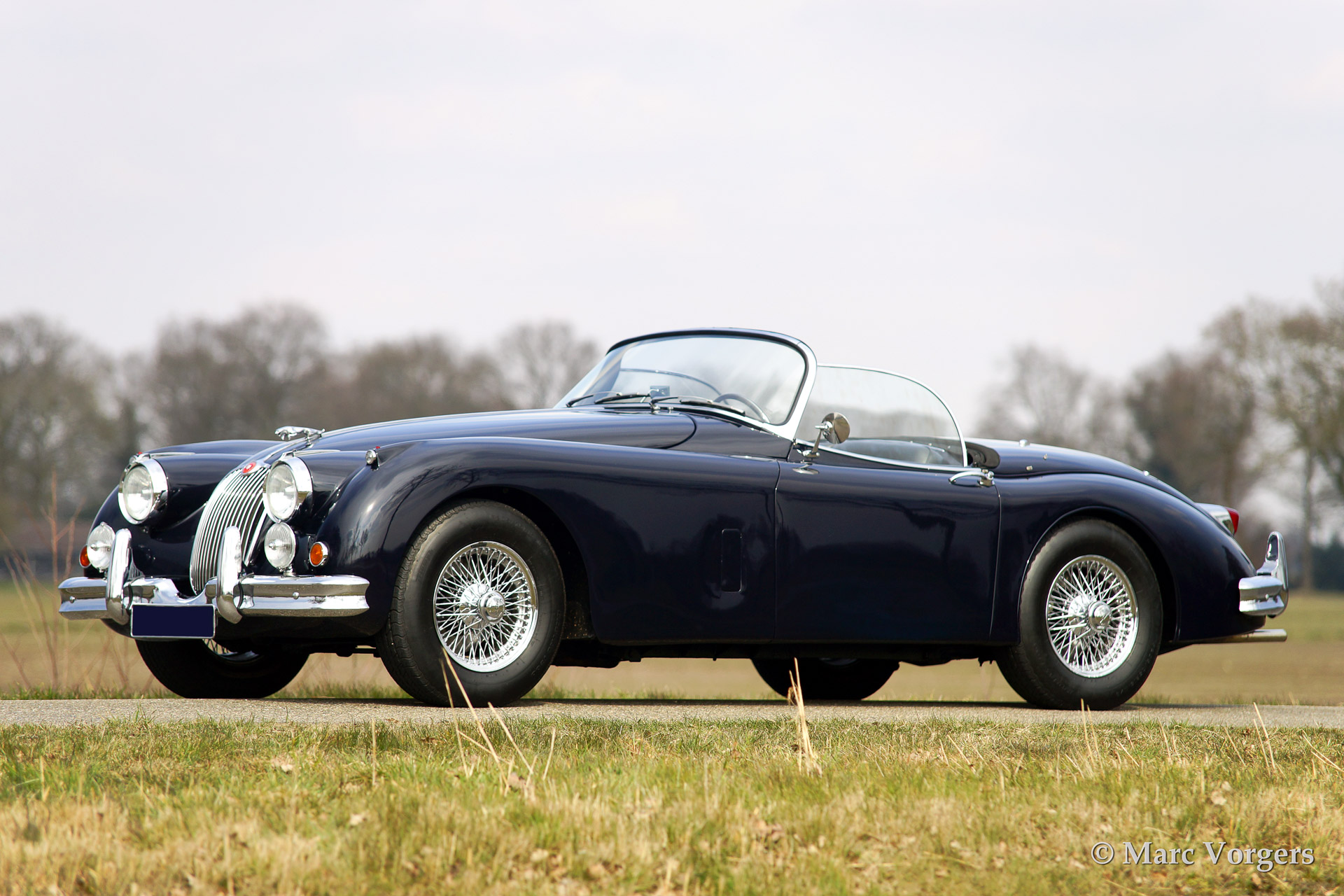 Jaguar XK 150 3.4 Litre OTS (Open Two Seater, also named roadster), year 1958. Colour dark blue with a black leather interior, black carpet and a dark blue mohair soft top. The automobile features chrome wire wheels and overdrive.
